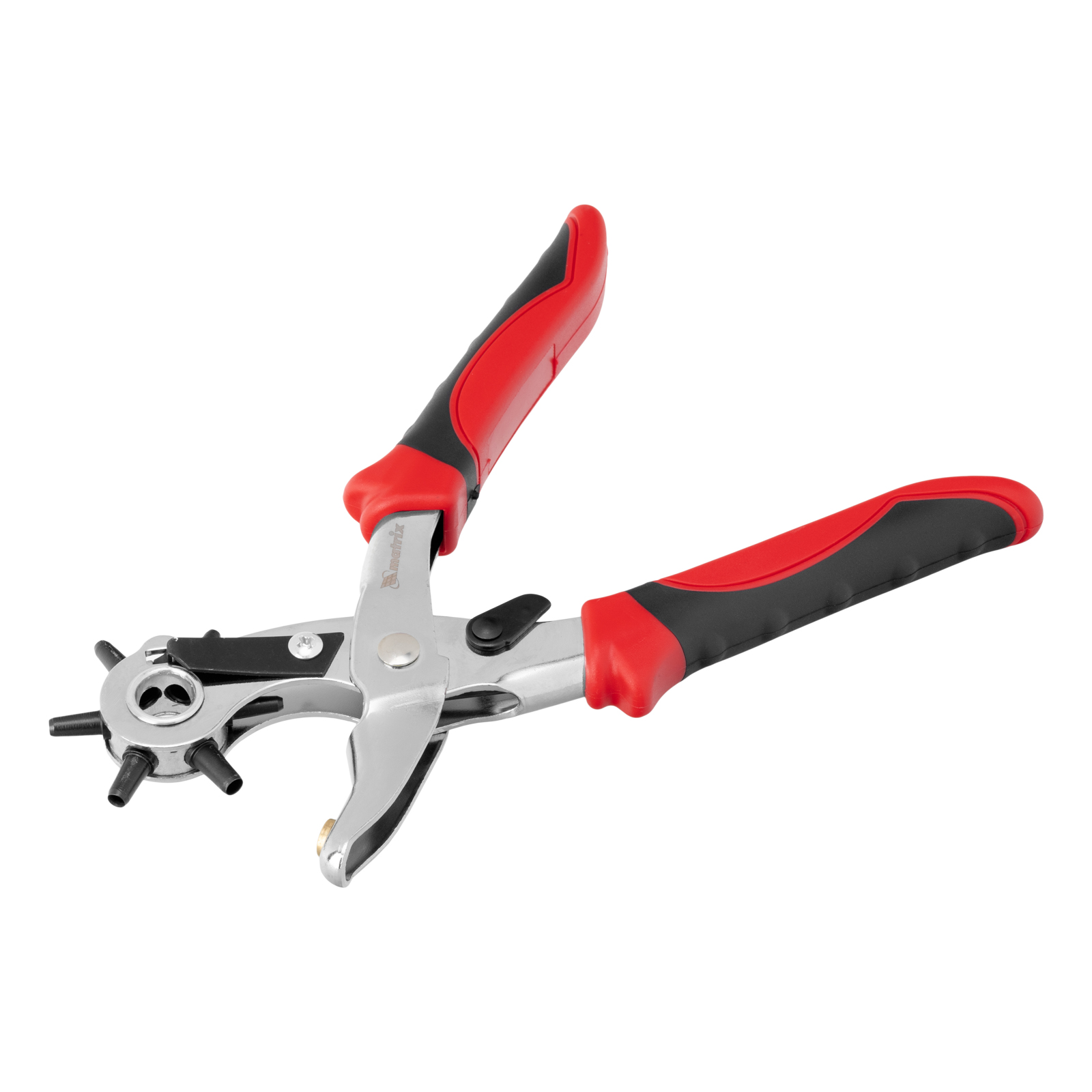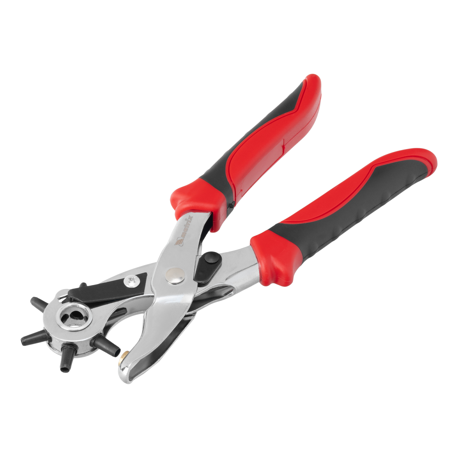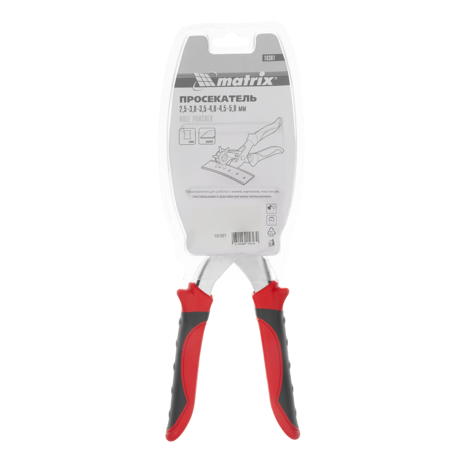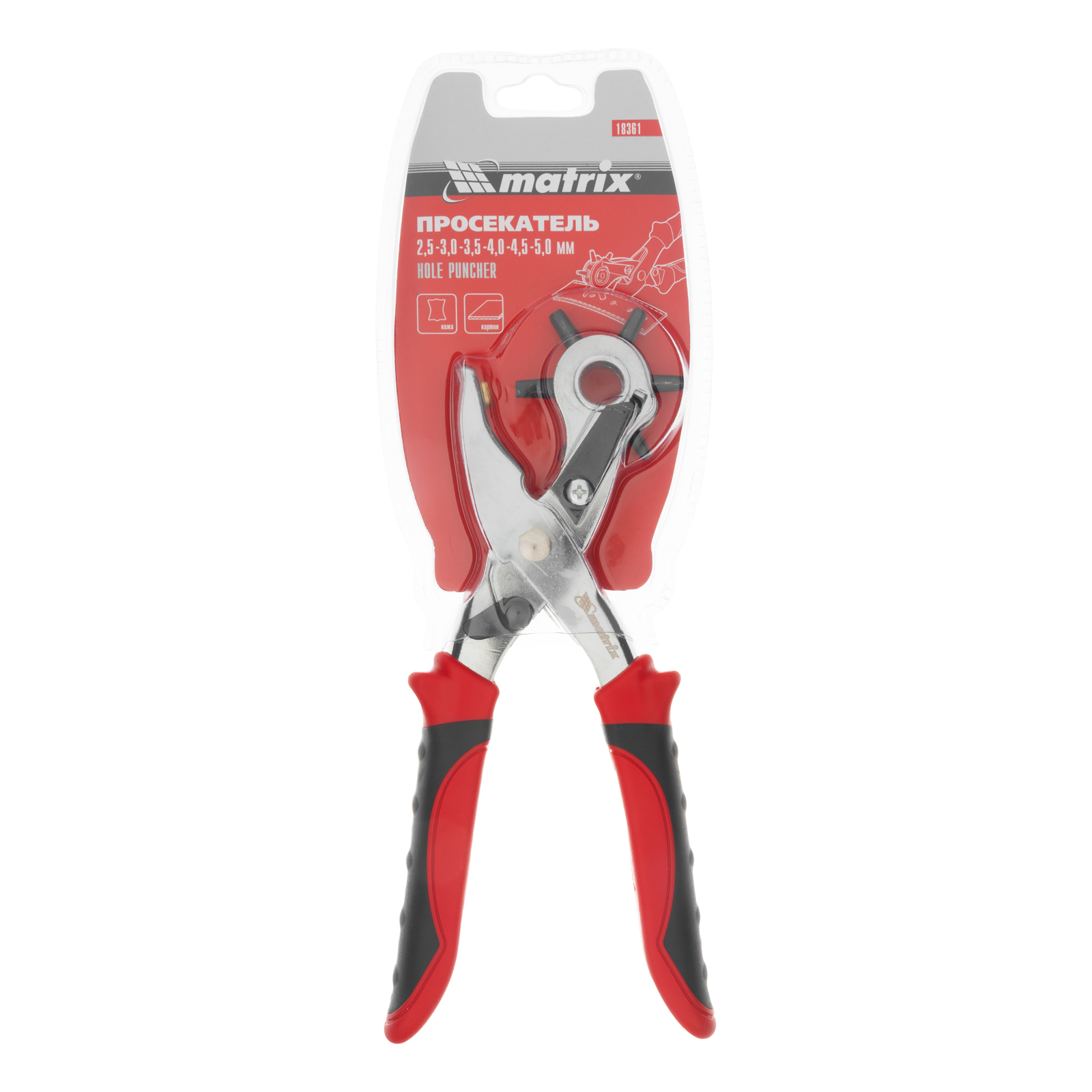 <p>Просекатель (дырокол) Matrix 18361 позволяет проделывать в коже и картоне отверстия диаметром 2,5, 3,0, 3,5, 4,0, 4,5 и 5,0 мм. Способен прокалывать неплотные изделия толщиной до 3 мм. Идеален для работы в мастерской и дома.</p><h2>Преимущества</h2><ul><li>Надежность — пробойники выполнены из стали 40 Cr (40 X), а наковальня — из латуни.</li><li>Антикоррозийная защита — на рабочие части нанесено никелевое покрытие.</li><li>Комфортная работа — двухкомпонентные рукоятки не выскальзывают из ладони.</li></ul>