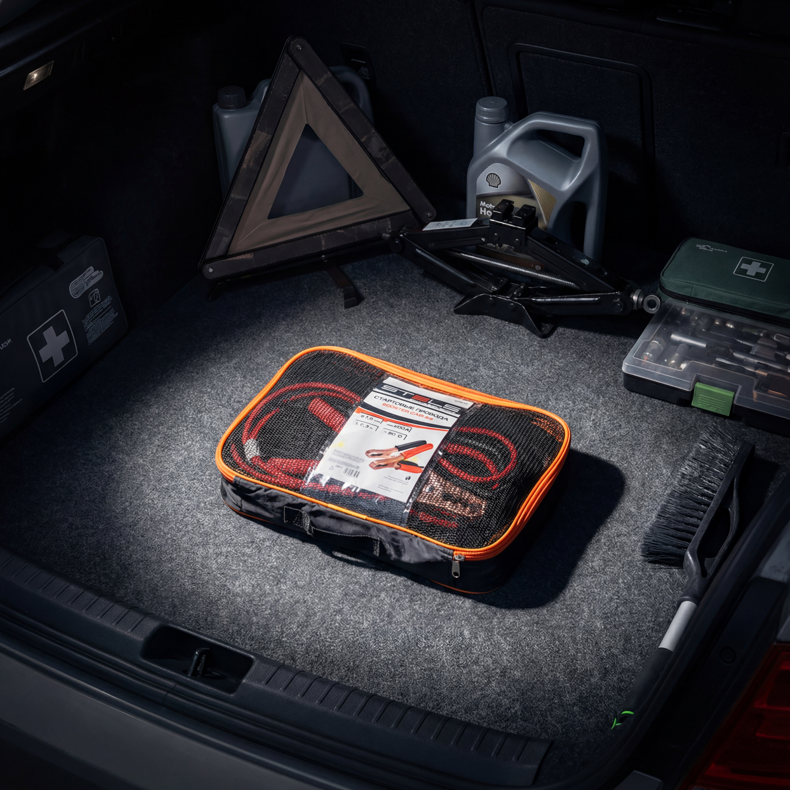 Стартовые провода Stels 55917 длиной 2,3 м, в сумке на молнии, рассчитаны на силу тока 200 А используются для «прикуривания» легковых и грузовых автомобилей, аккумуляторы которых разрядились по причине низкой окружающей температуры или длительного хранения. Допустимой силы тока 200 A достаточно для запуска стартеров большинства автомашин. Провода пригодятся автовладельцам