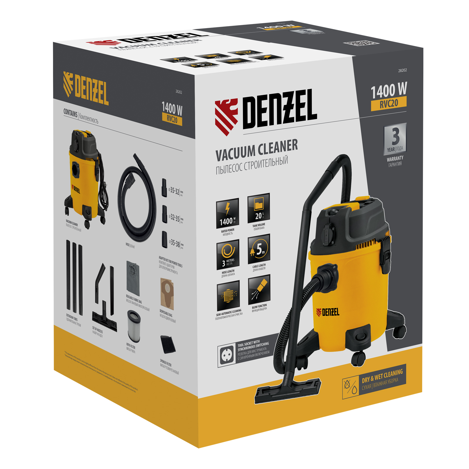 Пылесос строительный Denzel RVC20 28202 мощностью 1400 Вт, с баком объемом 20 л и шлангом длиной 3 м, оснащен розеткой с автосинхронизацией и предназначен для уборки бетонной, кирпичной пыли, опилок, стружки, также предусмотрена функция сбора воды. К пылесосу можно подключить электроинструмент, чтобы минимизировать количество пыли, образующейся в результате пиления, сверления, фрезерования. Техника используется во время проведения строительных и ремонтных работ, будет полезна для поддержания чистоты в мастерской, гараже, производственном помещении.