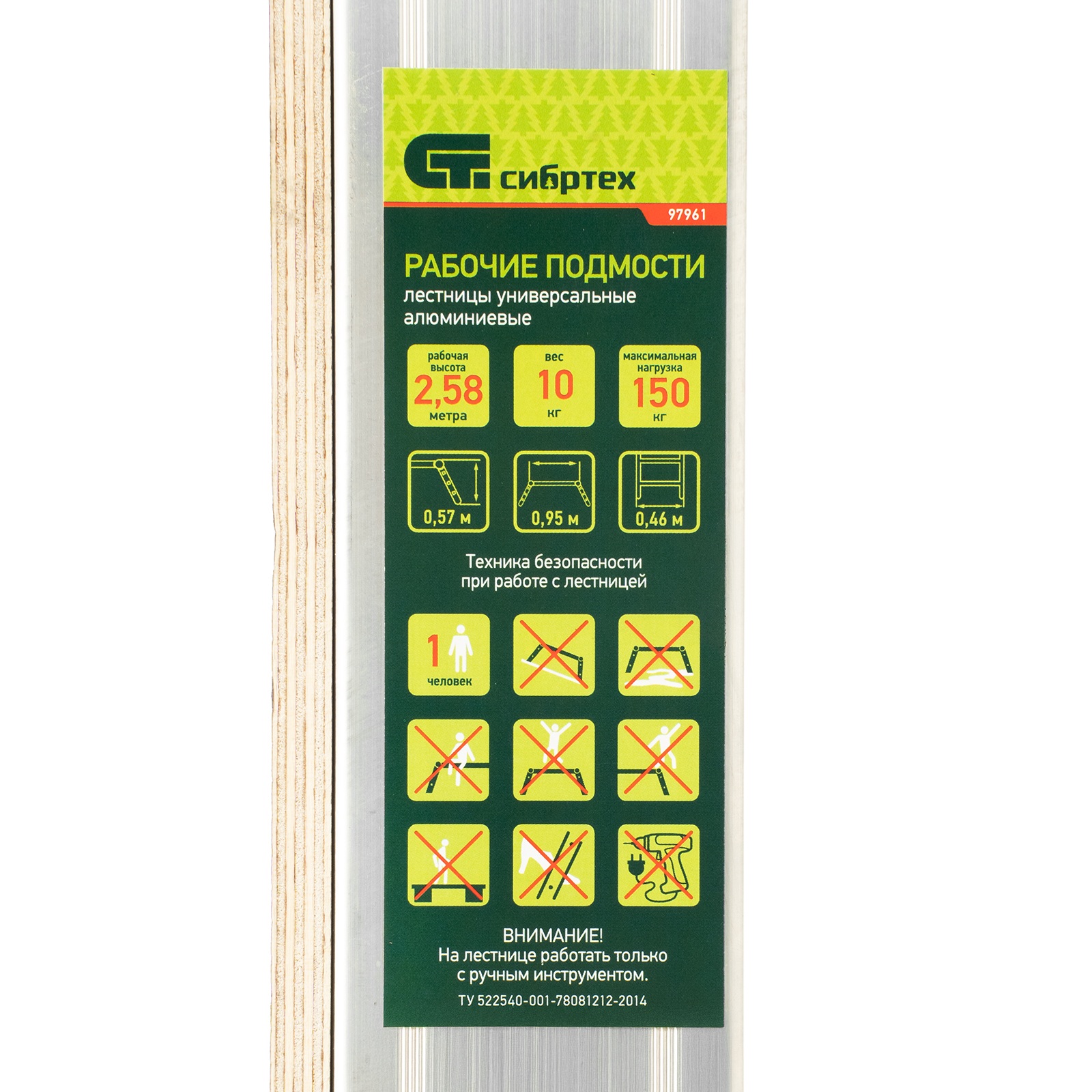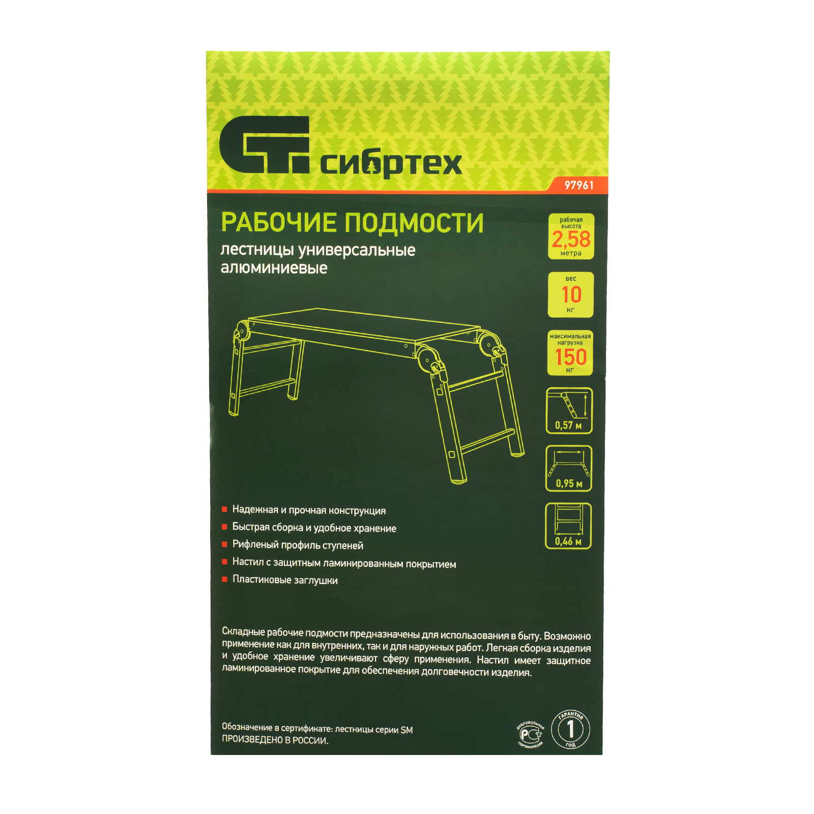 - Надежность — стойки и ступени изготовлены из прессованного алюминиевого профиля, рабочая площадка из антисептированной фанеры устойчива к воздействию микроорганизмов и насекомых.