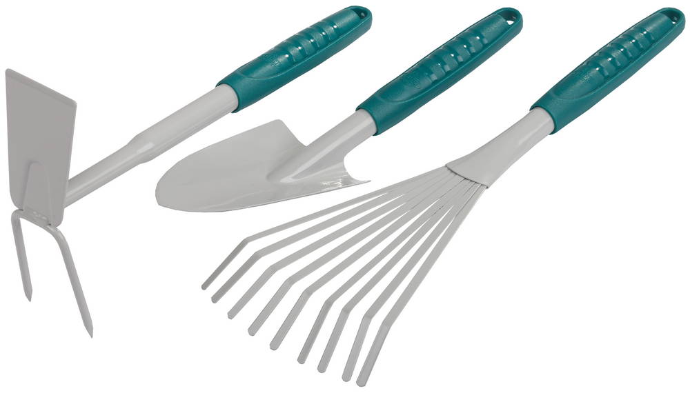 В набор включены наиболее популярные изделия - мотыжка с прямым лезвием и двумя зубцами, совок посадочный широкий, грабли веерные. Рабочие части инструментов изготовлены из высококачественной стали с антикоррозийным эпоксидным покрытием. Усиленное стальное полотно и ударопрочная ручка гарантируют практичность и долгий срок службы изделий.