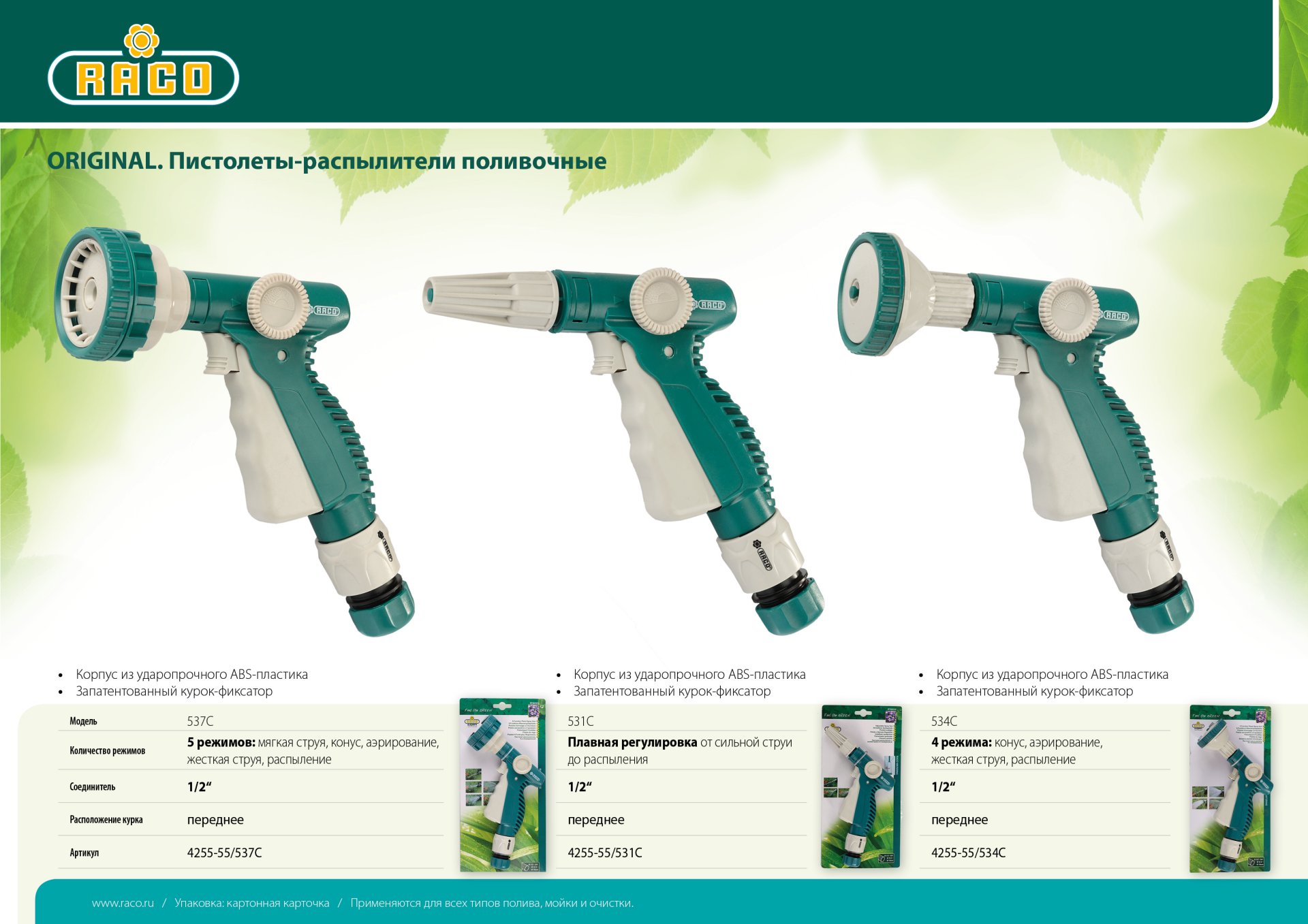 Поливочные пистолеты-распылители RACO Original являются самыми распространёнными и доступными. Изготовлены из надёжных материалов, обладают высоким уровнем качества.