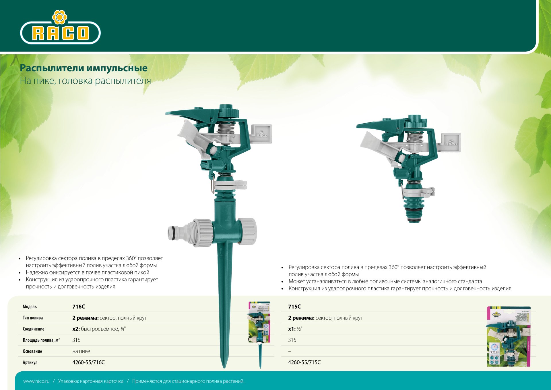 Стационарные распылители RACO обладают высоким уровнем качества, изготовлены из качественных материалов. Надёжны в работе, служат долго, исключительно удобны в использовании. Обеспечивают простое и качественное подключение к поливочной системе. Широкий ассортимент моделей для всех видов полива.
