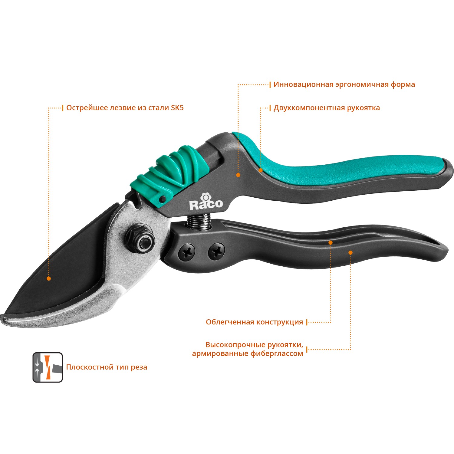 Высокое качество и лёгкость реза, удобство в работе и продолжительный срок службы секаторов RACO достигается за счёт современных материалов и технологий.