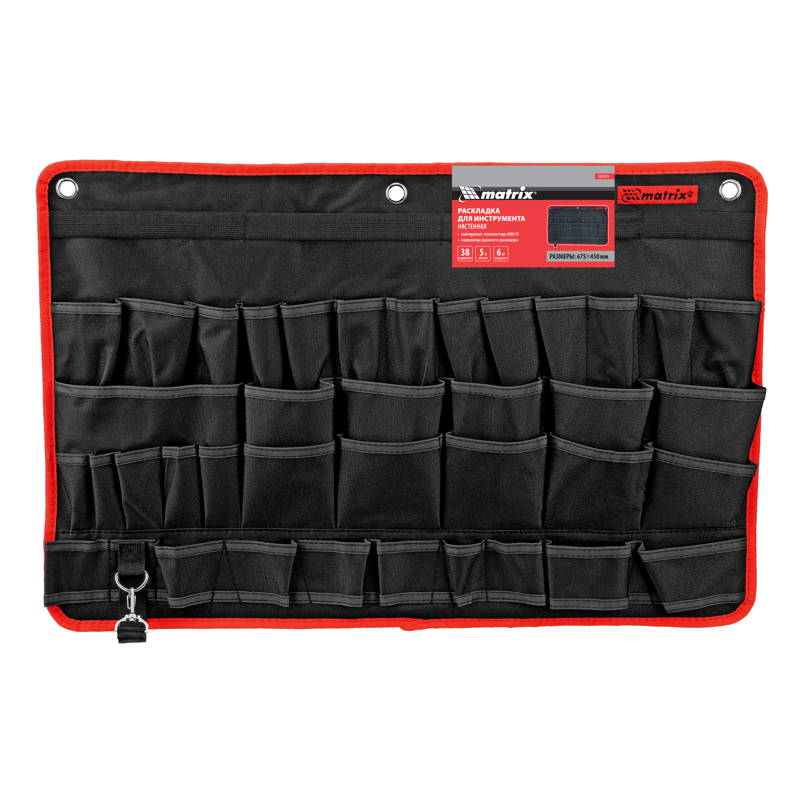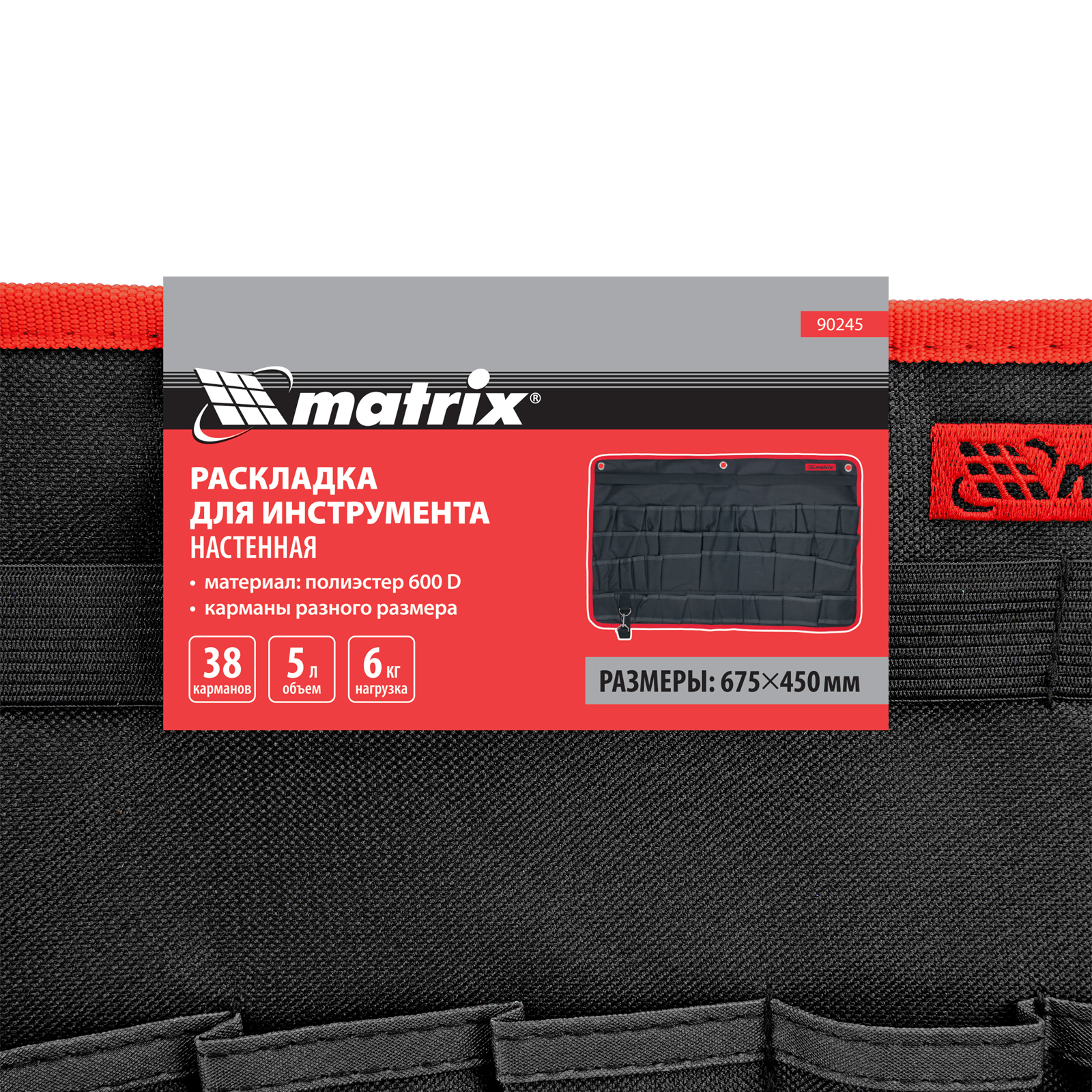 Настенная раскладка для инструмента Matrix 90245 размером 675 х 450 мм предназначена для хранения слесарных, монтажных и других принадлежностей. Благодаря ей все инструменты будут на своих местах и не потеряются. Разместить раскладку очень просто — она вешается на стену при помощи установленных в материале люверсов. Будет полезна дома, на даче и в гараже.