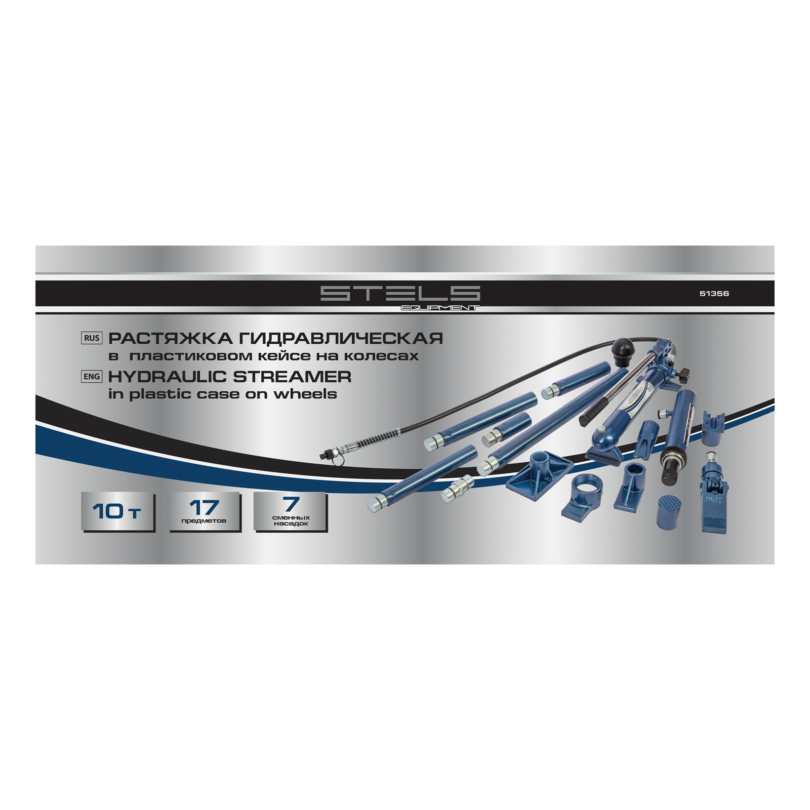 <p>Гидравлическая растяжка Stels 51356, рассчитанная на усилие до 10 т, — компактный набор в пластиковом кейсе на колесах, включающий 17 предметов — цилиндр, гидронасос, адаптер, удлинители, опорную площадку и 7 сменных насадок. Ее используют для рихтовки металлических конструкций и проведения кузовного ремонта. Растяжка эффективно восстанавливает геометрию проемов автомобильных окон и дверей, а также больших участков кузова. Пригодится в автосервисе, будет полезна в гараже.</p><h2>Преимущества</h2><ul><li>Прочность — стальные элементы комплекта выдерживают повышенные нагрузки.</li><li>Решение широкого спектра задач — удлинители позволяют увеличить длину растяжки, при помощи фигурных насадок можно воздействовать на поверхности разных форм, а также на труднодоступные участки.</li><li>Удобное хранение и транспортировка — набор упакован в прочный пластиковый кейс с ложементом и колесами.</li></ul>