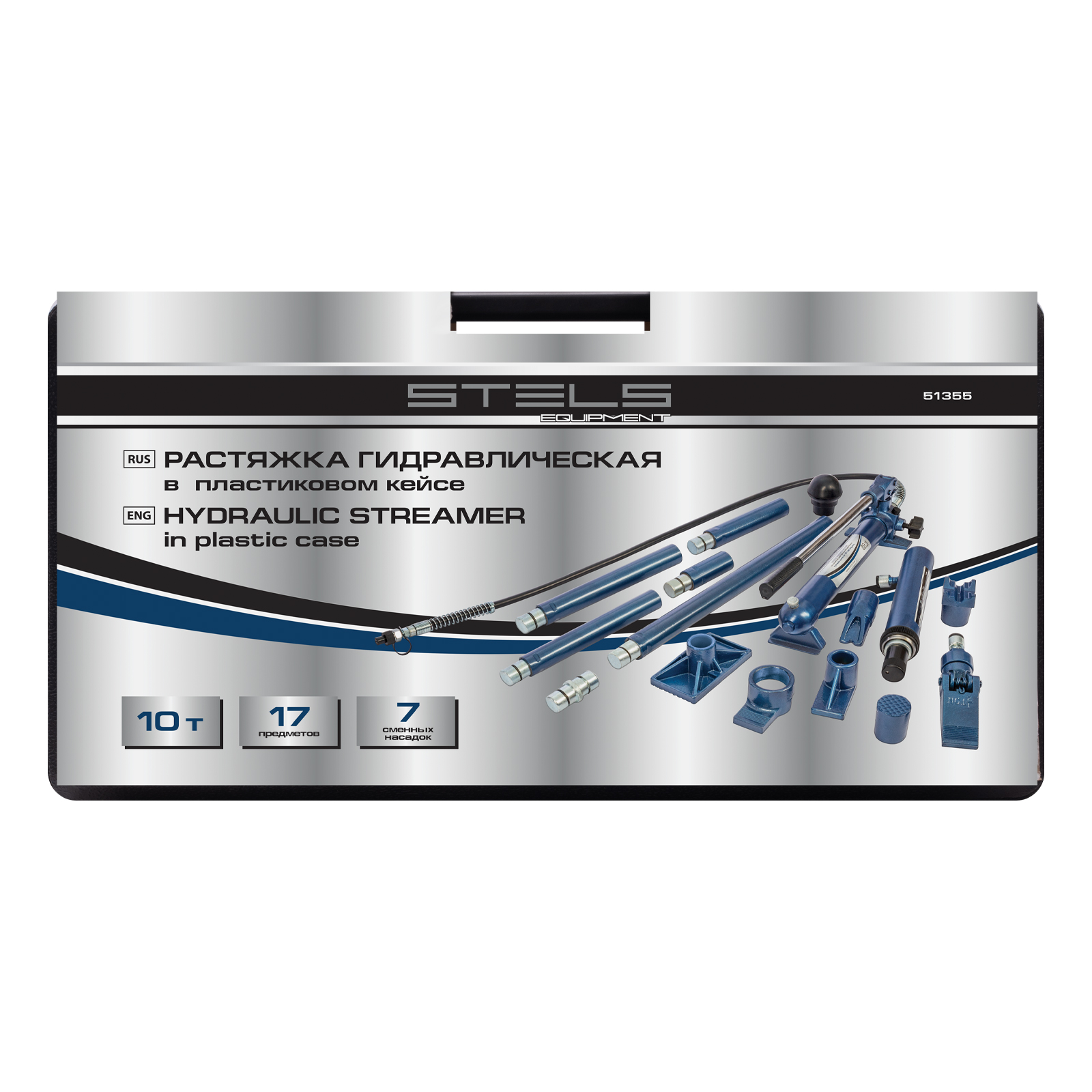 <p>Гидравлическая растяжка Stels 51355, рассчитанная на усилие до 10 т, — компактный набор в пластиковом кейсе, включающий 17 предметов: цилиндр, гидронасос, адаптер, удлинители, основание и 7 сменных насадок. Его используют для проведения кузовного ремонта и рихтовки металлических конструкций. Растяжка удобна для восстановления геометрии проемов автомобильных дверей и окон, а также значительных по площади участков кузова. Комплект пригодится в автосервисе, а также для работы в гараже.</p><h2>Преимущества</h2><ul><li>Надежность — все элементы изготовлены из прочной стали и выдерживают повышенные нагрузки.</li><li>Функциональность — удлинители позволяют увеличить длину растяжки.</li><li>Работа с поверхностями разных форм и в труднодоступных местах — в набор входят фигурные насадки.</li><li>Удобное хранение и транспортировка — набор поставляется в пластиковом кейсе с ложементом.</li></ul>