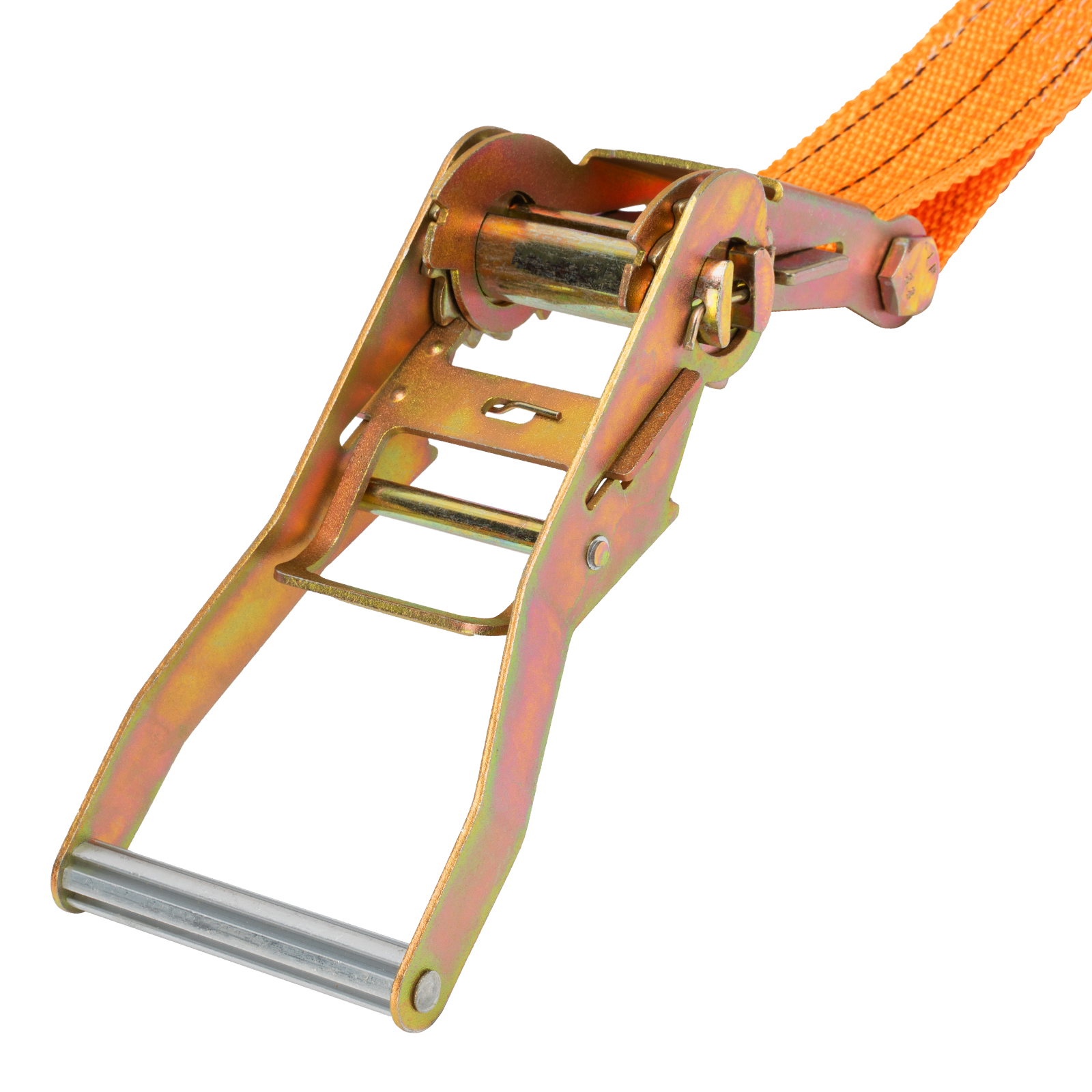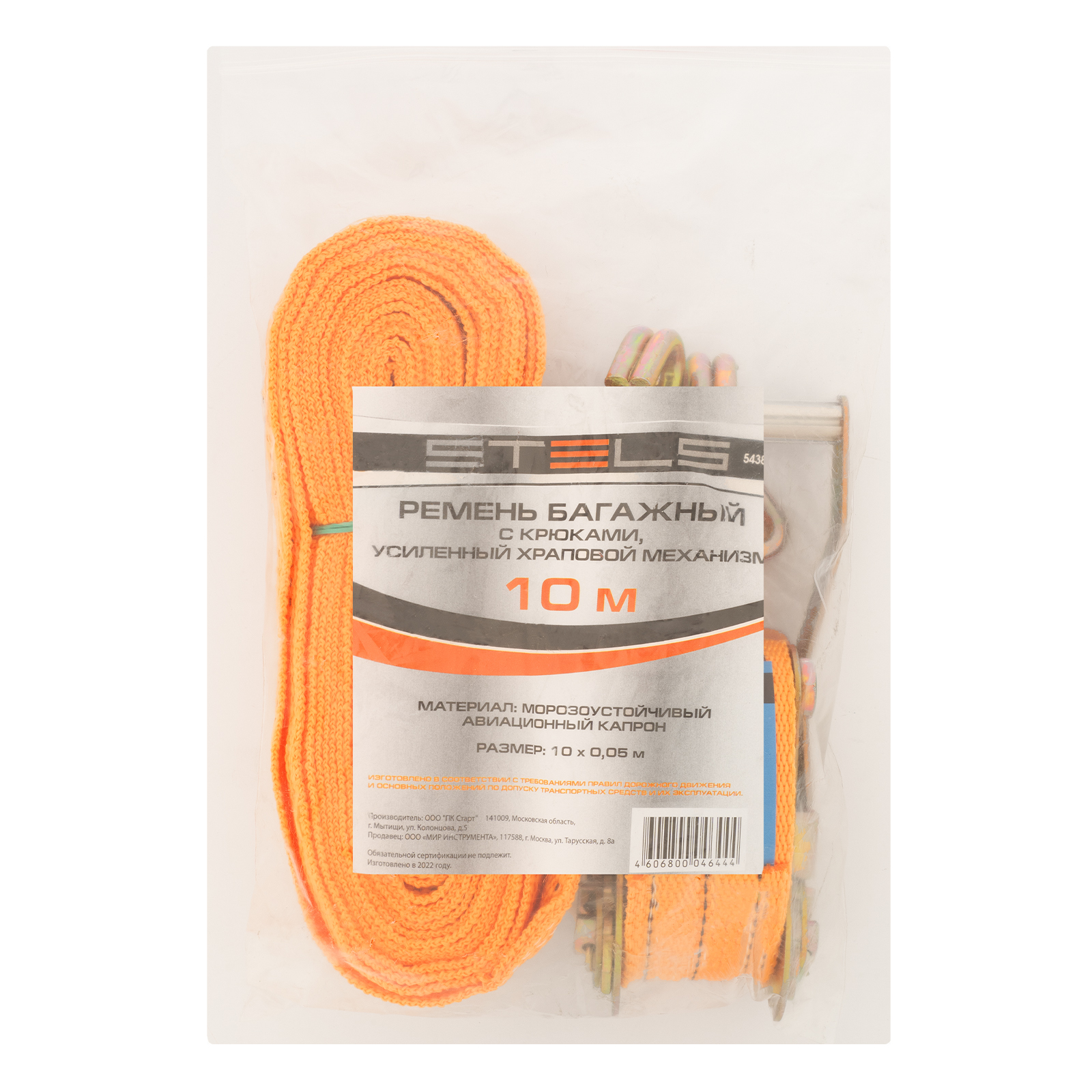 Багажный ремень с крюками Stels 54385 шириной 5 см и длиной 10 м, с храповым механизмом, предназначен для фиксации грузов на решетчатых конструкциях, например, открытых автомобильных багажниках, а также в прицепах. Пригодится для транспортировки различных предметов.