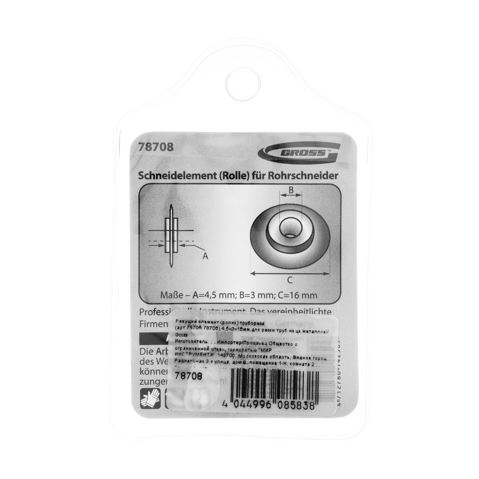 Режущий элемент (ролик) Gross 78708 размером 4,5 х 3 х 16 мм устанавливается на труборезы Gross 78705 и 78706 для резки труб из цветных металлов. Используется в качестве основного или запасного режущего элемента.