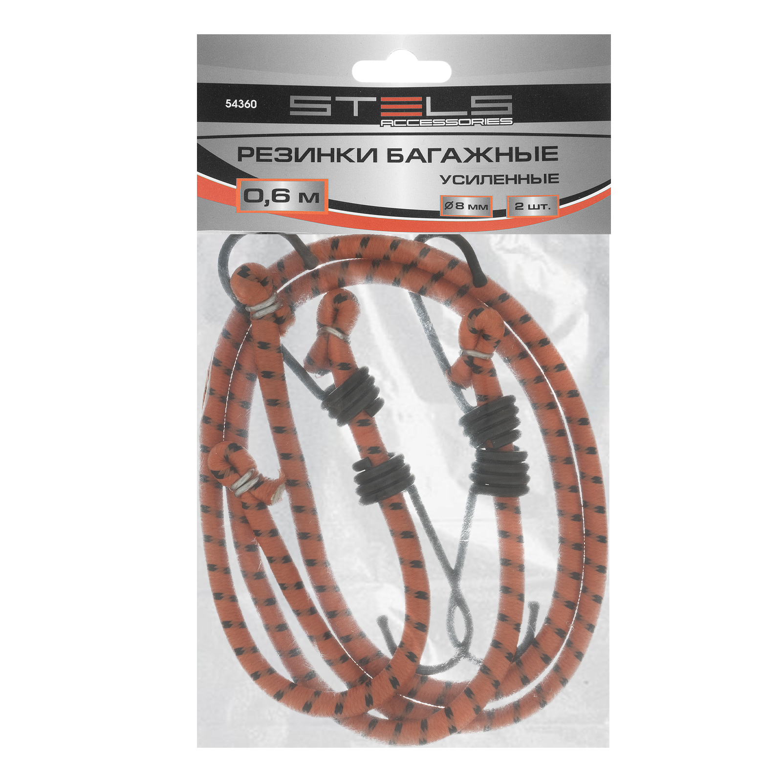Усиленные багажные резинки Stels 54360, 2 шт. длиной по 600 мм, используются для перевозки грузов. С их помощью можно закрепить различные предметы в прицепе или багажнике на крыше легковой автомашины. Жгуты толщиной 8 мм изготовлены из резины с добавлением латекса, поэтому обладают высокой эластичностью и прочностью. Будут полезны автовладельцам.