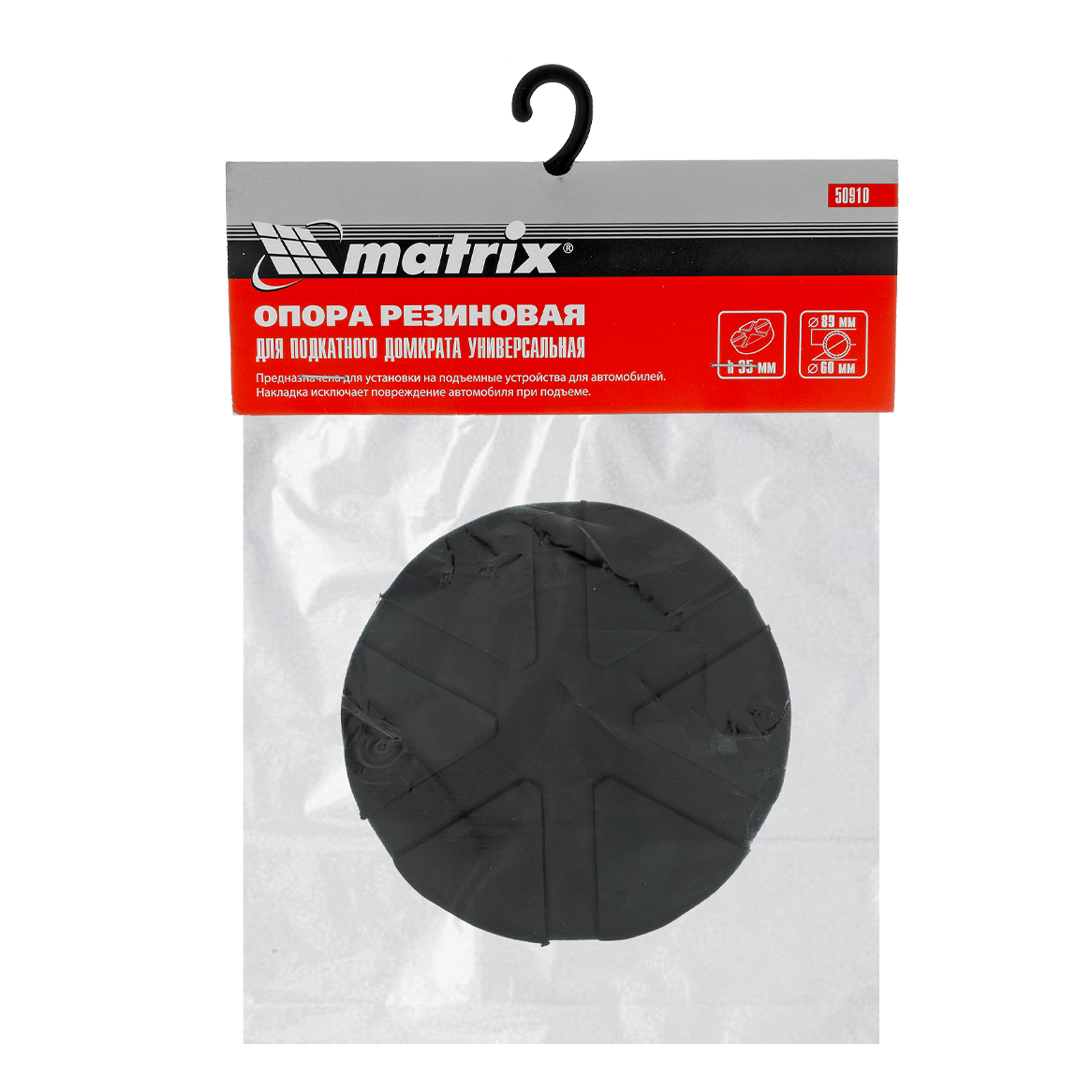 Резиновая опора Matrix 50910, с верхним диаметром 89 мм и нижним диаметром 60 мм, толщиной 35 мм, используется в качестве смягчающей накладки на подкатной домкрат. Снижает риск появления вмятин, царапин и сколов краски на кузове автомобиля, что позволяет произвести его аккуратный подъем. Также защищает от повреждений верхнюю опору домкрата.