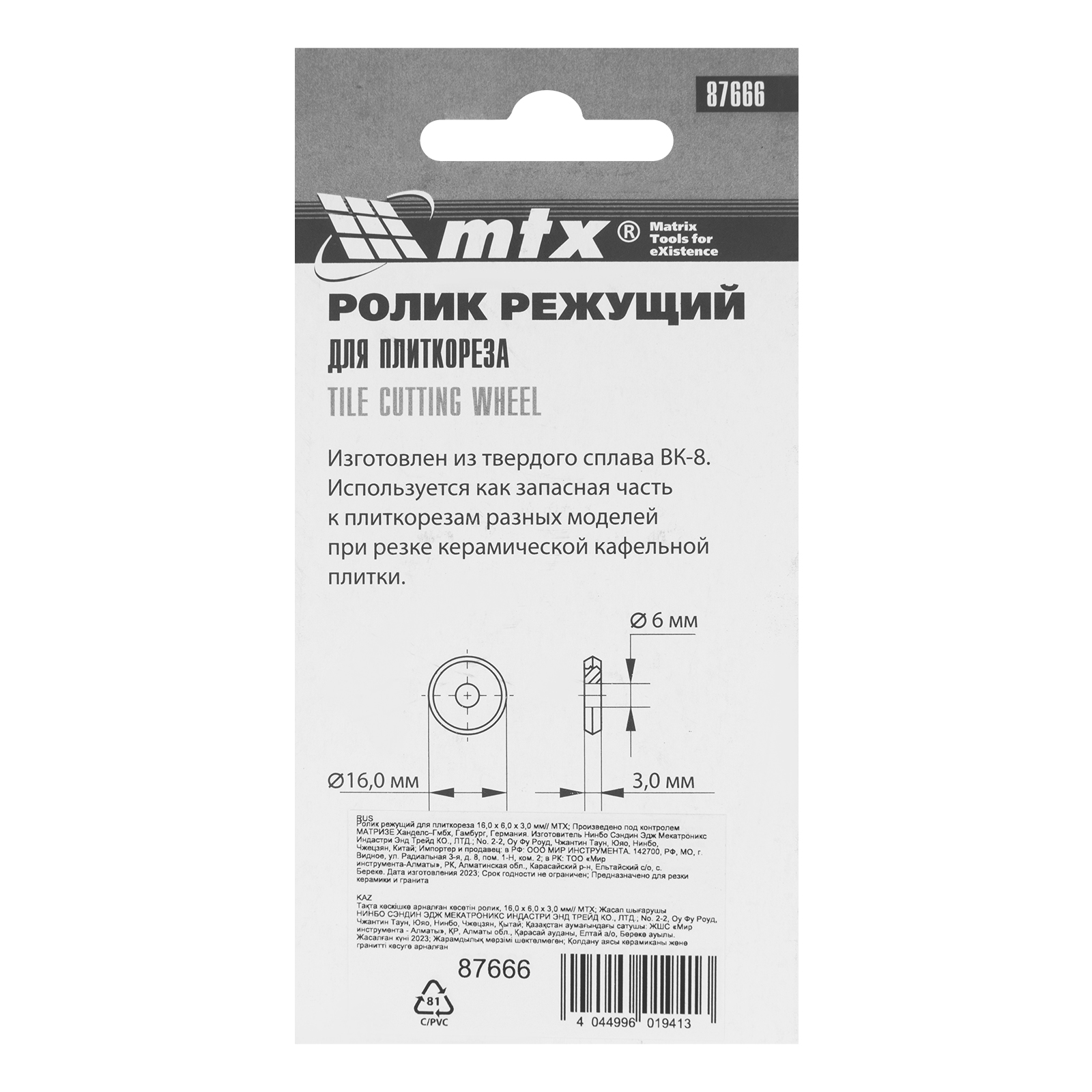 Режущий ролик MTX 87666 размером 16,0 х 6,0 х 3,0 мм — сменный элемент для плиткорезов MTX 87653, 87656 и 87658. Благодаря качественной заточке быстро и точно режет керамическую плитку любого типа.
