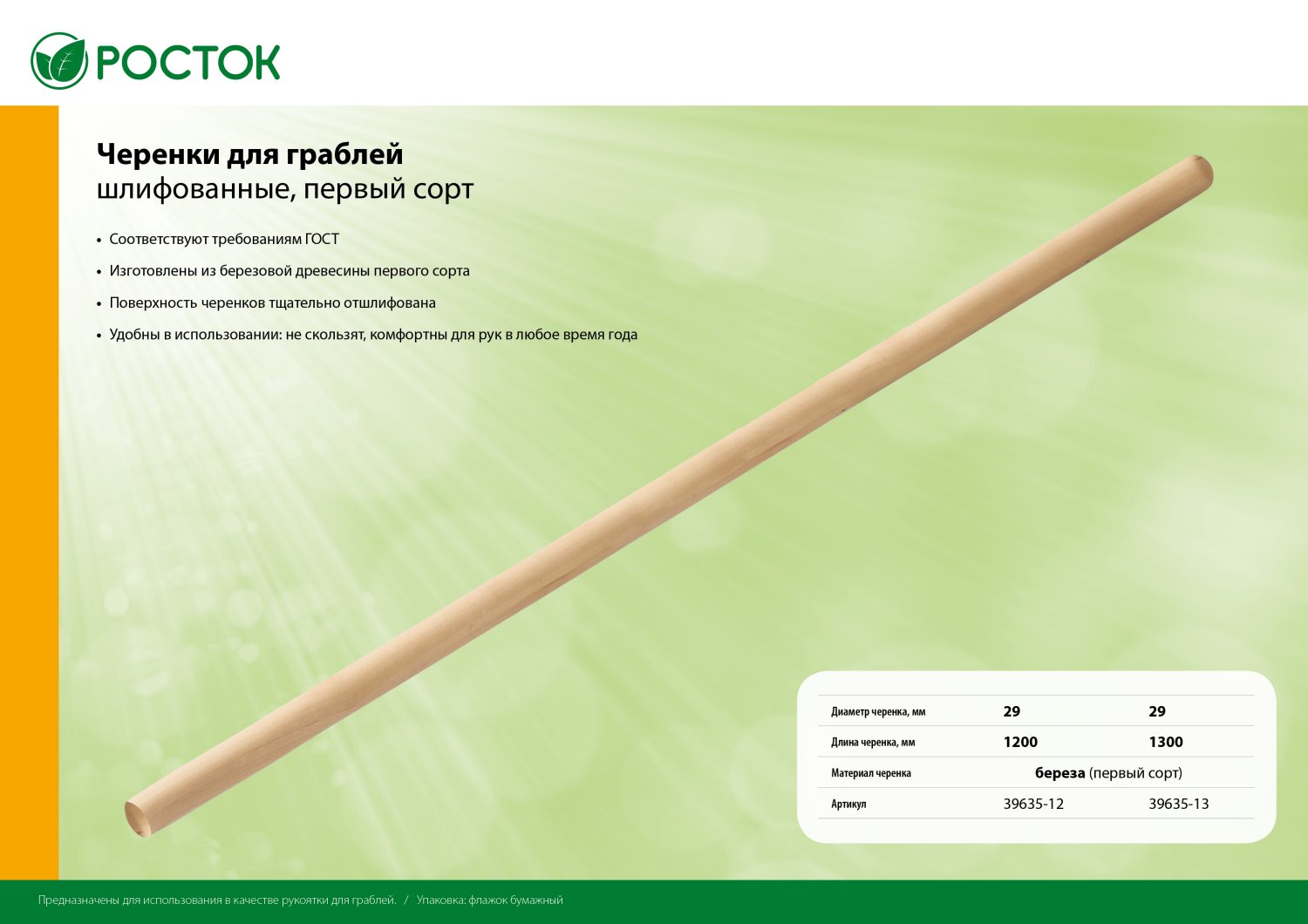 РОСТОК d 29 мм х 1200 мм, шлифованный, дерево первый сорт, черенок для грабель (39635-12)