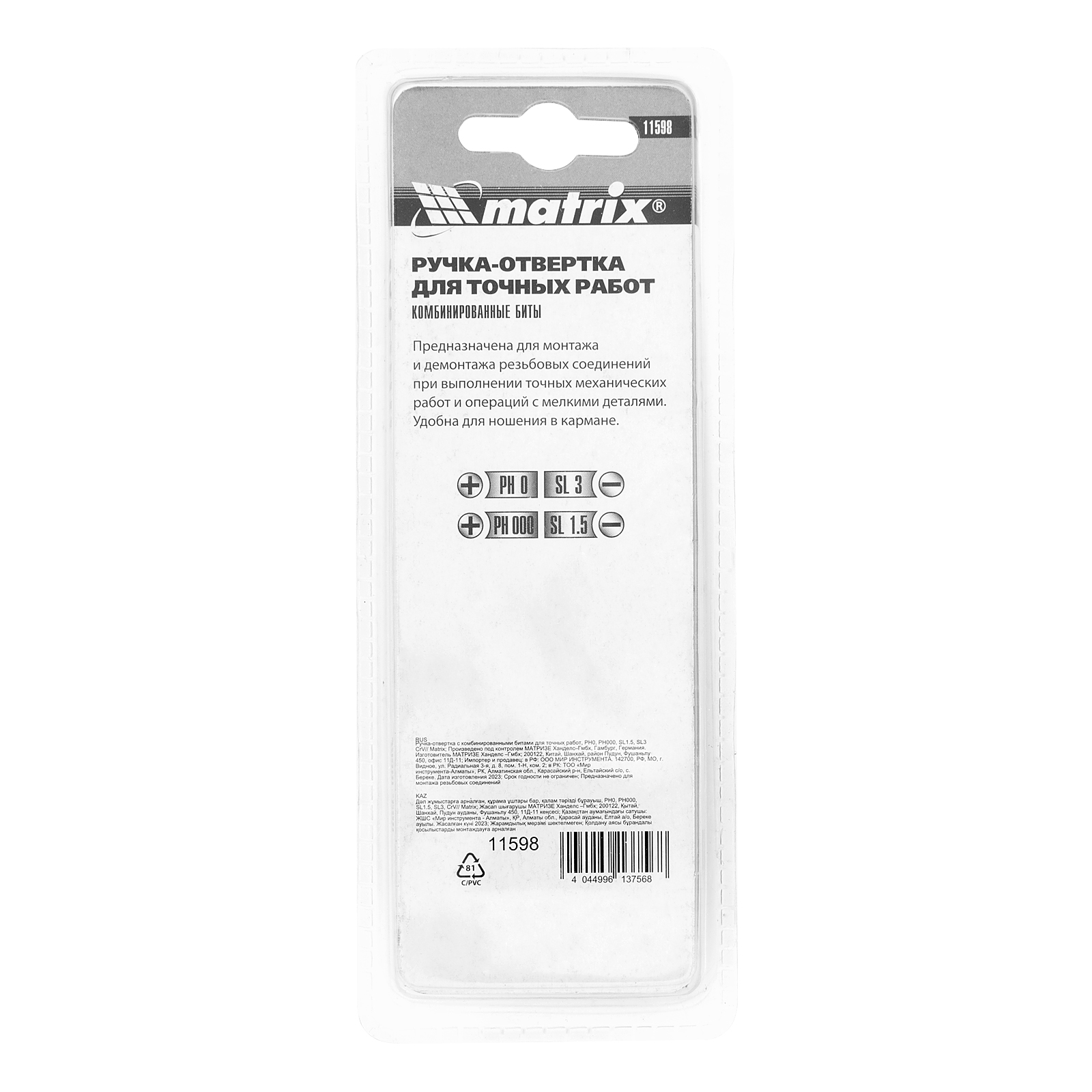 Набор Matrix 11598 из стали CrV включает в себя ручку-отвертку с комбинированными битами PH0, PH000, SL1.5 и SL3 для точных работ с крепежными элементами типа Phillips и Slotted. Инструменты незаменимы при ремонтном обслуживании электротехники, очков, часов, мелких бытовых приборов и т.д.