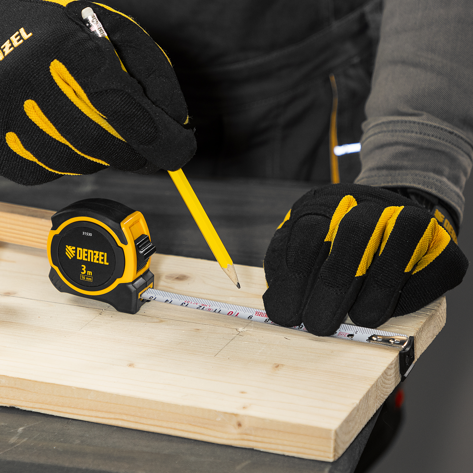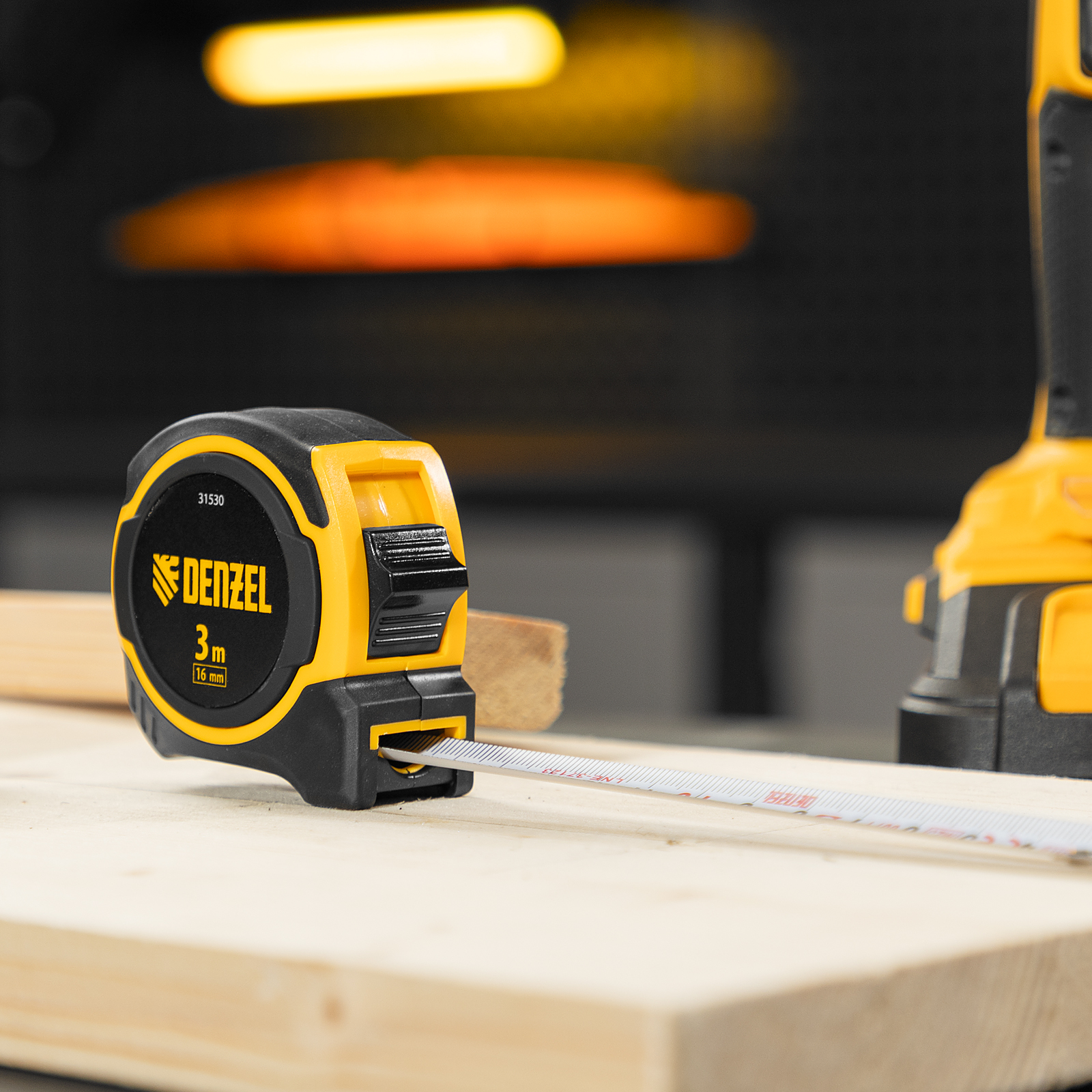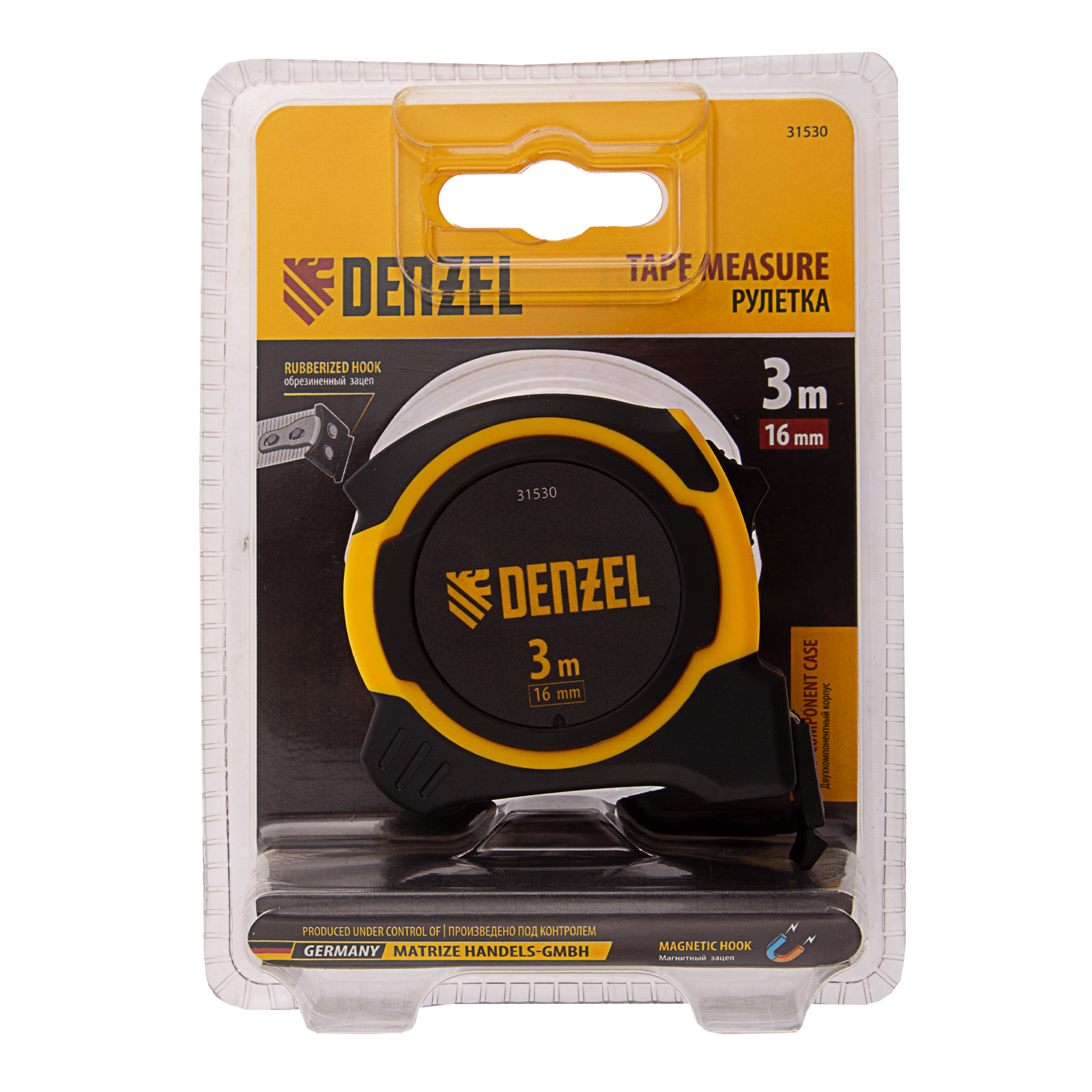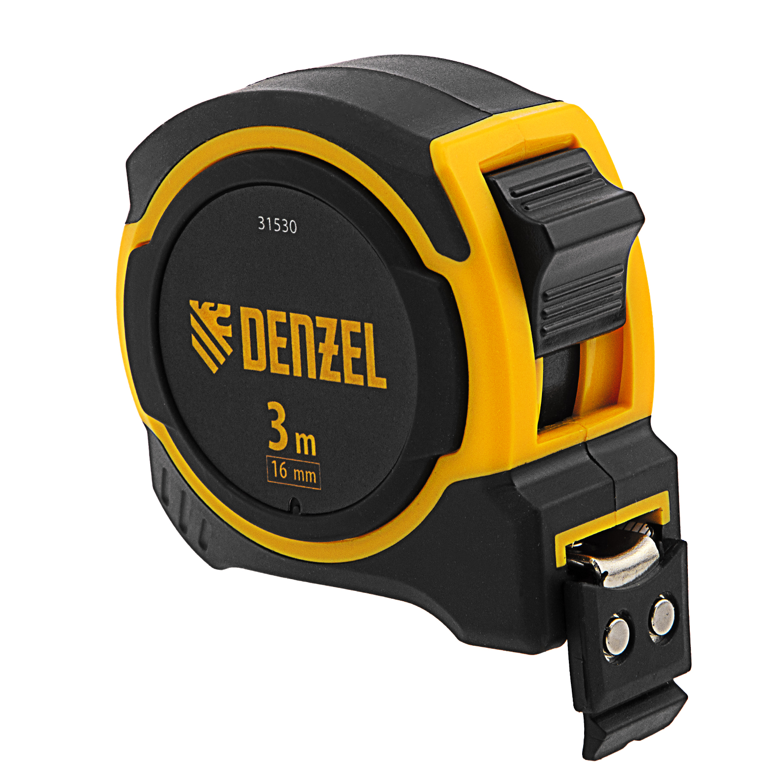 Рулетка Denzel 31530 в двухкомпонентном корпусе, с измерительной лентой шириной 16 мм и магнитным обрезиненным зацепом, позволяет определять размеры предметов и расстояния до 3 м. Рулетка будет полезна при проведении строительных, ремонтных и различных бытовых работ.