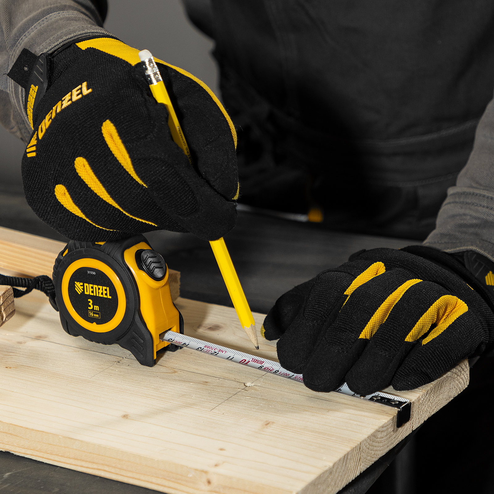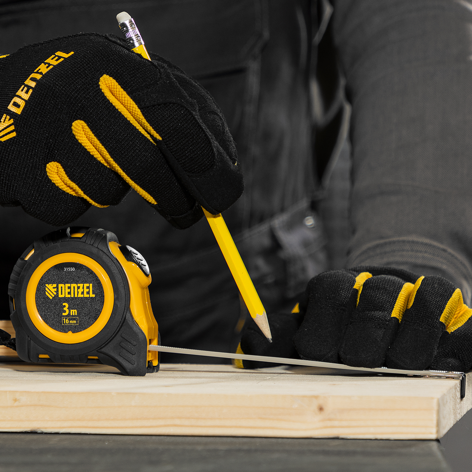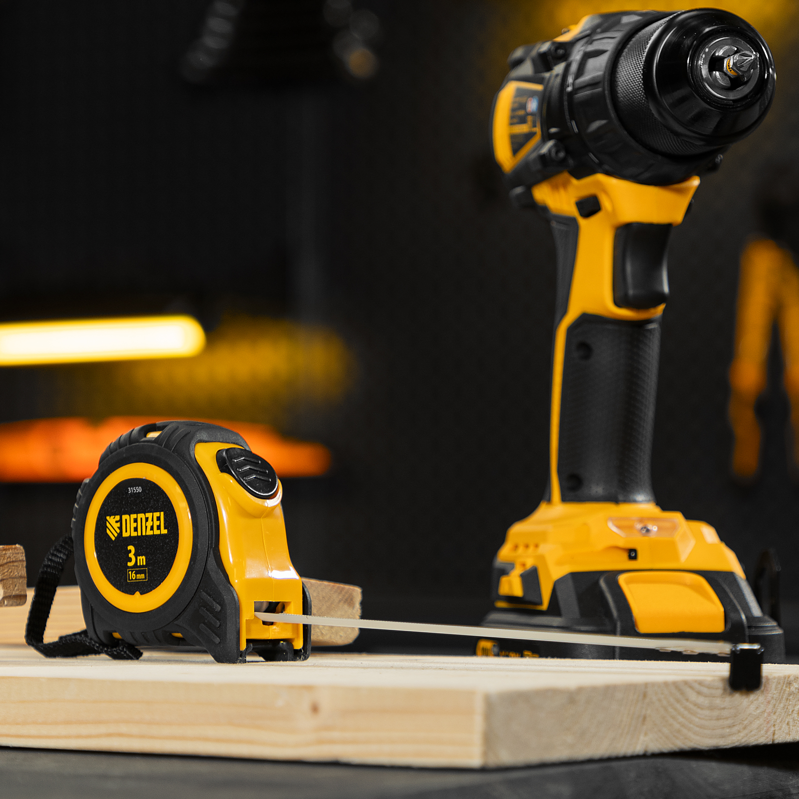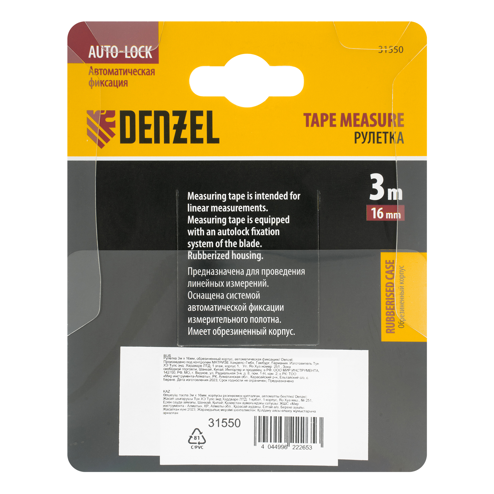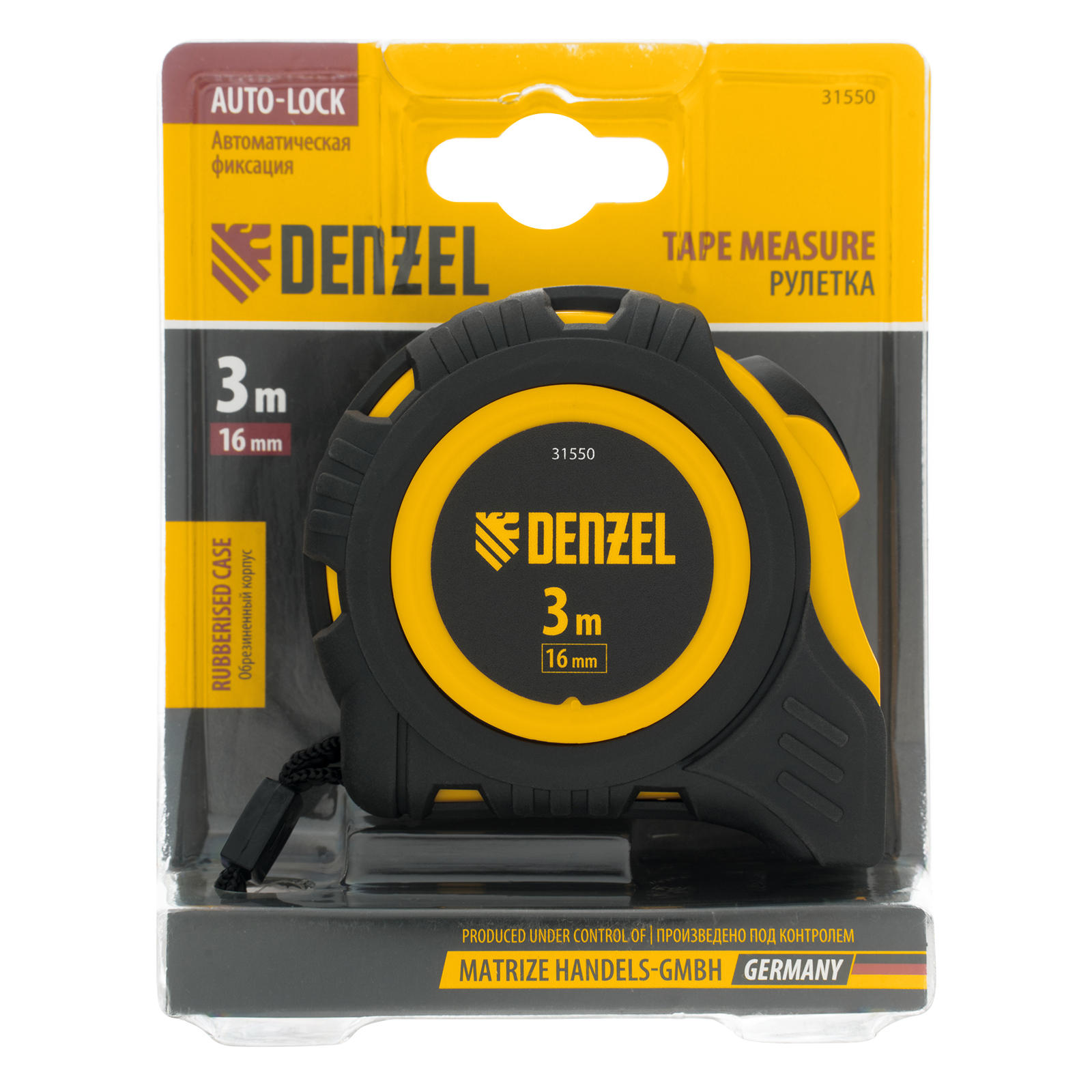 Рулетка Denzel 31550 в обрезиненном корпусе, с автоматической фиксацией, с полотном шириной 16 мм и длиной 3 м, используется для измерения расстояний и размеров предметов. Стальная лента с эмалевым покрытием и защитной пластиной в месте крепления зацепа рассчитана на долгий срок службы. Рулетка будет полезна во время строительства и ремонта, а также пригодится в быту.