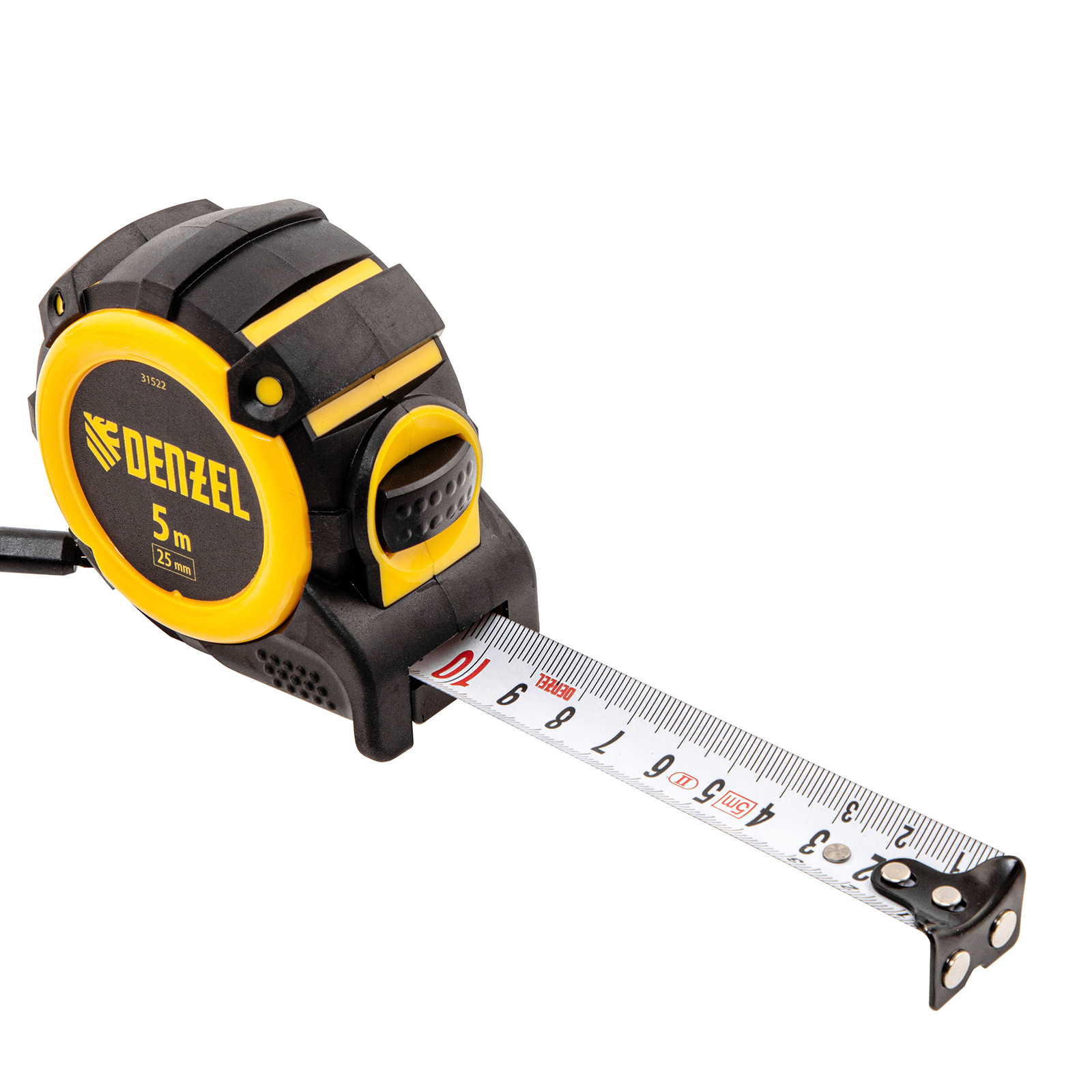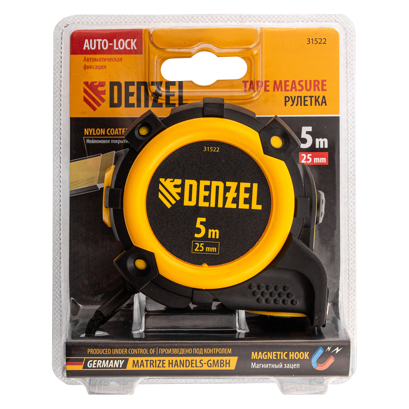 Рулетка Denzel 31522 с автоматической фиксацией полотна размером 5 м х 25 мм, с нейлоновым покрытием, магнитным зацепом и двухсторонней разметкой, предназначена для измерения расстояний и определения габаритов различных предметов. Лента автоматически фиксируется в вытянутом положении, что упрощает работу. Рулетка удобна для работы в труднодоступных местах, будет полезна во время строительных и ремонтных работ.