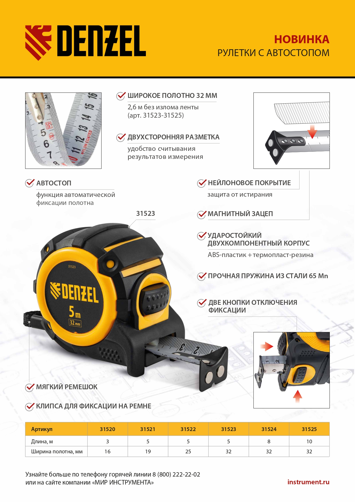 - Четкая шкала — измерительное полотно с нейлоновым покрытием устойчиво к истиранию.
