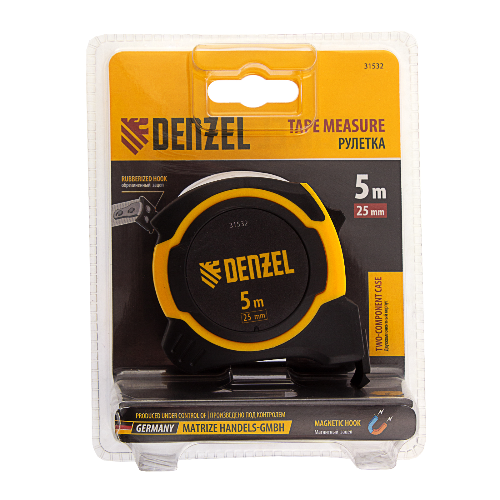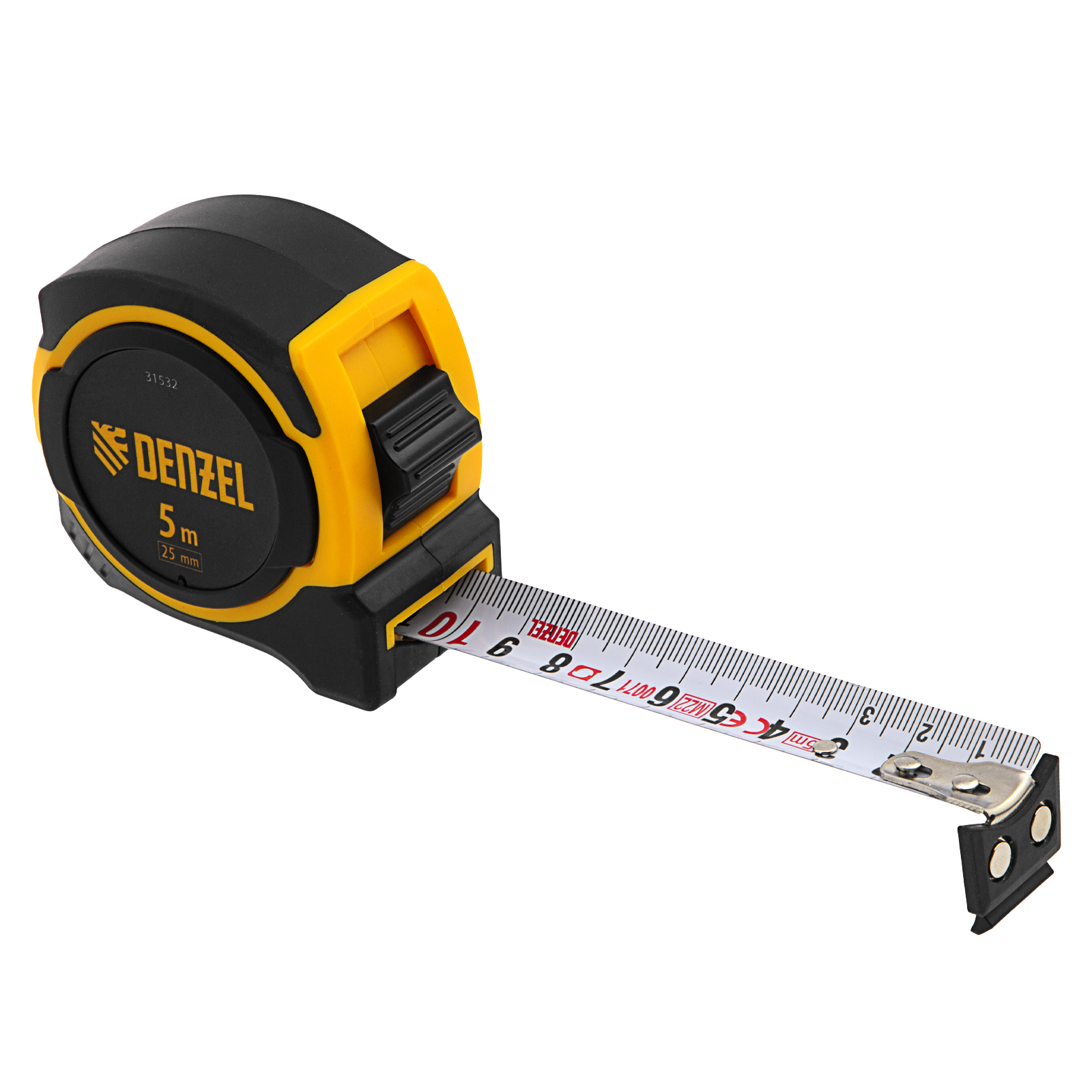 Рулетка Denzel 31532 в двухкомпонентном корпусе, с измерительной лентой шириной 25 мм и магнитным обрезиненным зацепом, позволяет определять размеры предметов и расстояния до 5 м. Широкая упругая лента упрощает проведение измерений в труднодоступных местах. Рулетка будет полезна при проведении строительных, ремонтных и различных бытовых работ.