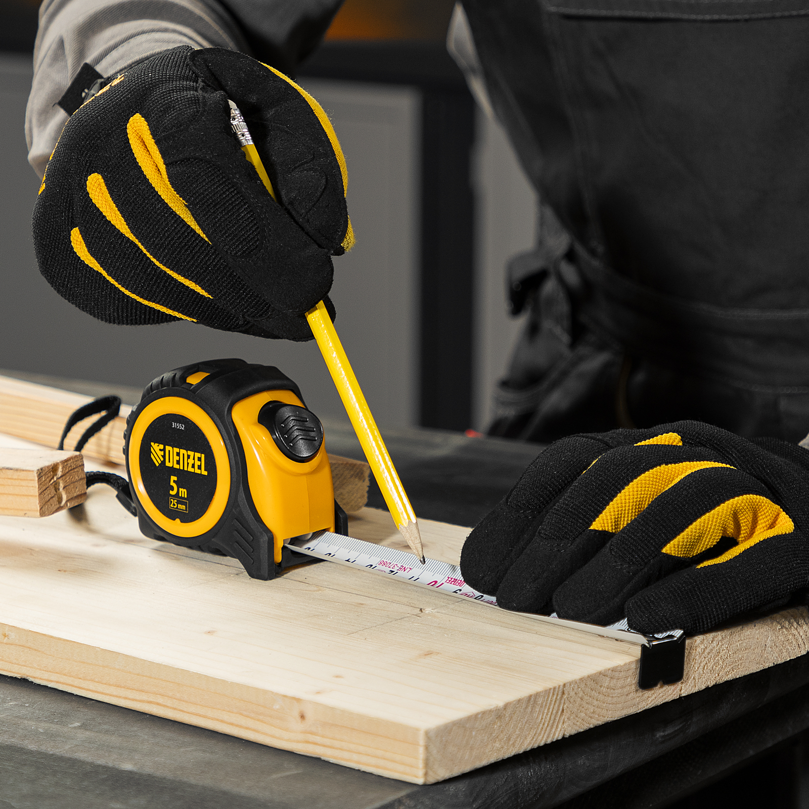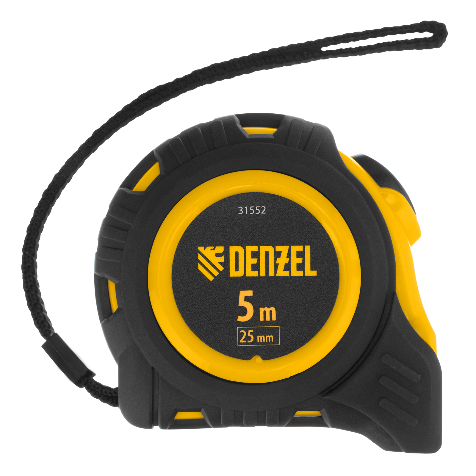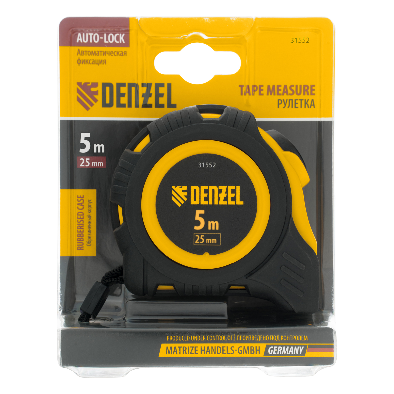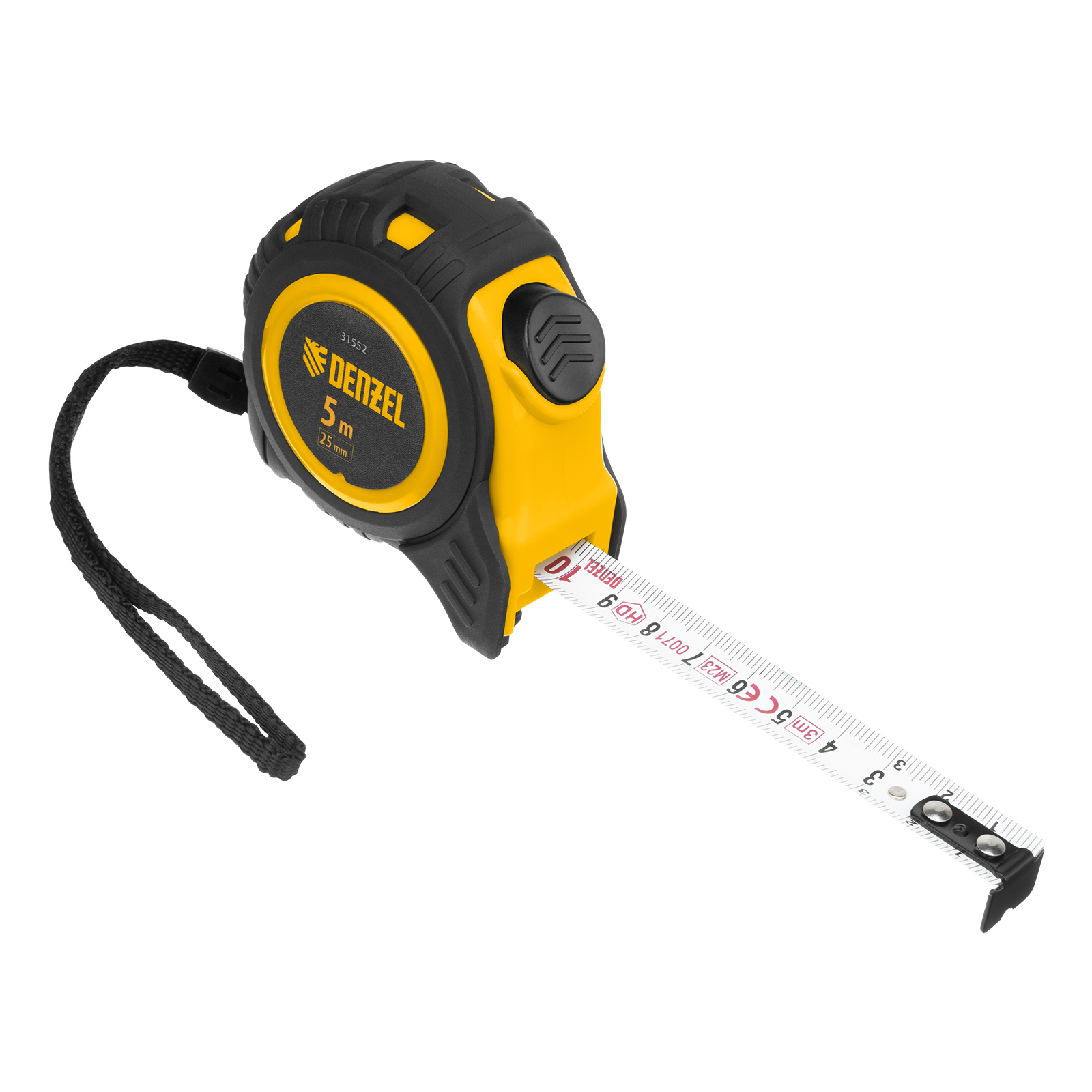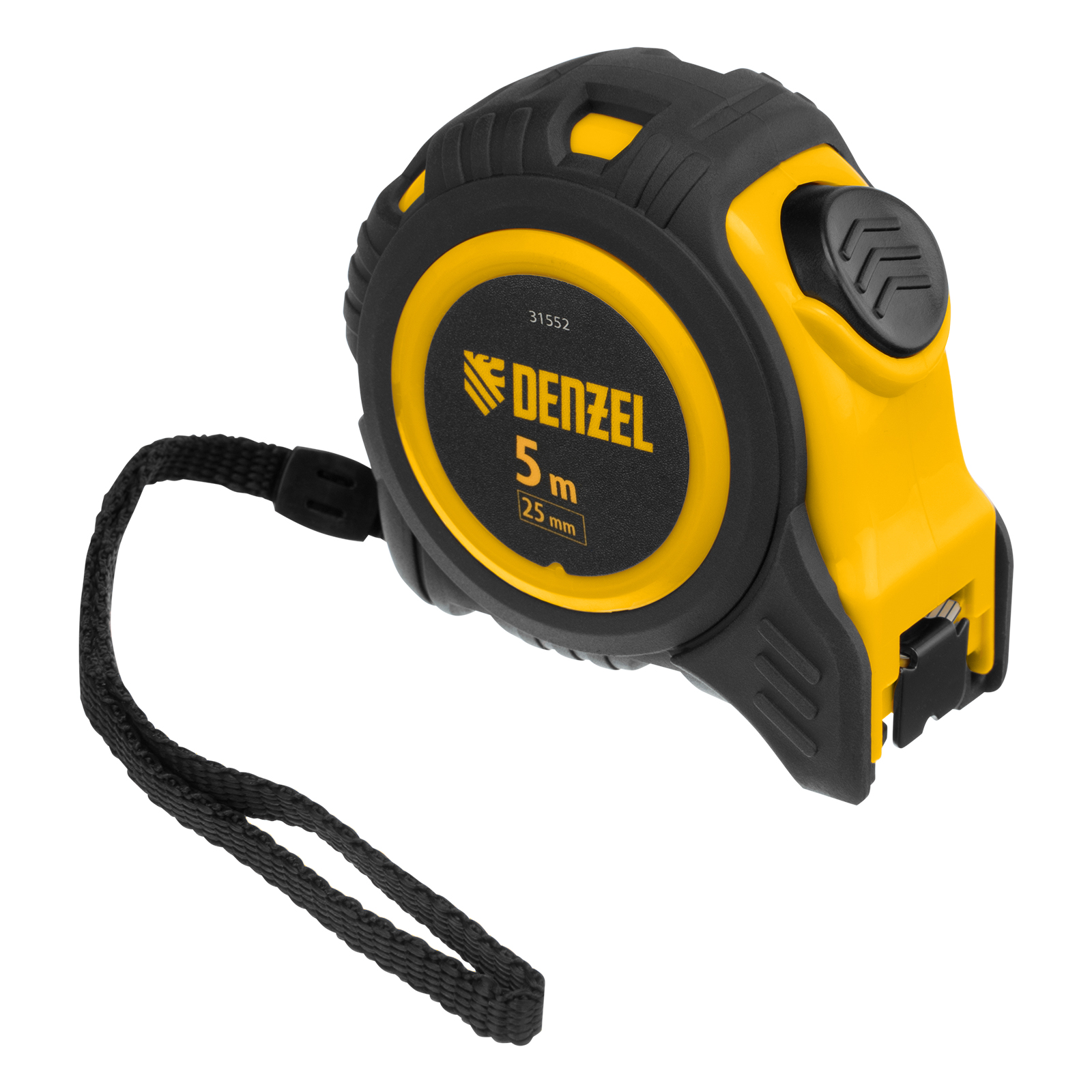 Рулетка Denzel 31552 в обрезиненном корпусе, с автоматической фиксацией, с полотном шириной 25 мм и длиной 5 м, используется для измерения расстояний и размеров предметов. Стальная лента с эмалевым покрытием и защитной пластиной в месте крепления зацепа рассчитана на долгий срок службы. Рулетка будет полезна во время строительства и ремонта, а также пригодится в быту.