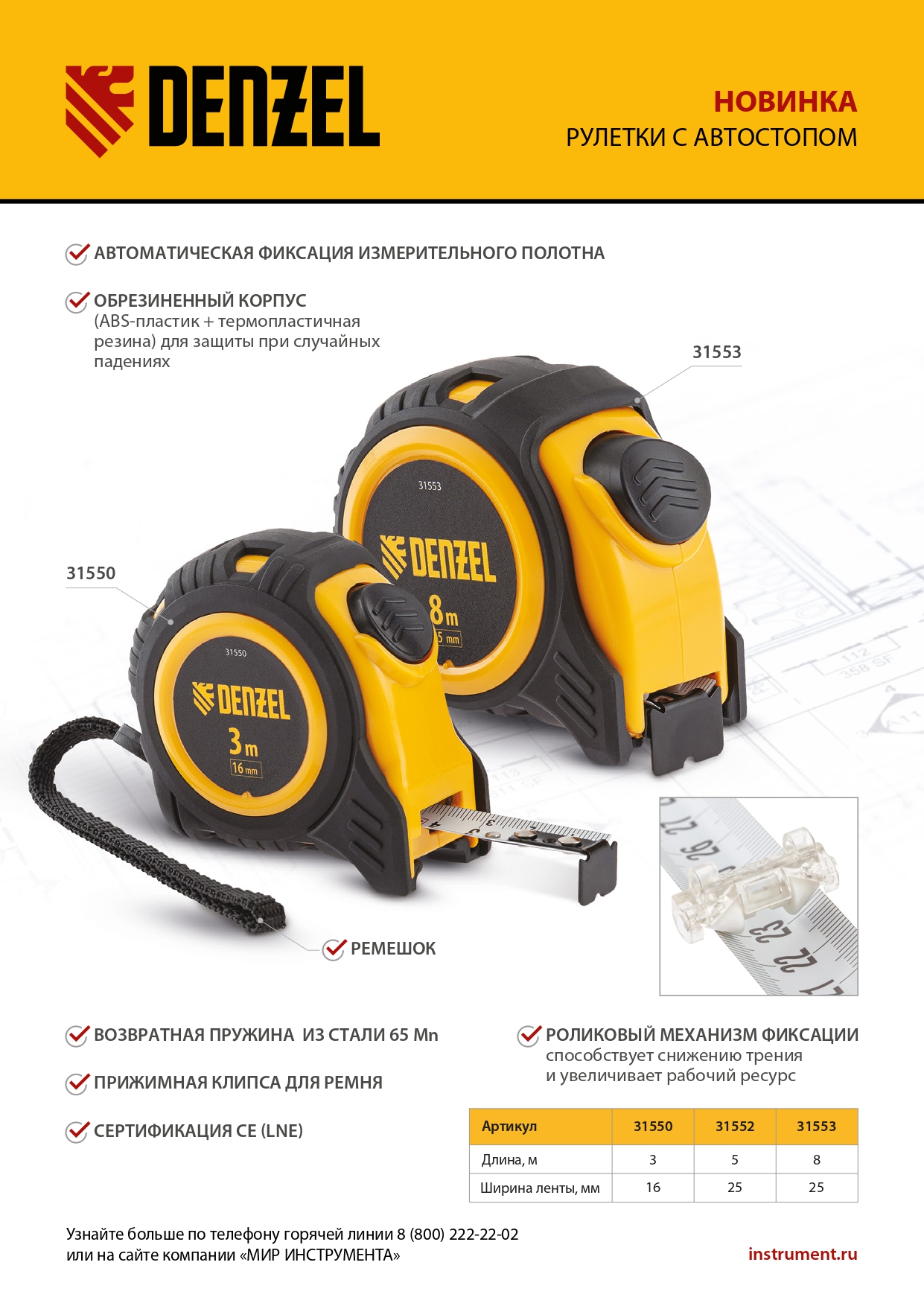- Долговечная конструкция — на измерительном полотне предусмотрен роликовый механизм фиксации, снижающий его трение о поверхность.