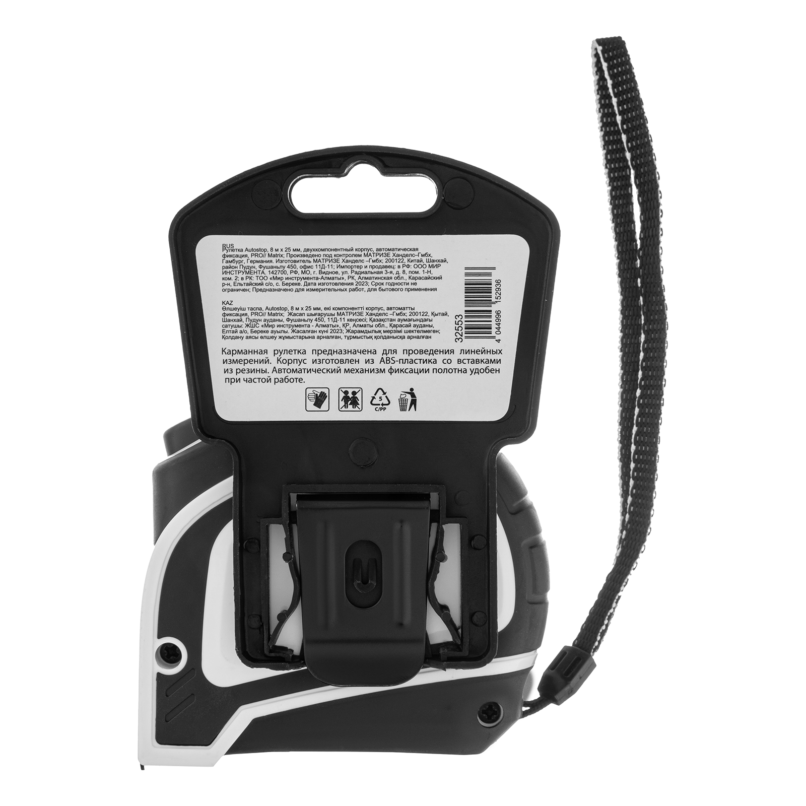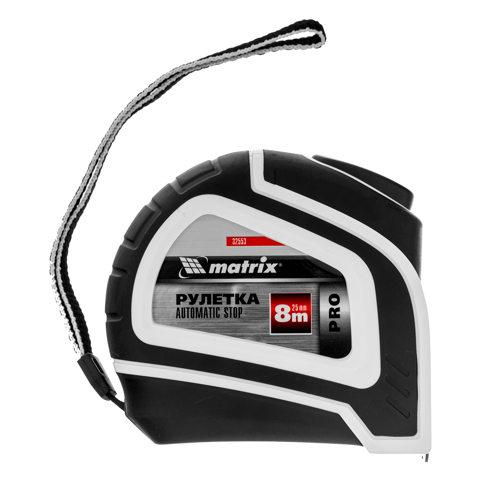 Рулетка Matrix PRO Autostop 32553 с полотном длиной 8 м и шириной 25 мм, в двухкомпонентном корпусе, с автоматической фиксацией ленты, используется для измерения объектов и расстояний. Корпус изготовлен из ударопрочного ABS-пластика, резиновые элементы увеличивают его сопротивляемость механическим нагрузкам. Заклепки надежно фиксируют зацеп на конце измерительного полотна. Рулетка подходит для профессионального и бытового применения.