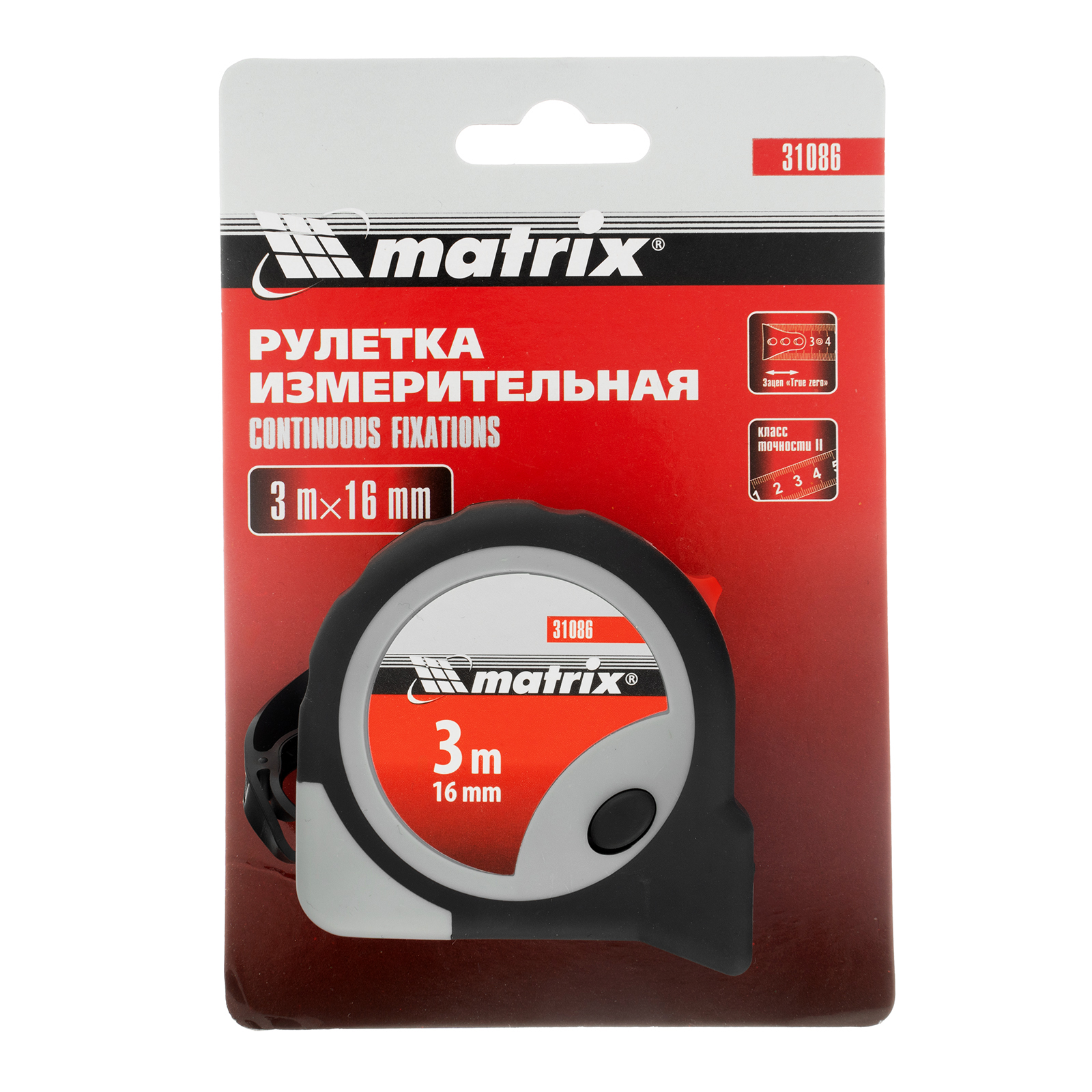 Рулетка Matrix Continuous fixation 31086 с полотном длиной 3 м и шириной 16 мм, в двухкомпонентном корпусе, с плавной фиксацией, — измерительный инструмент с ценой деления 1 мм и классом точности 2. Эргономичный корпус удобно ложится в руку, обеспечивая комфорт во время работы. Зацеп надежно закреплен на конце измерительной ленты при помощи заклепок. Рулетка пригодится в быту, а также будет полезна во время строительства или ремонта.