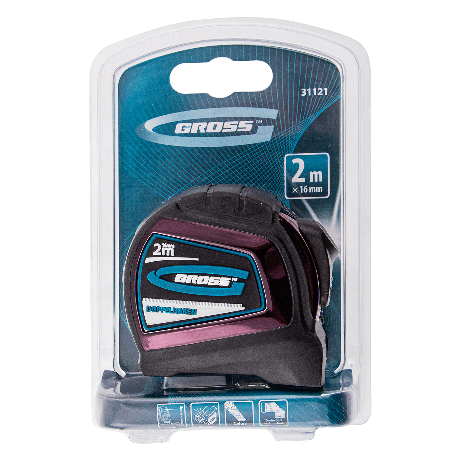 Автоматическая рулетка Gross «Doppelhaken» 31121 с односторонним зацепом, лентой размером 2 м x 16 мм, с двухсторонней шкалой и нейлоновым покрытием, предназначена для проведения измерений стен, полов, различных материалов и конструкций. Пригодится на строительной площадке и в быту.