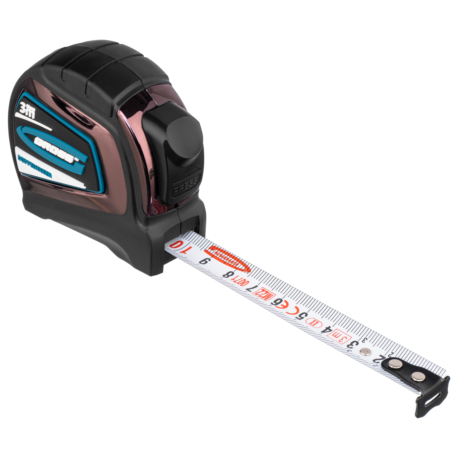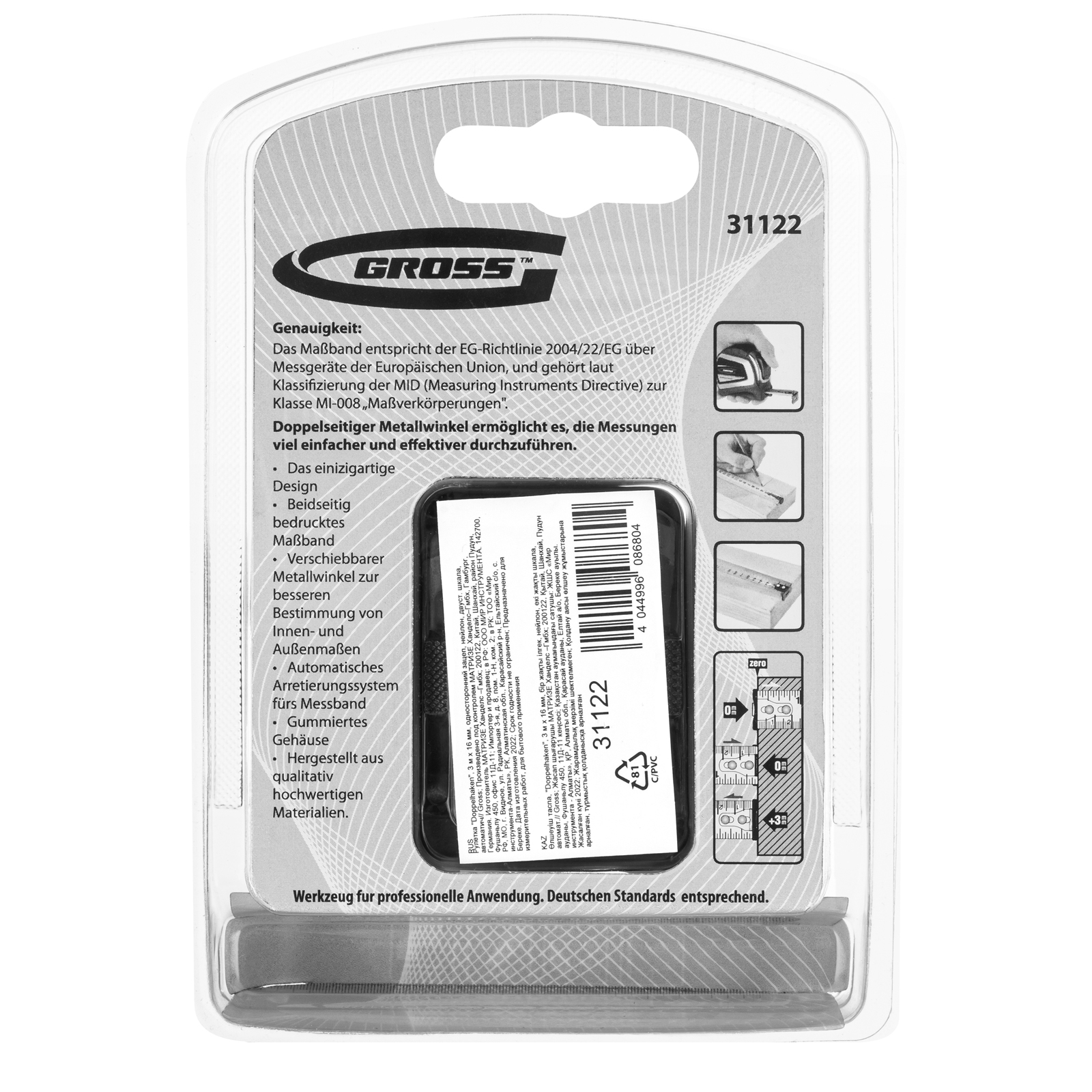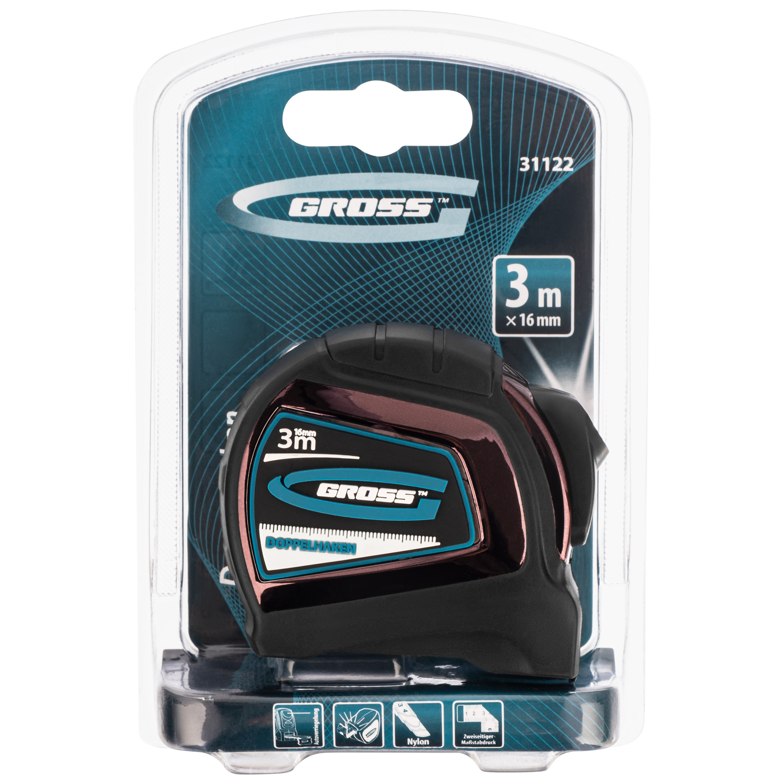 Автоматическая рулетка Gross «Doppelhaken» 31122 с односторонним зацепом, лентой размером 3 м x 16 мм, с двухсторонней шкалой и нейлоновым покрытием, предназначена для проведения измерений стен, полов, различных материалов и конструкций. Пригодится на строительной площадке и в быту.