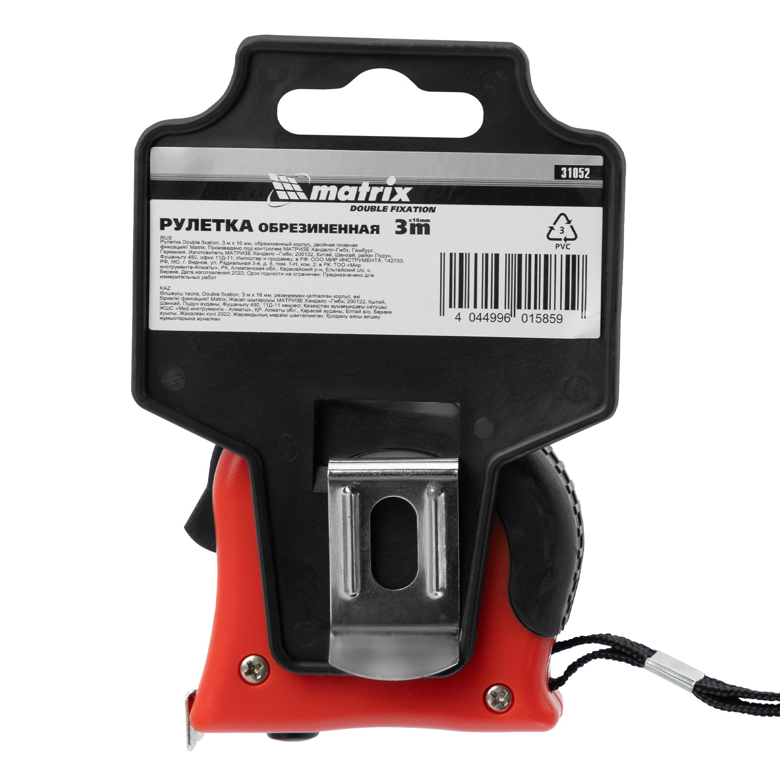 Рулетка Matrix Double fixation 31052 в обрезиненном корпусе, с двойной плавной фиксацией ленты длиной 3 м и шириной 16 мм, предназначена для определения расстояния между двумя точками. Двухкомпонентный корпус из ударопрочного ABS-пластика и ПВХ устойчив к механическим повреждениям. Инструмент используется для выполнения строительных и ремонтных работ, а также полезен в быту.
