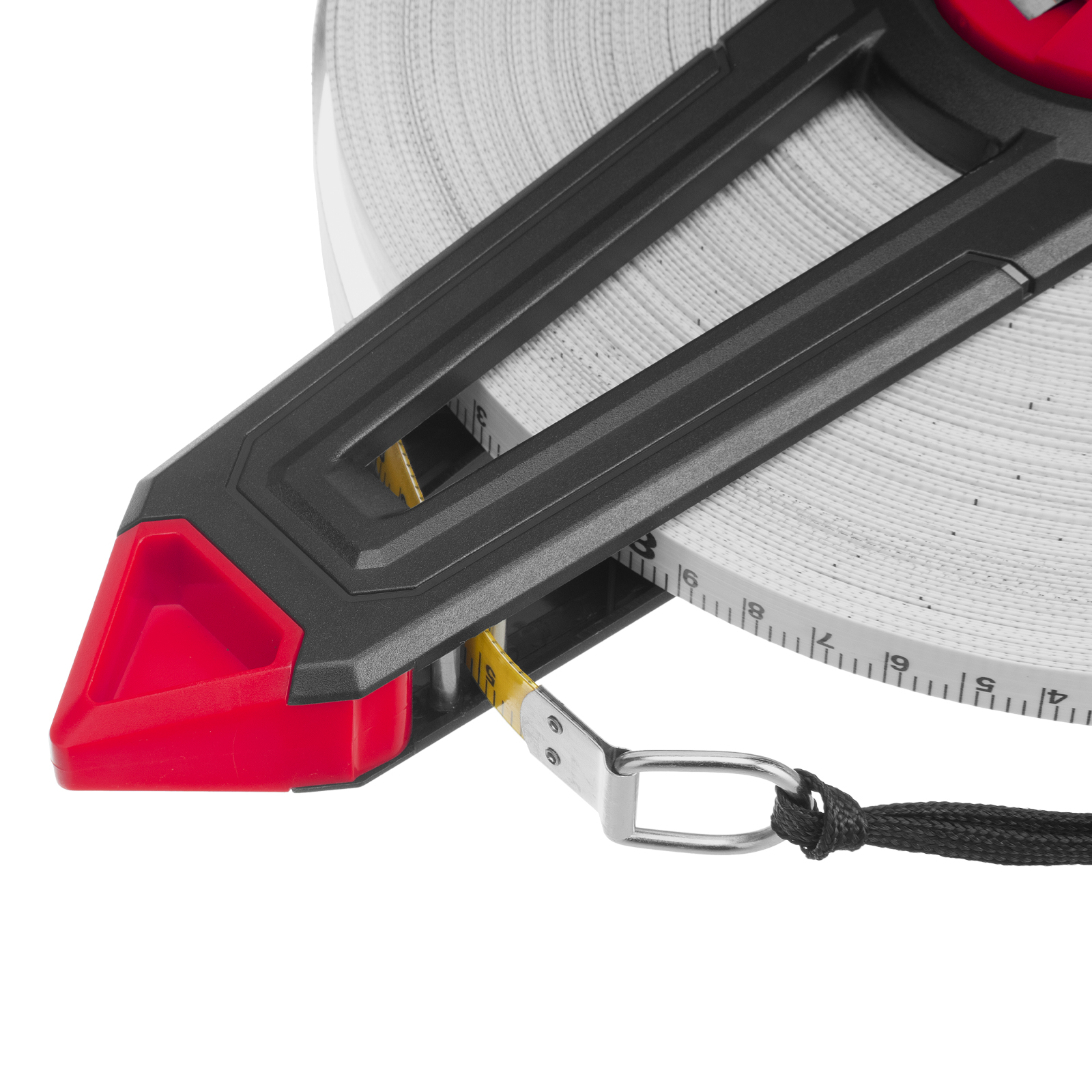 - Удобная работа — благодаря заостренному наконечнику рулетку можно зафиксировать в почве, кольцо на ленте позволяет надежно закрепить ее на начальной точке.