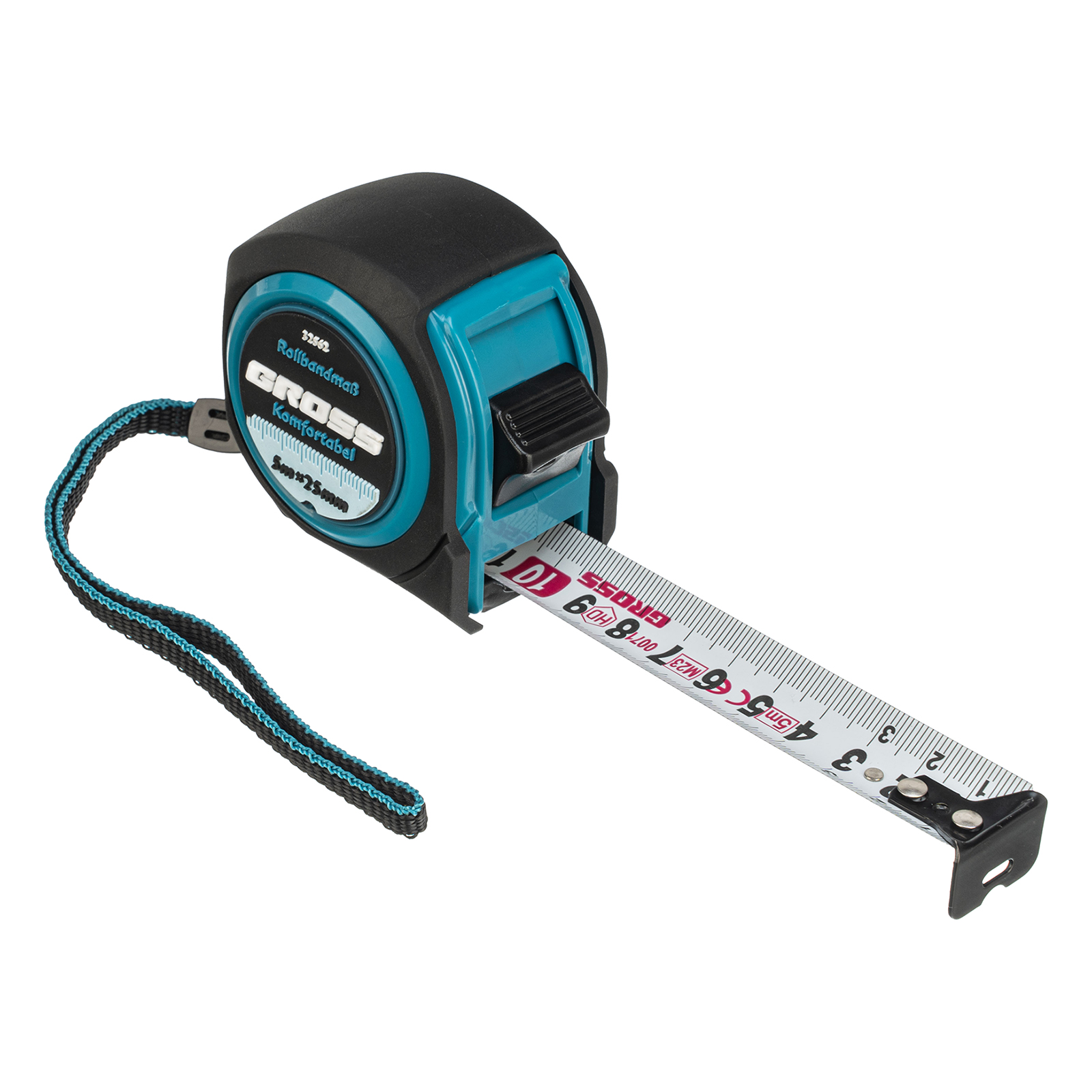 Рулетка Gross «Komfortabel» 32562 в обрезиненном корпусе с лентой длиной 5 м и шириной 25 мм — карманный инструмент для проведения измерительных работ. Позволяет выполнить линейные измерения ровных поверхностей, различных заготовок, материалов, конструкций и т.д.