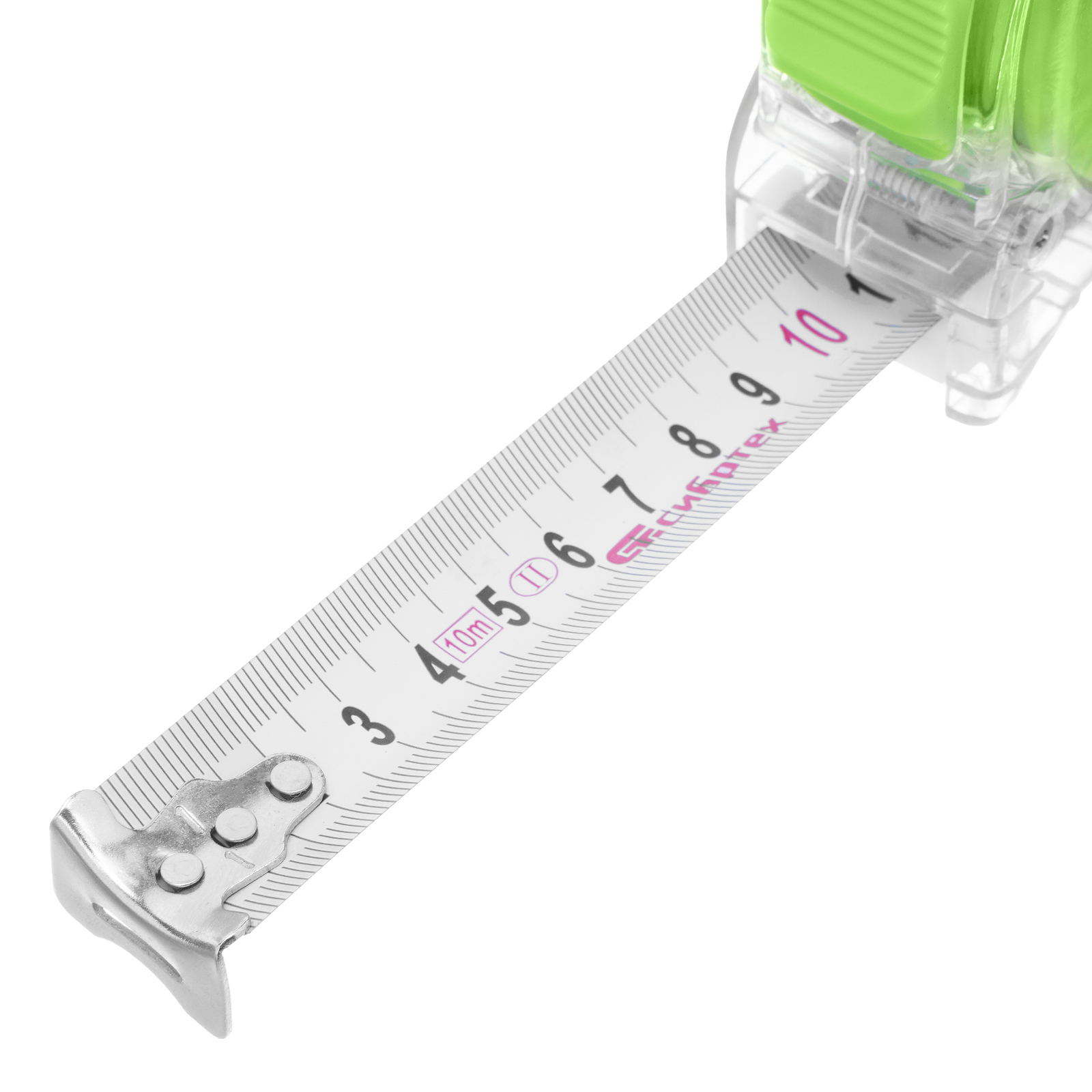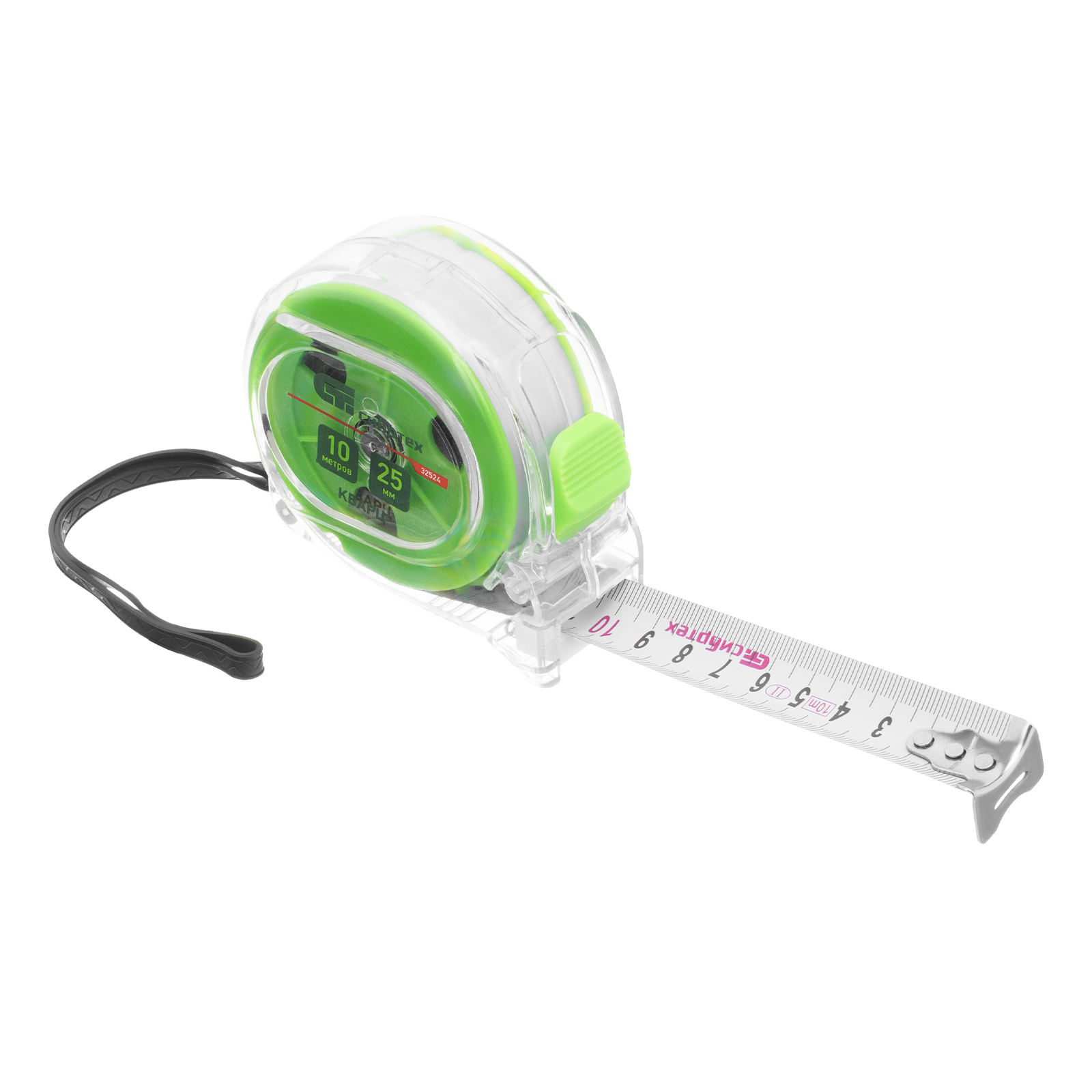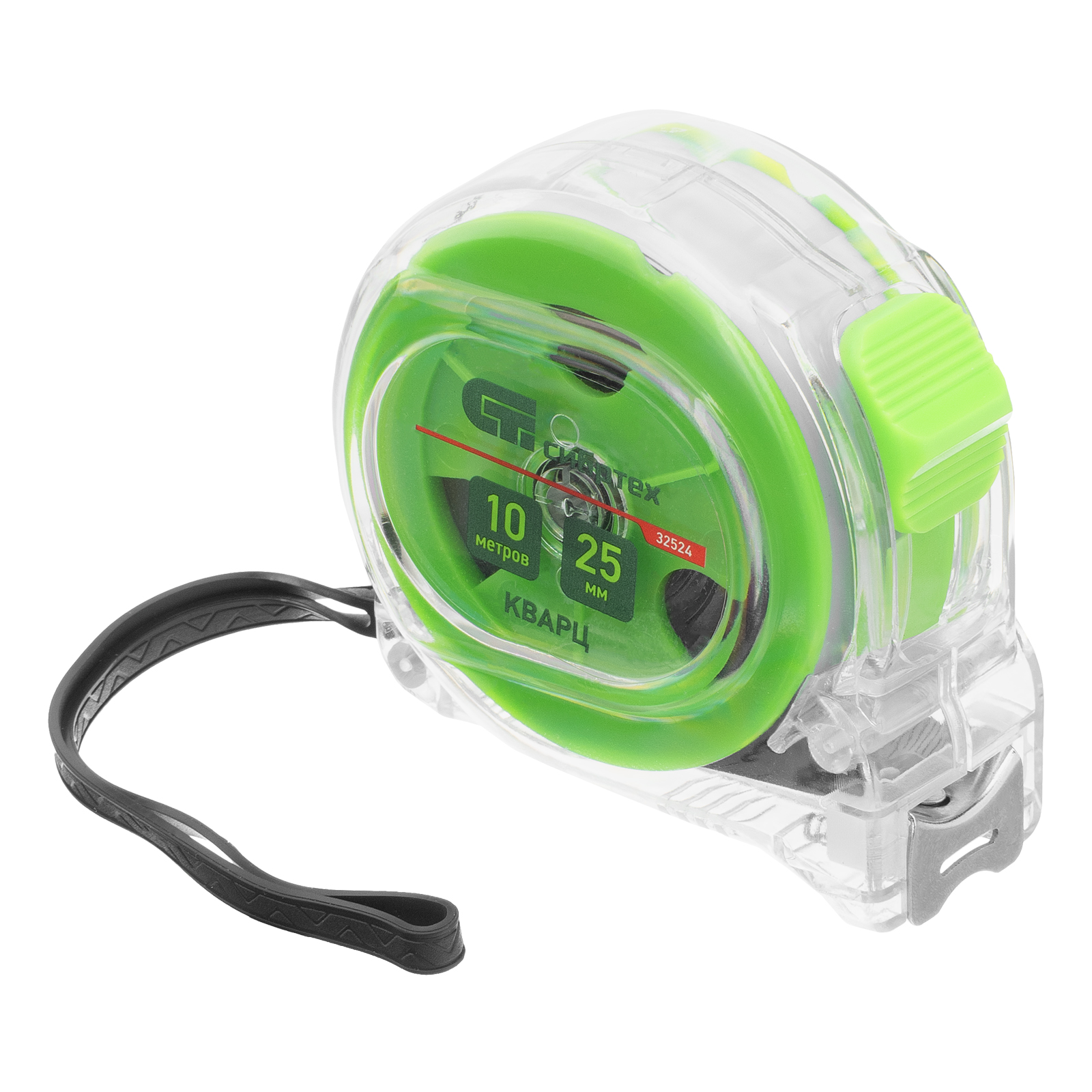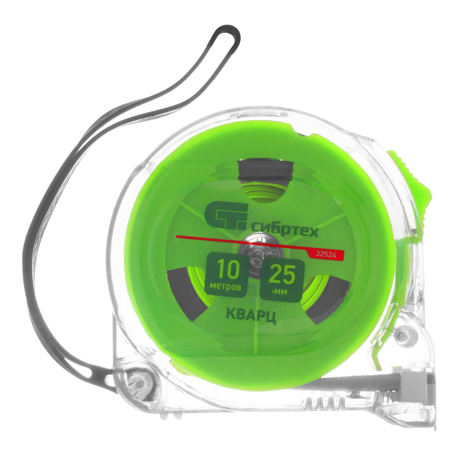 Рулетка Сибртех Кварц 32524 с полотном размером 10 м х 25 мм, в прозрачном корпусе, с амортизатором, будет полезна для измерения длины конструкций, строительных материалов и т.д. Пригодится на строительной площадке, в гараже, мастерской и в быту.