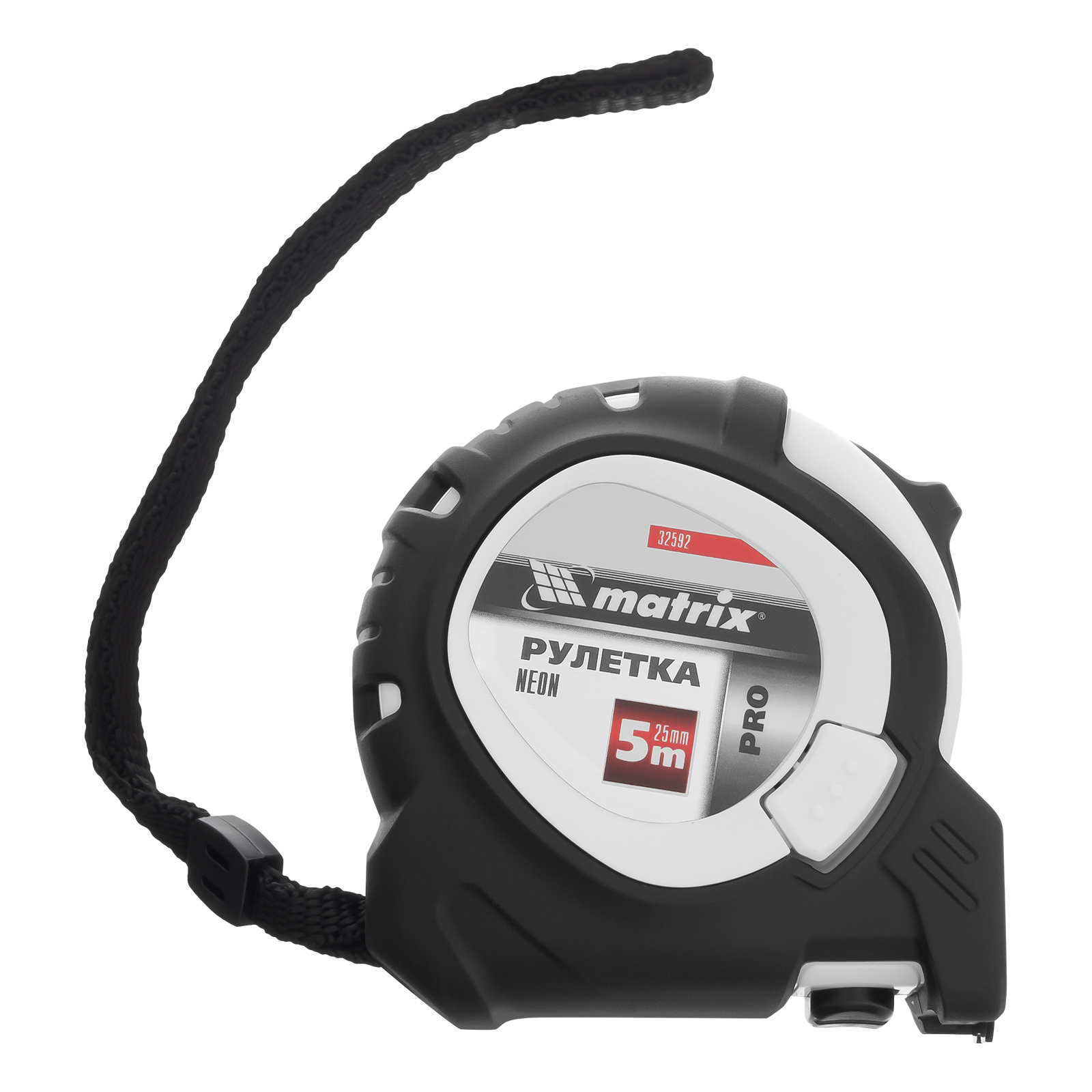 Рулетка Matrix PRO Neon 32592 в обрезиненном корпусе, с 3 механизмами фиксации ленты длиной 5 м и шириной 25 мм, служит для определения расстояний и размеров различных предметов. Крупные цифры на матовом желто-зеленом полотне хорошо видны, что облегчает считывание результатов. Измерительное полотно можно зафиксировать на нужной отметке при помощи стопора или одной из двух кнопок-пауз — это удобно при проведении большого количества замеров. Рулетка предназначена для выполнения профессиональных и бытовых измерительных работ.
