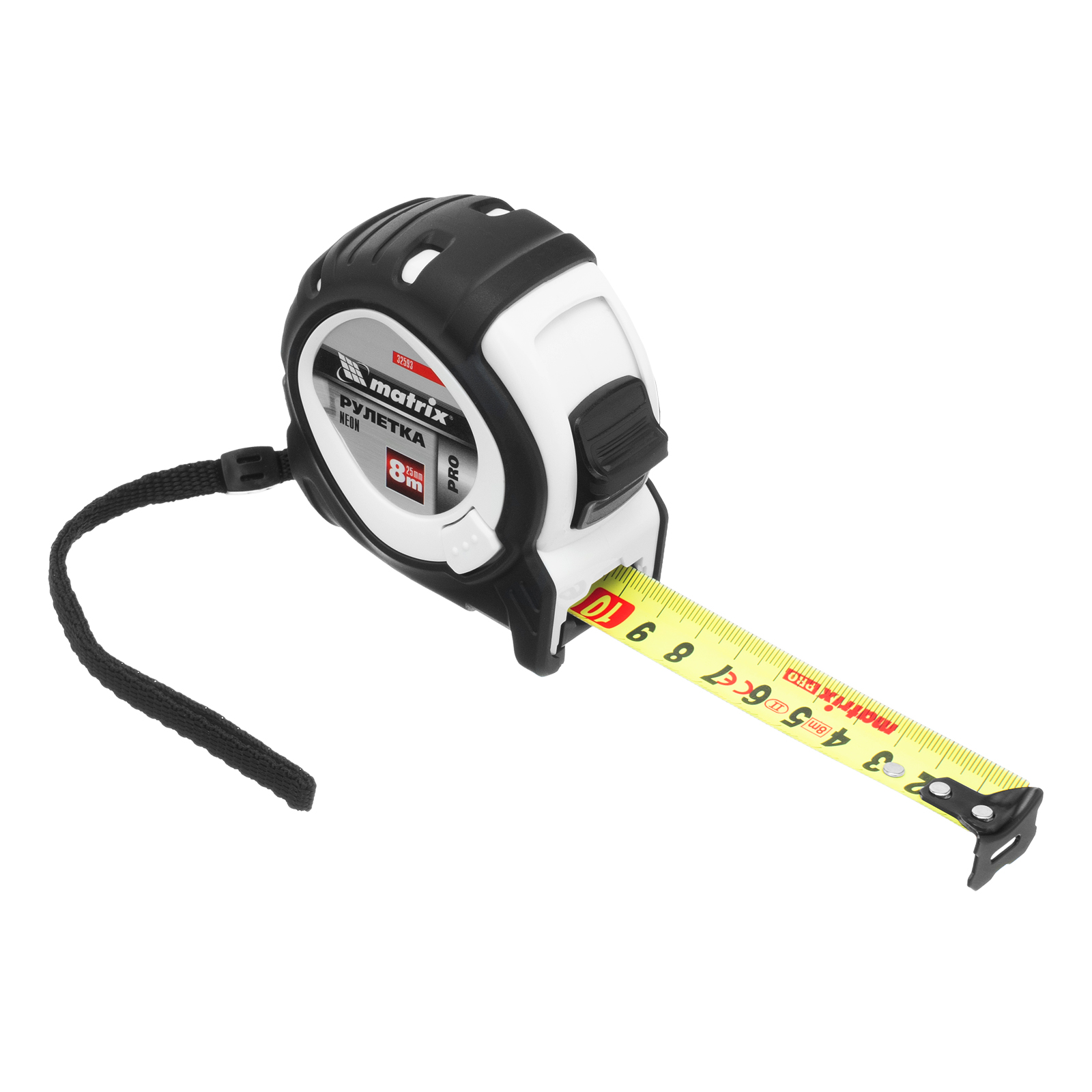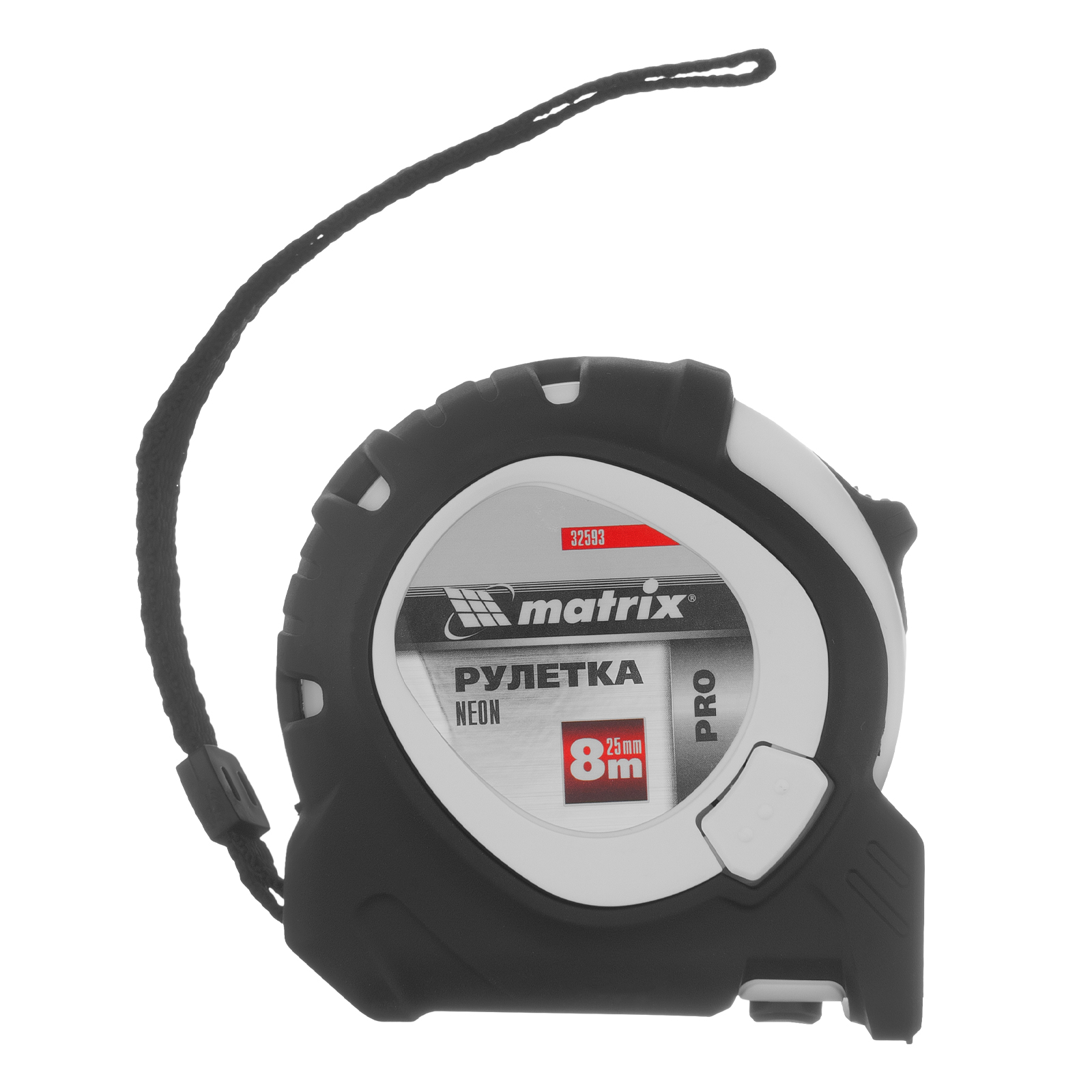 Рулетка Matrix PRO Neon 32593 в обрезиненном корпусе, с 3 механизмами фиксации ленты длиной 8 м и шириной 25 мм, служит для определения расстояний и размеров различных предметов. Крупные цифры на матовом желто-зеленом полотне хорошо видны, что облегчает считывание результатов. Измерительное полотно можно зафиксировать на нужной отметке при помощи стопора или одной из двух кнопок-пауз — это удобно при проведении большого количества замеров. Рулетка предназначена для выполнения профессиональных и бытовых измерительных работ.