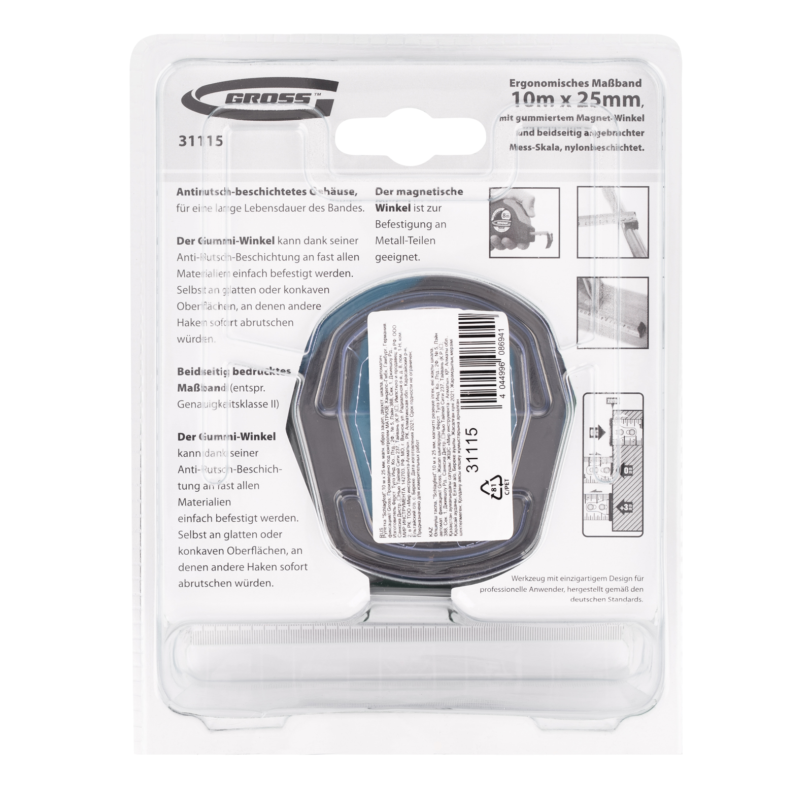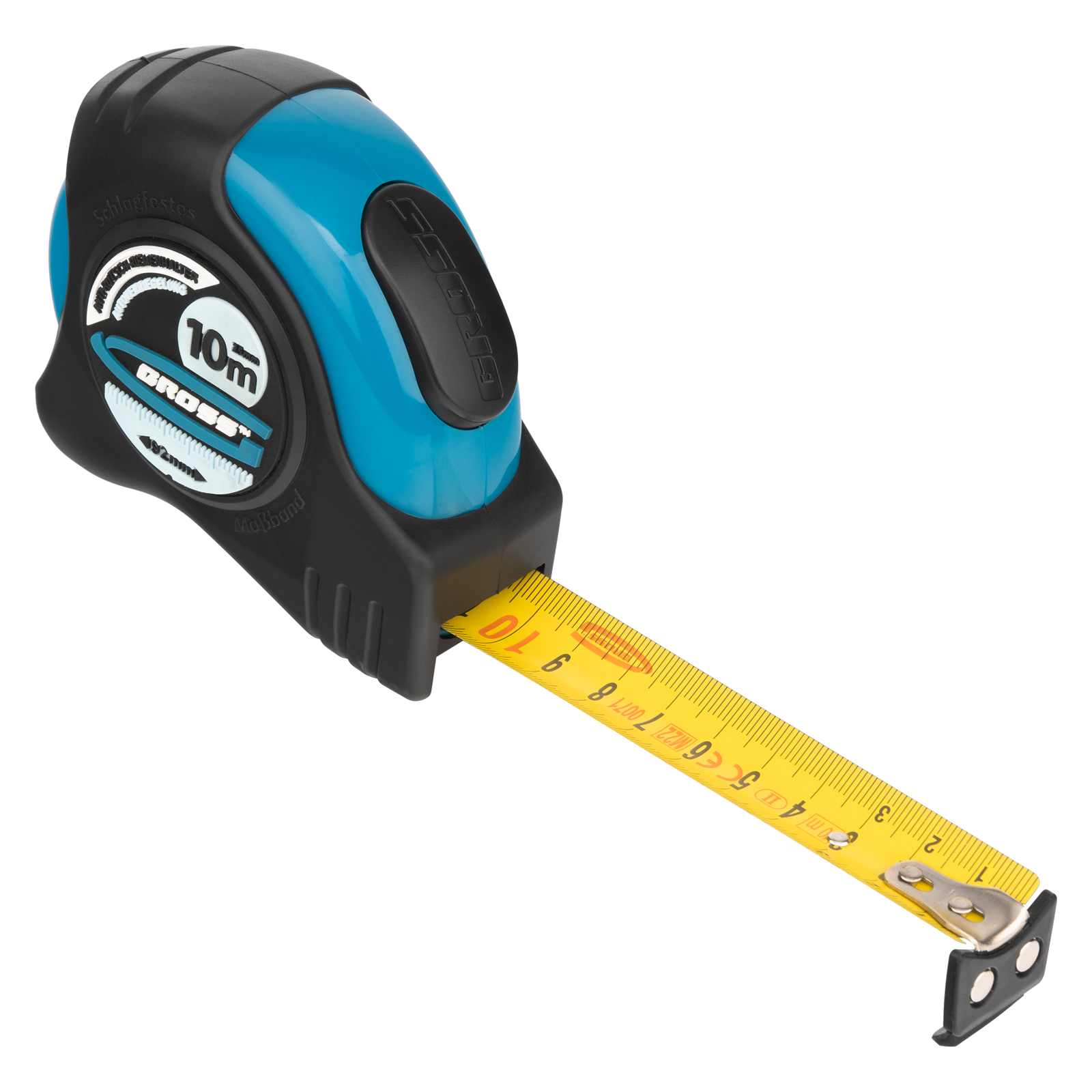 Рулетка Gross «Schlagfest» 31115 с магнитным обрезиненным зацепом, двухсторонней шкалой и функцией автоматической фиксации полотна длиной 10 м и шириной 25 мм, с нейлоновым покрытием, позволяет определять размеры предметов, вычислять площадь помещения и проводить другие измерительные работы. Магнитный обрезиненный зацеп надежно фиксируется на скользких и металлических поверхностях со сложной формой. Широкое упругое полотно облегчает работу в труднодоступных местах. Карманная рулетка пригодится на строительной площадке и в быту.