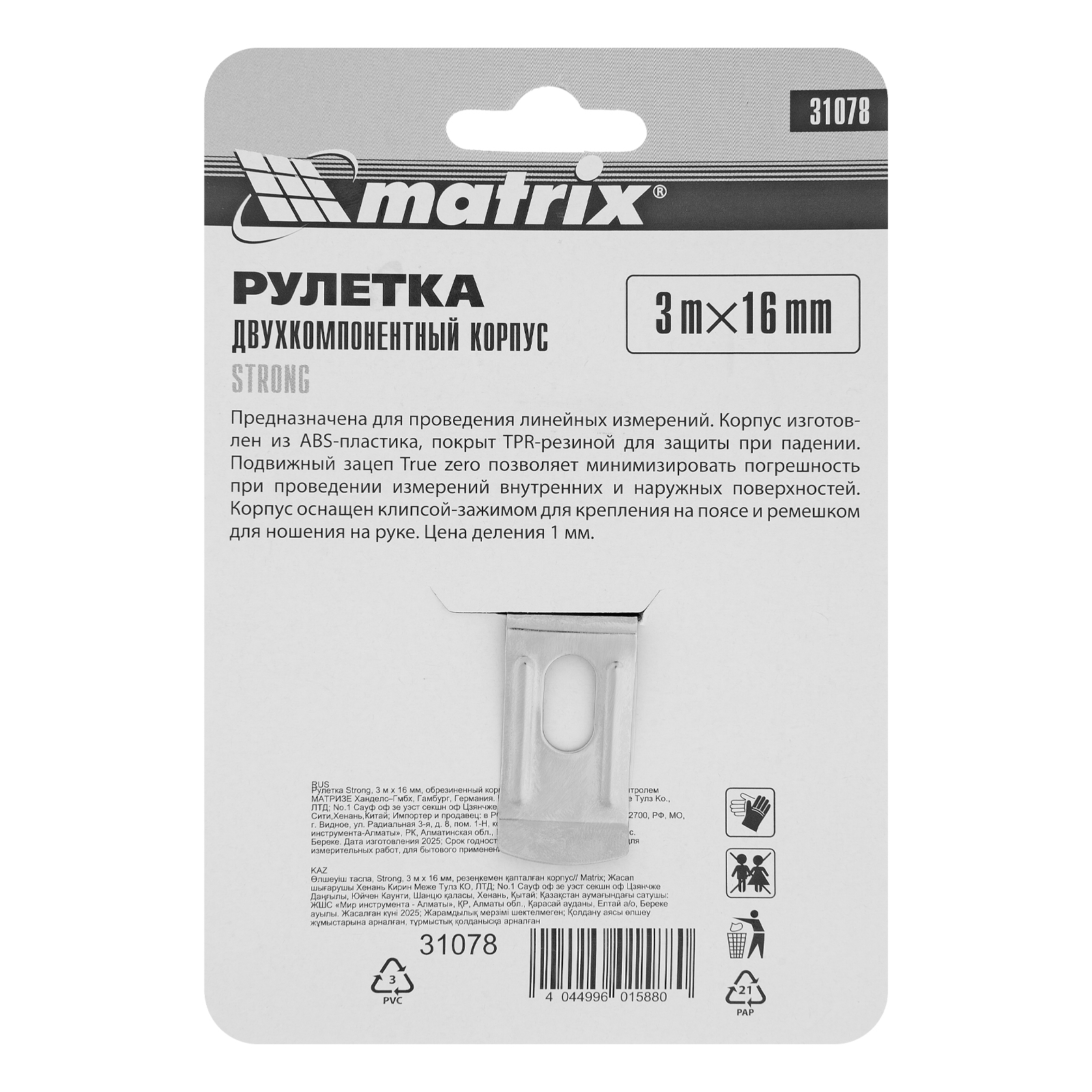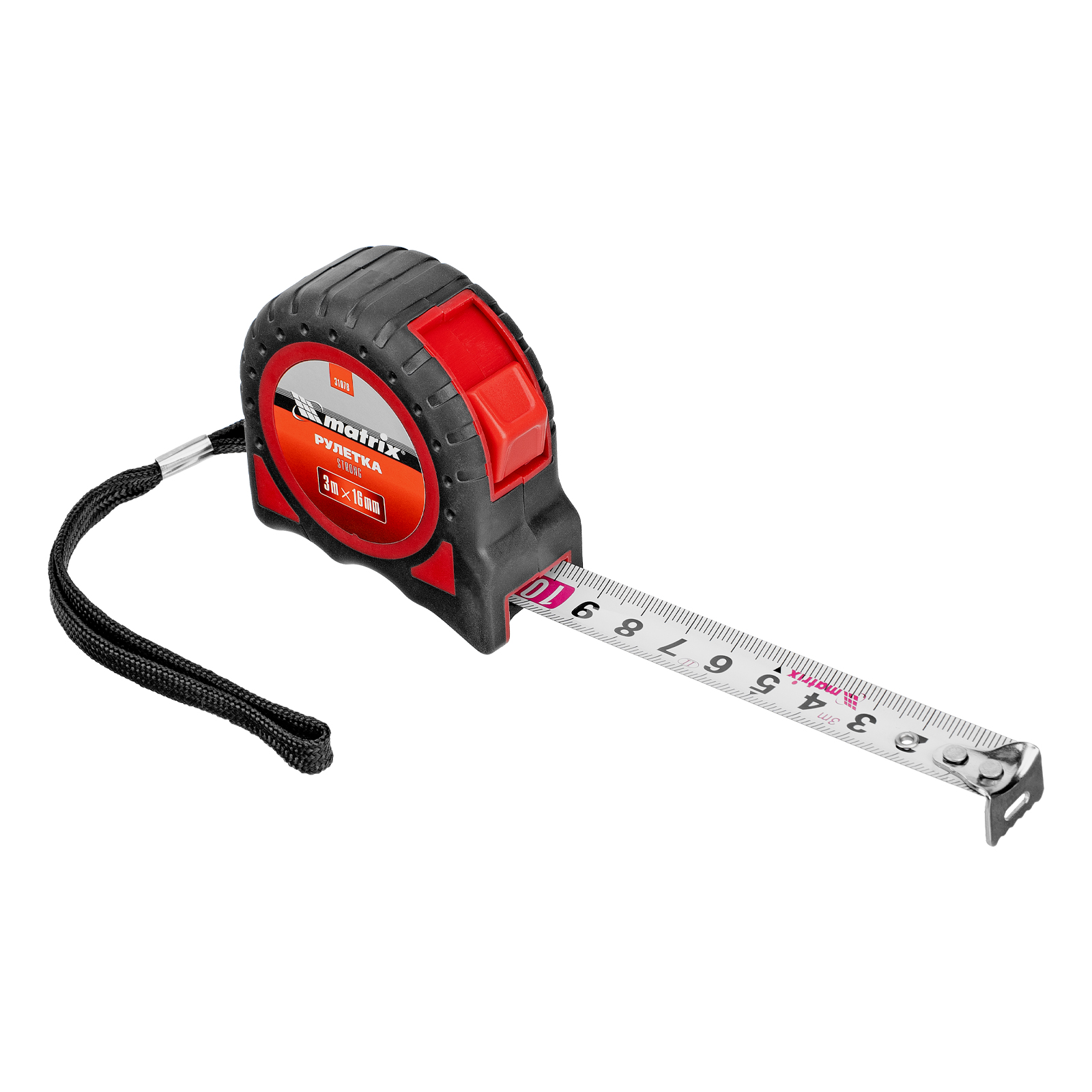 <p>Рулетка Matrix Strong 31078 с измерительной лентой длиной 3 м и шириной 16 мм, в обрезиненном корпусе, предназначена для определения размеров и расстояний. Частично обрезиненный корпус из ударопрочного ABS-пластика устойчив к повреждениям, что уменьшает риск его поломки в случае падения или удара. Стальная лента с зацепом, прикрепленным заклепками, рассчитана на длительное использование. Рулетка пригодится на строительной площадке, во время ремонта, а также дома или на даче.</p><h2>Преимущества</h2><ul><li>Точные результаты измерений — благодаря подвижному зацепу можно не учитывать погрешность в виде толщины самого зацепа.</li><li>Удобное использование — кнопка-фиксатор удерживает ленту в вытянутом положении.</li><li>Комфортная транспортировка — нейлоновый ремешок позволяет подвешивать рулетку на запястье, при помощи металлической клипсы-зажима ее можно зафиксировать на поясе.</li></ul>