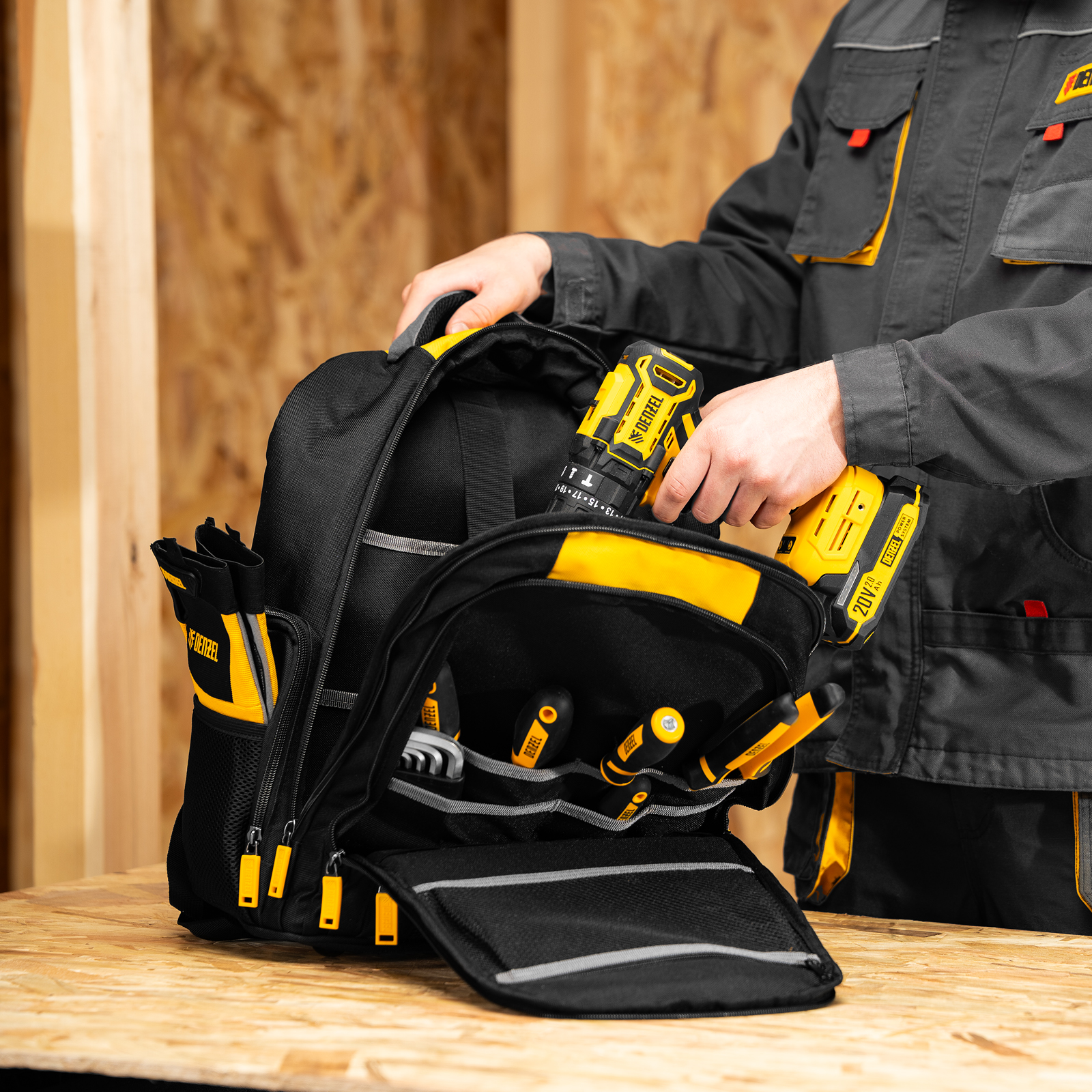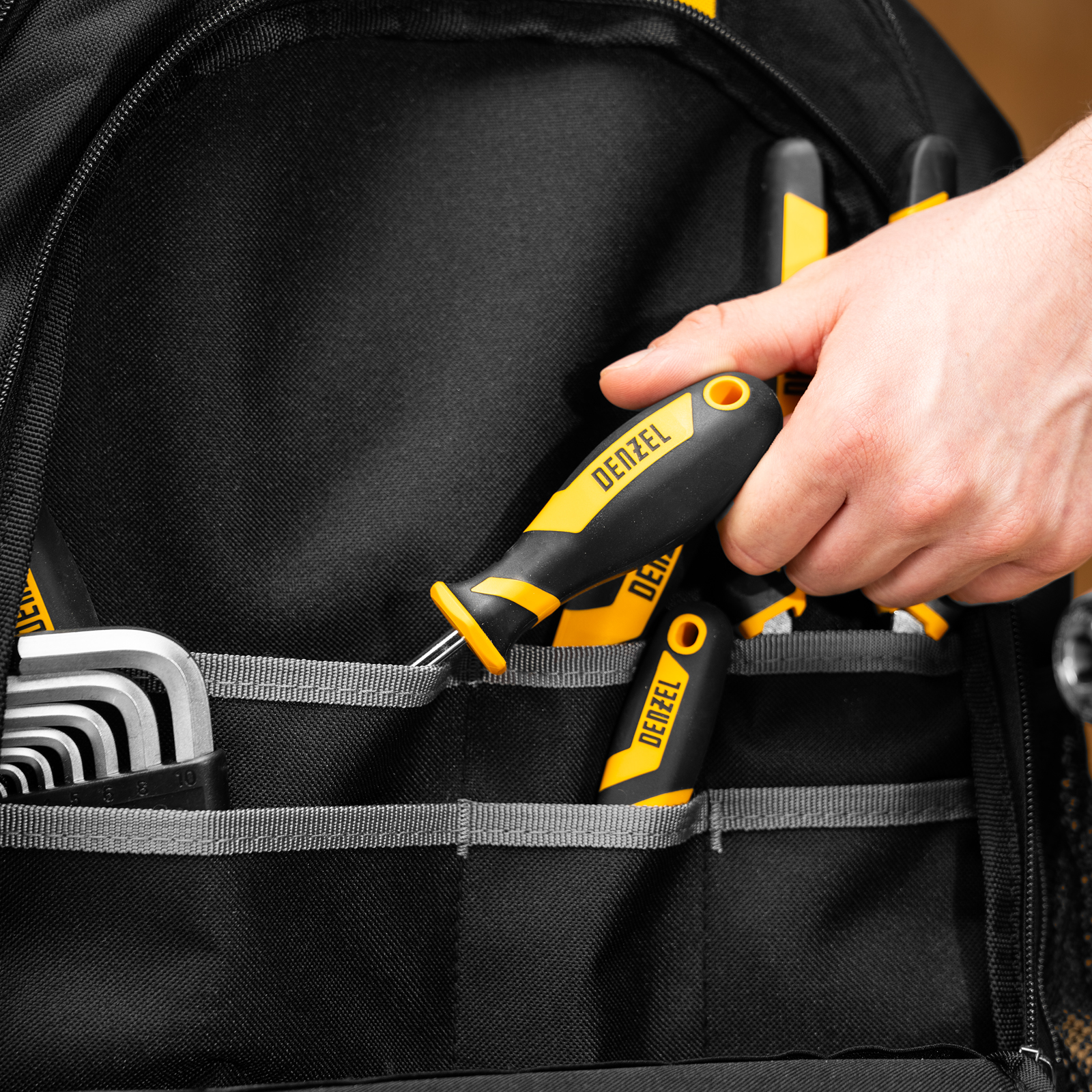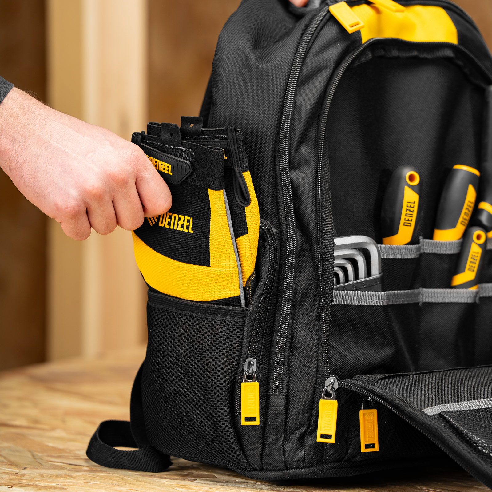Рюкзак Denzel 90296 размером 365 х 190 х 430 мм, с 3 отделениями и 26 карманами (в том числе сетчатыми), предназначен для размещения и транспортировки ручного инструмента. 3 секции позволяют организовать упорядоченное хранение всех необходимых предметов. Рюкзак пригодится выездному мастеру.