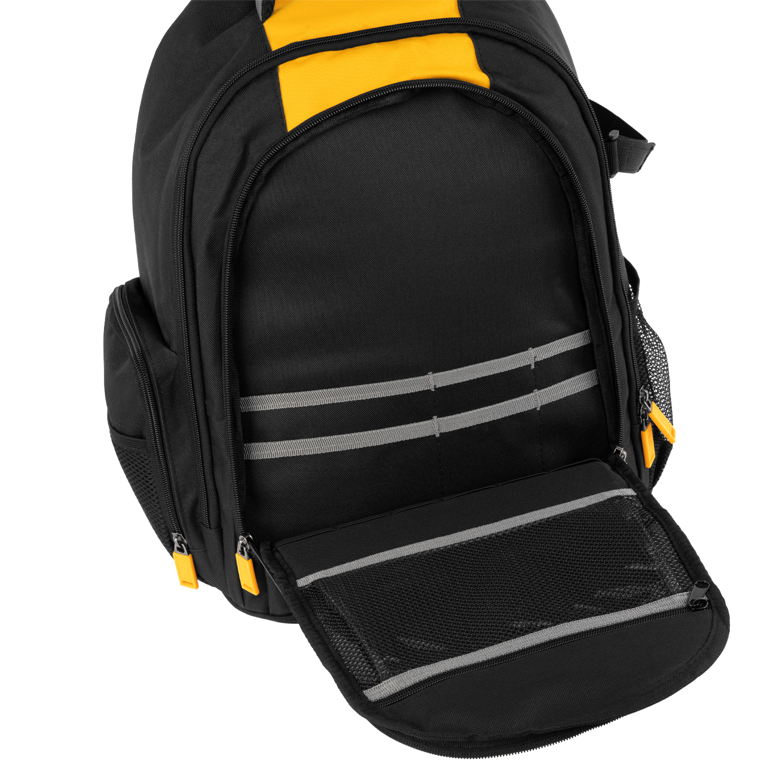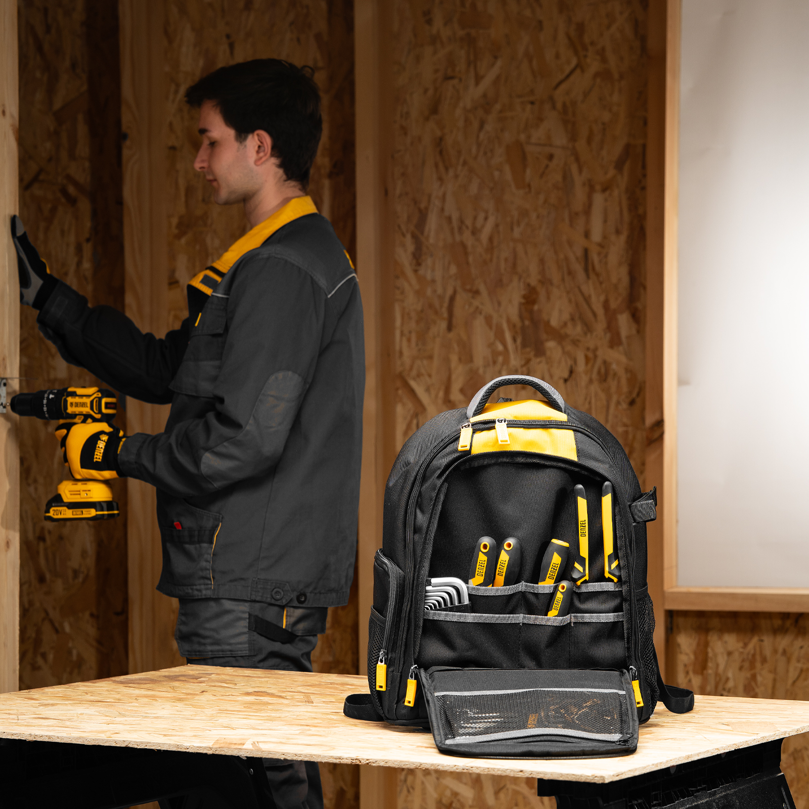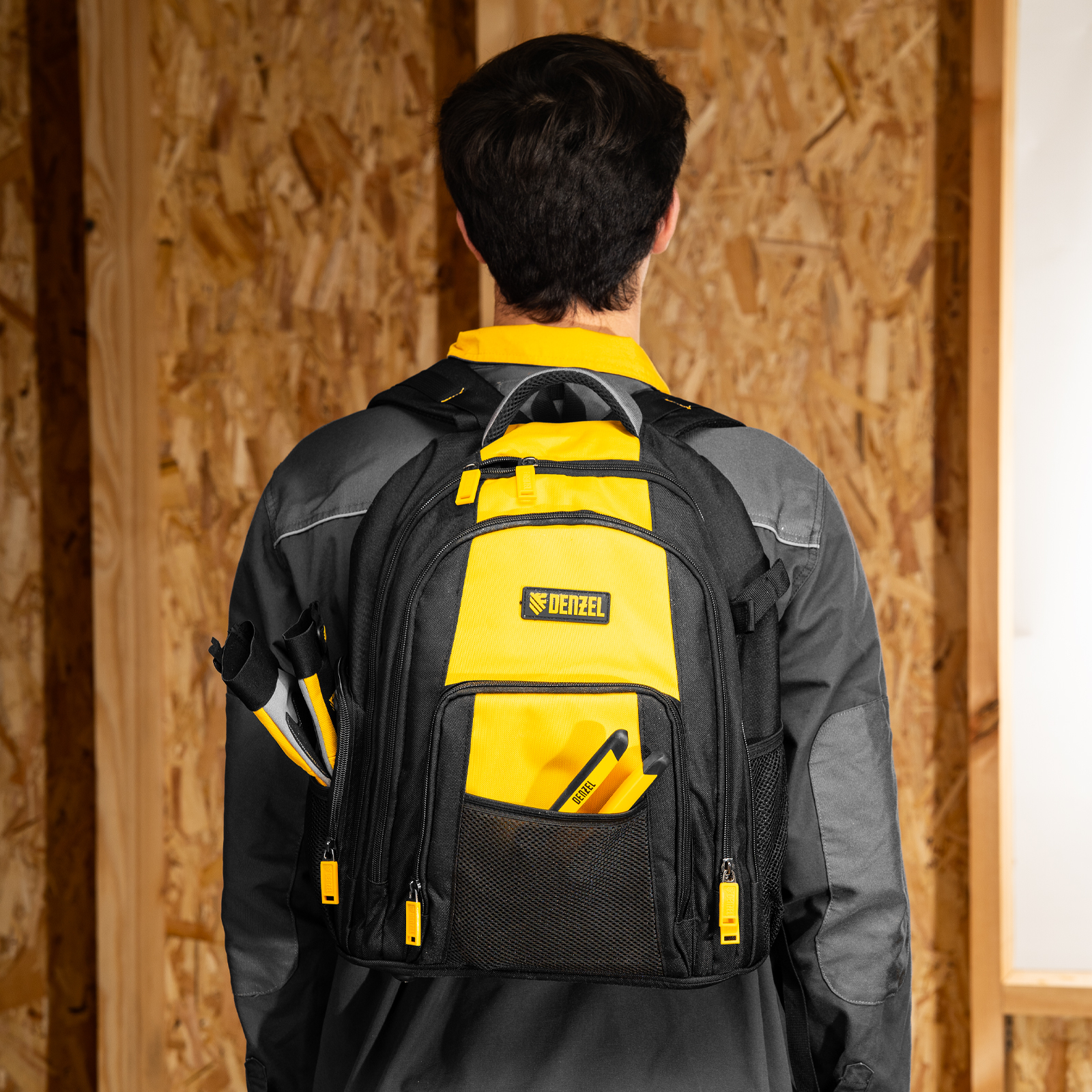 Рюкзак Denzel 90296 размером 365 х 190 х 430 мм, с 3 отделениями и 26 карманами (в том числе сетчатыми), предназначен для размещения и транспортировки ручного инструмента. 3 секции позволяют организовать упорядоченное хранение всех необходимых предметов. Рюкзак пригодится выездному мастеру.