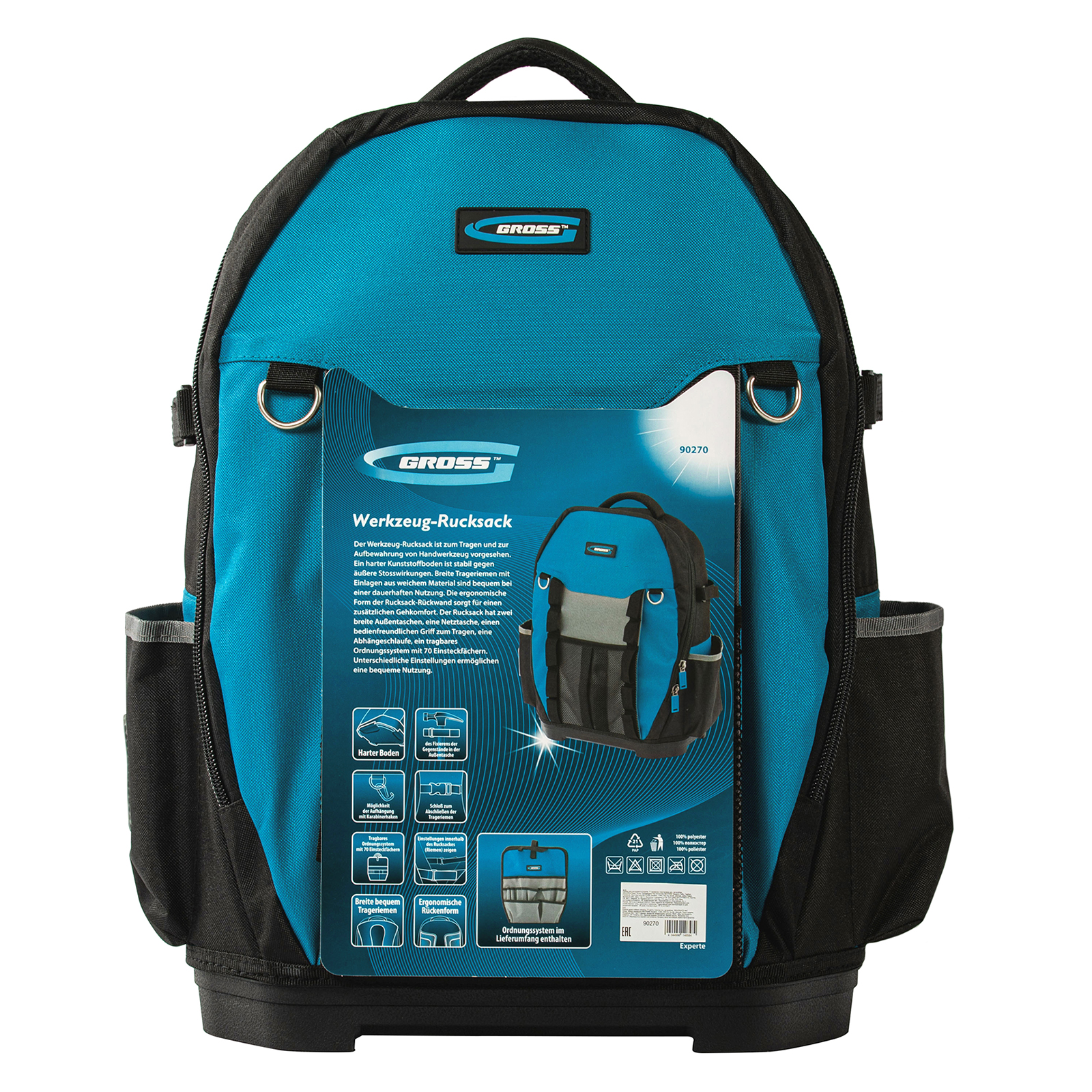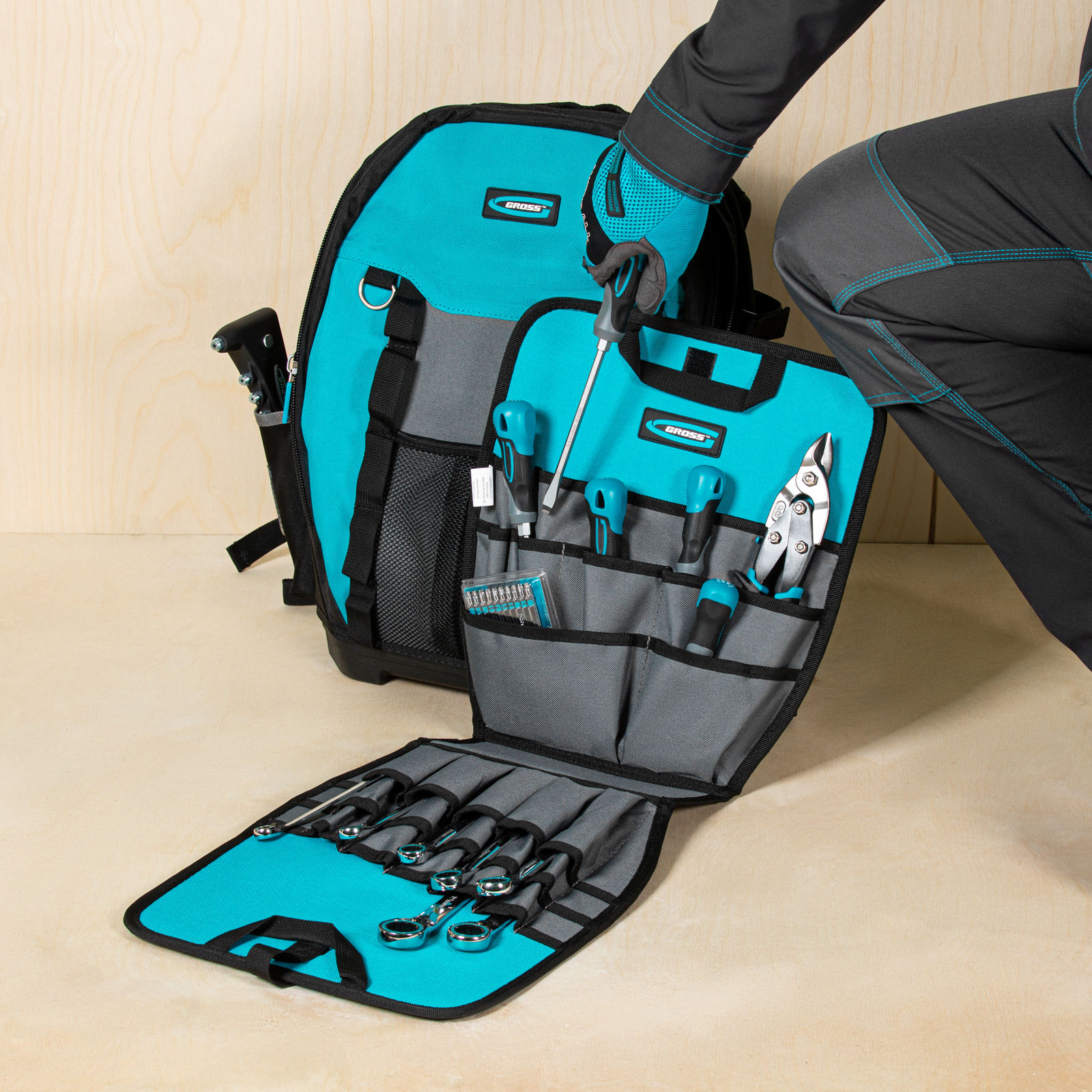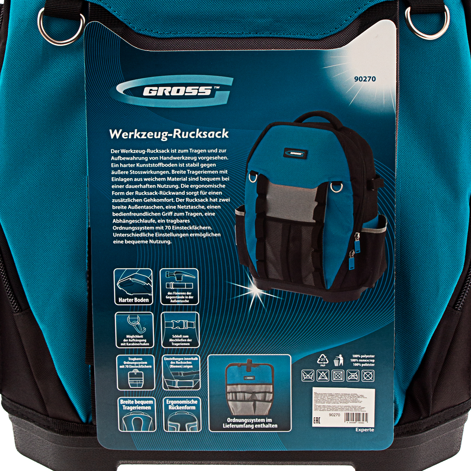 Рюкзак для инструмента Gross Experte 90270 габаритами 360 х 205 х 470 мм, с пластиковым дном и органайзером, имеет 77 карманов различной формы и размера, что позволяет максимально эффективно использовать его пространство. Предназначен для транспортировки и хранения мелкого и крупного инструмента. Органайзер с 70 карманами можно использовать отдельно, а для удобного размещения на рабочем месте предусмотрена специальная петля.