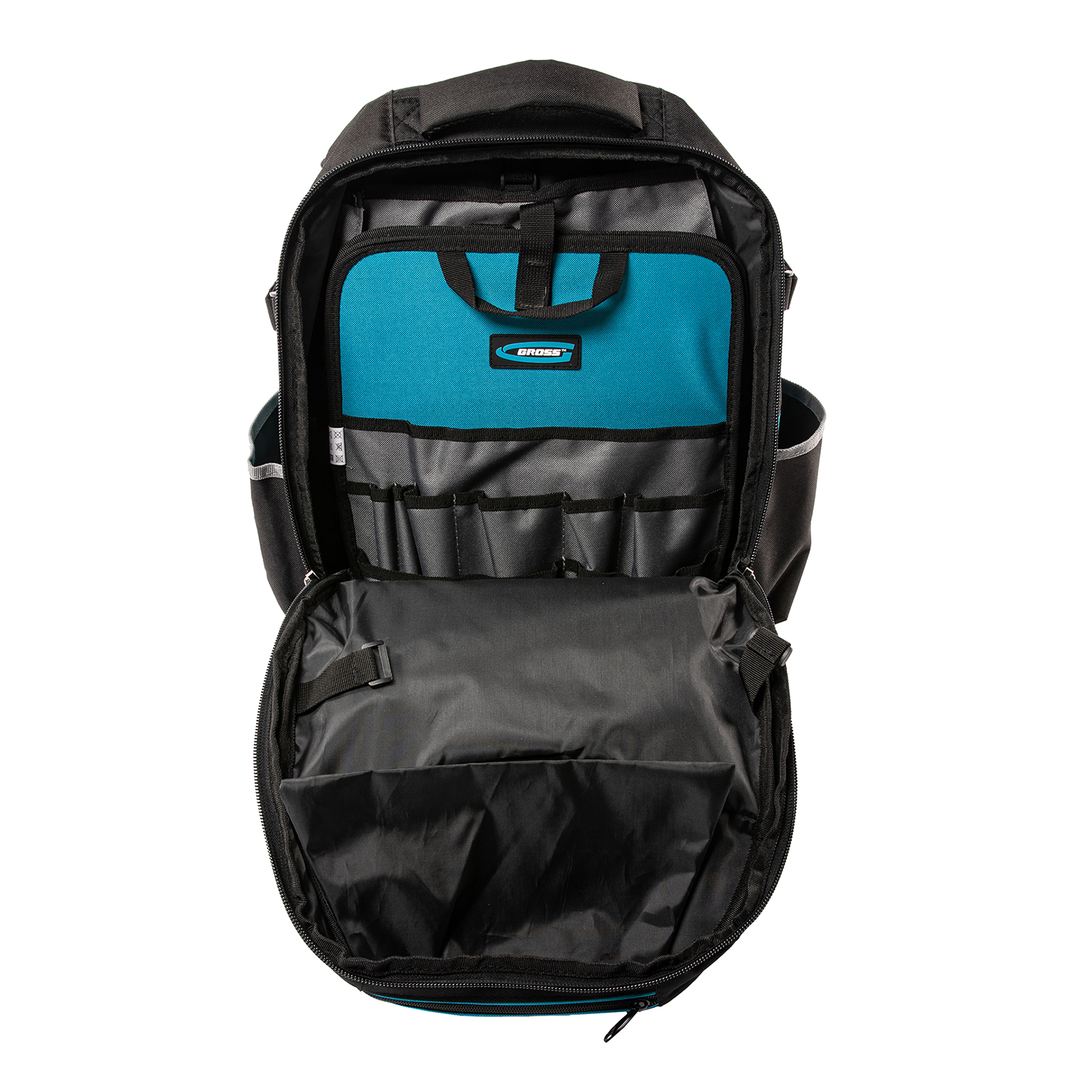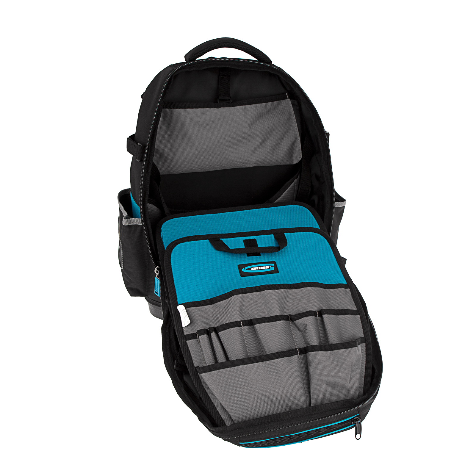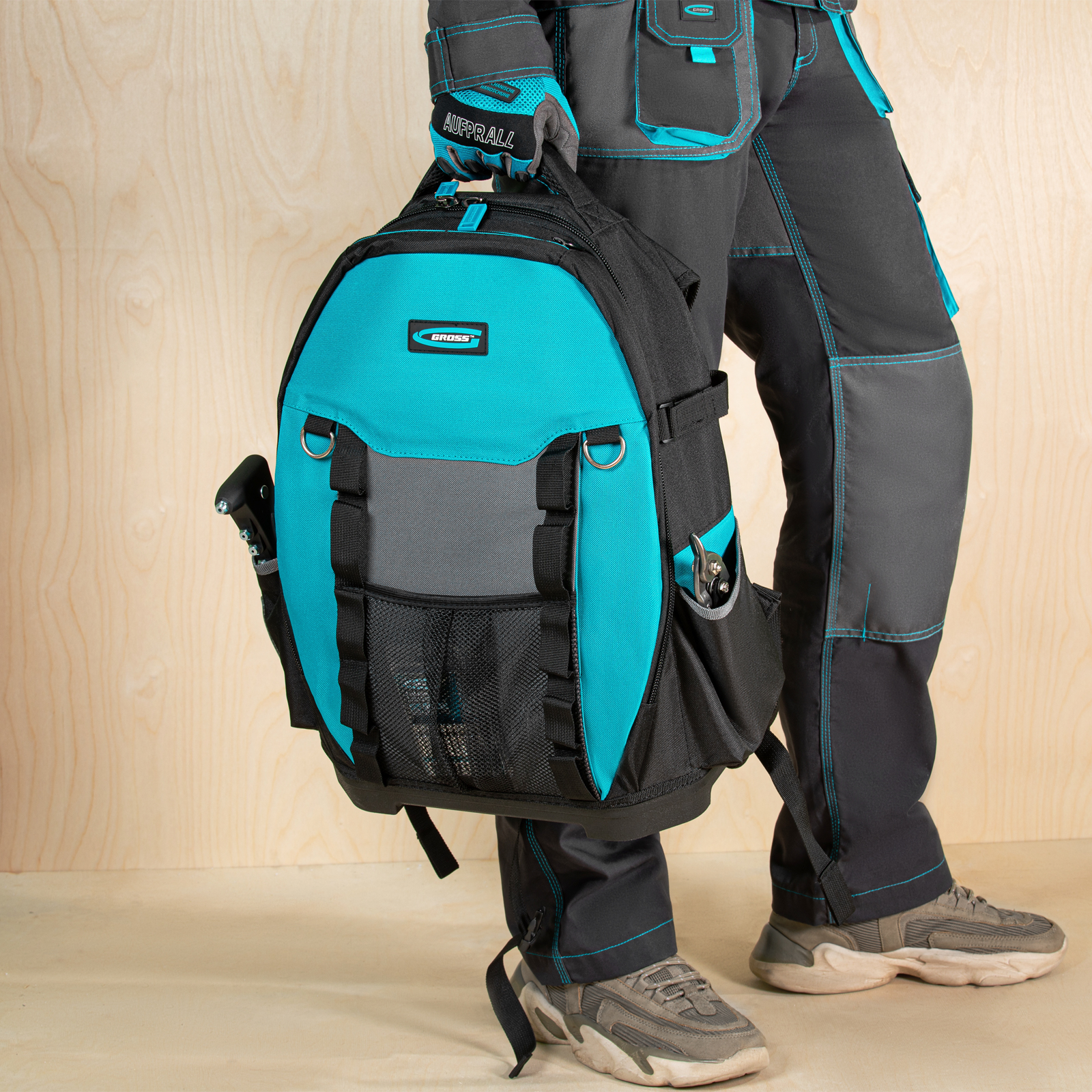Рюкзак для инструмента Gross Experte 90270 габаритами 360 х 205 х 470 мм, с пластиковым дном и органайзером, имеет 77 карманов различной формы и размера, что позволяет максимально эффективно использовать его пространство. Предназначен для транспортировки и хранения мелкого и крупного инструмента. Органайзер с 70 карманами можно использовать отдельно, а для удобного размещения на рабочем месте предусмотрена специальная петля.