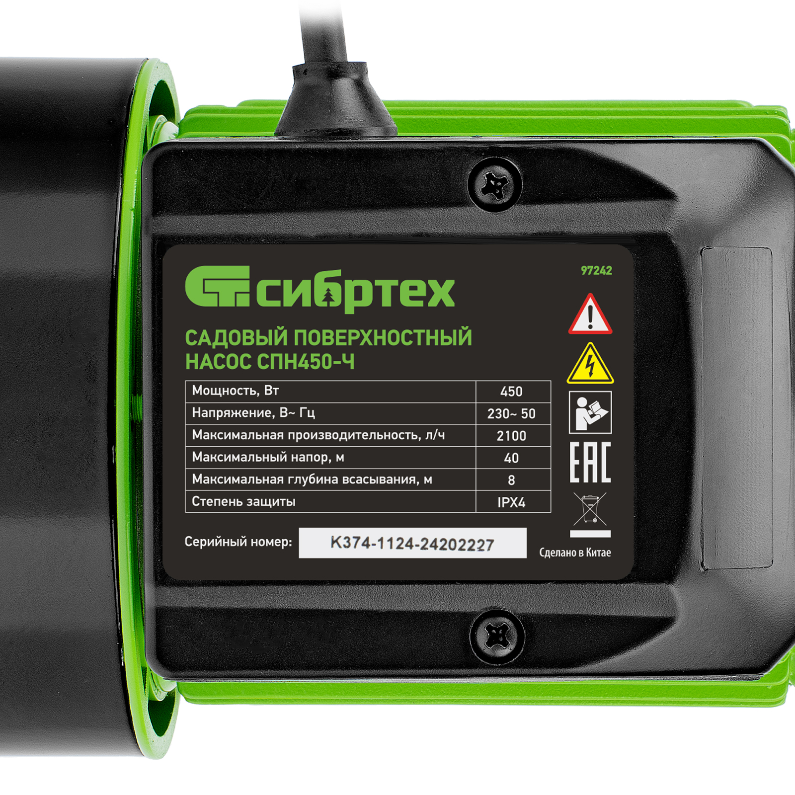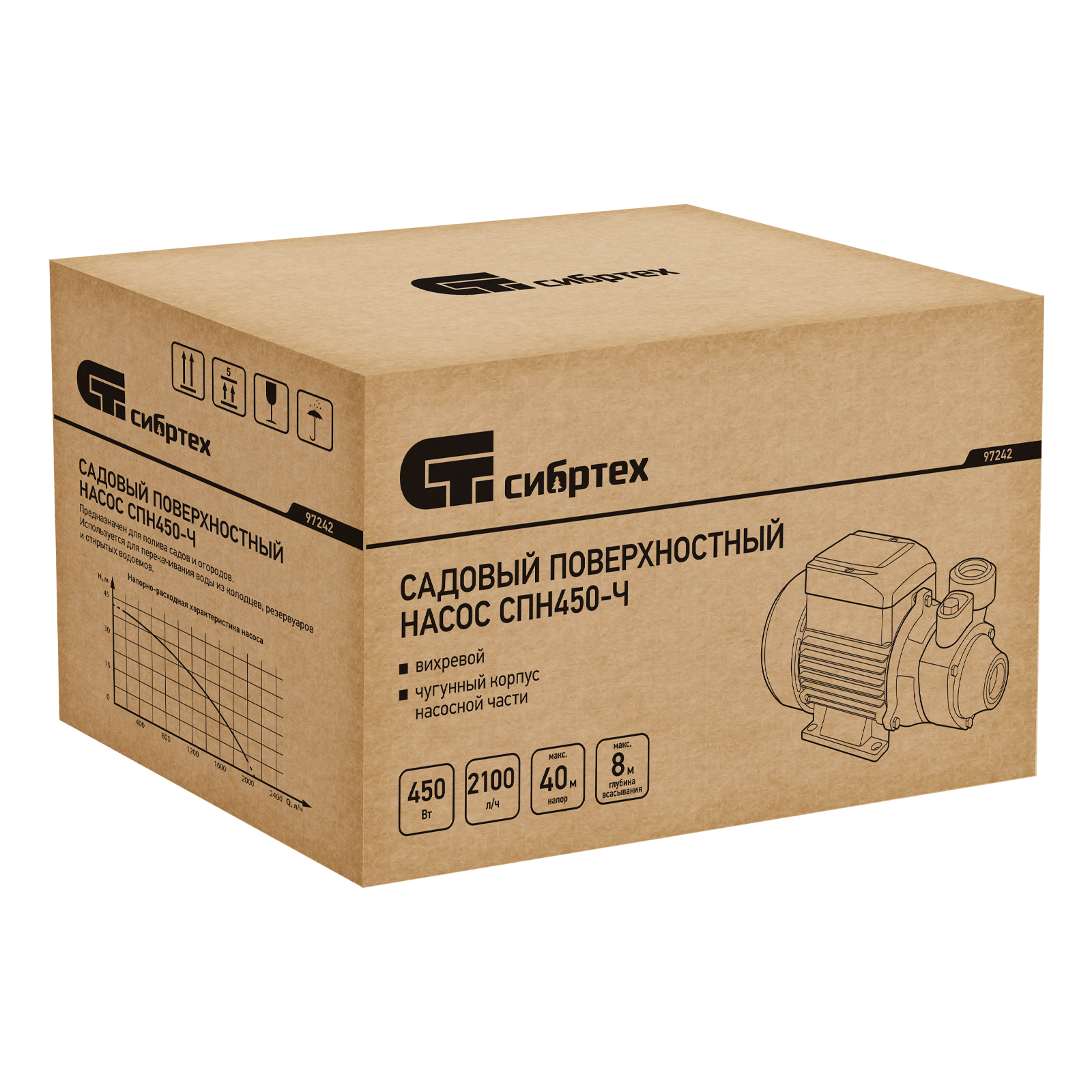Садовый поверхностный насос Сибртех СПН450-Ч 97242 мощностью 450 Вт и производительностью 2100 л/ч, с чугунным корпусом насосной части, создает напор до 40 м и применяется для организации систем полива и водоснабжения в загородном доме. Способен поднимать чистую воду с глубины до 8 м из водоемов, резервуаров и колодцев. Обеспечивает стабильный напор даже на верхних этажах дома, а скорости перекачки достаточно для организации нескольких точек водоразбора.