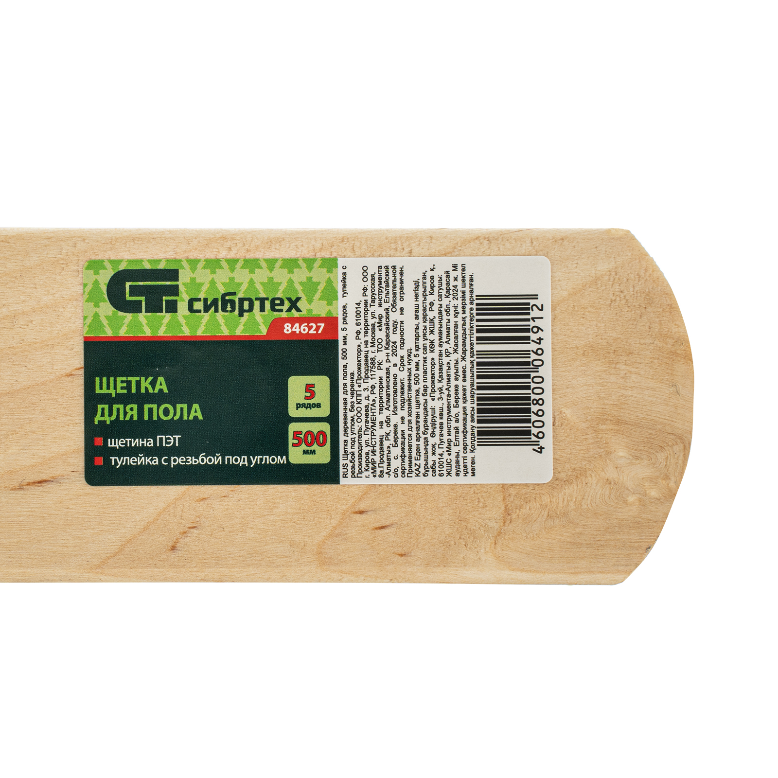 <p>Деревянная щетка для пола Сибртех 84627 длиной 500 мм, с тулейкой с резьбой под углом, без черенка, имеет густую пятирядную щетину и предназначена для уборки как внутри, так и вне помещений. Тщательно сметает пыль и мусор с пола, а также листву и мусор с дорожек, площадок, тротуаров и лестниц. Рабочая часть длиной 500 мм удобна для уборки участков большой площади. Черенок приобретается отдельно, рекомендуемая модель — 68416.</p><h2>Преимущества</h2><ul><li>Прочность и долговечность — основание выполнено из твердой древесины, синтетическая щетина устойчива к истиранию.</li><li>Надежность — пучки щетины крепко зафиксированы и не выпадают из колодки во время уборки.</li><li>Эргономичность — тулейка, расположенная под углом, обеспечивает удобное положение черенка.</li><li>Удобная фиксация черенка — тулейка имеет резьбовое соединение.</li></ul>