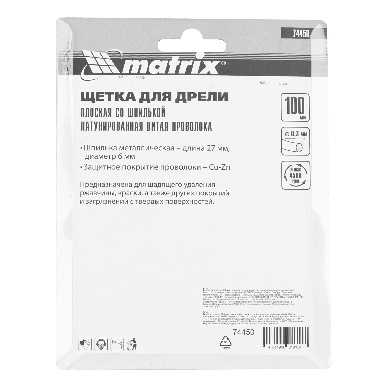 Плоская щетка для дрели Matrix 74450 диаметром 100 мм, со шпилькой и щетиной из латунированной витой проволоки, предназначена для бережной очистки металлических, деревянных, пластиковых поверхностей от загрязнений, старых лакокрасочных материалов и ржавчины. Витая проволока диаметром 0,3 мм проникает в труднодоступные места: пазы, углы, изгибы, узкие участки. Насадку применяют для придания поверхности нужной шероховатости или подчеркивания структуры материала. Хвостовик диаметром 6 мм устанавливается в патрон электродрели, способной работать на рекомендуемой скорости 4500 об/мин. Во время работы следует использовать защитные очки, респиратор, наушники, спецодежду и обувь.