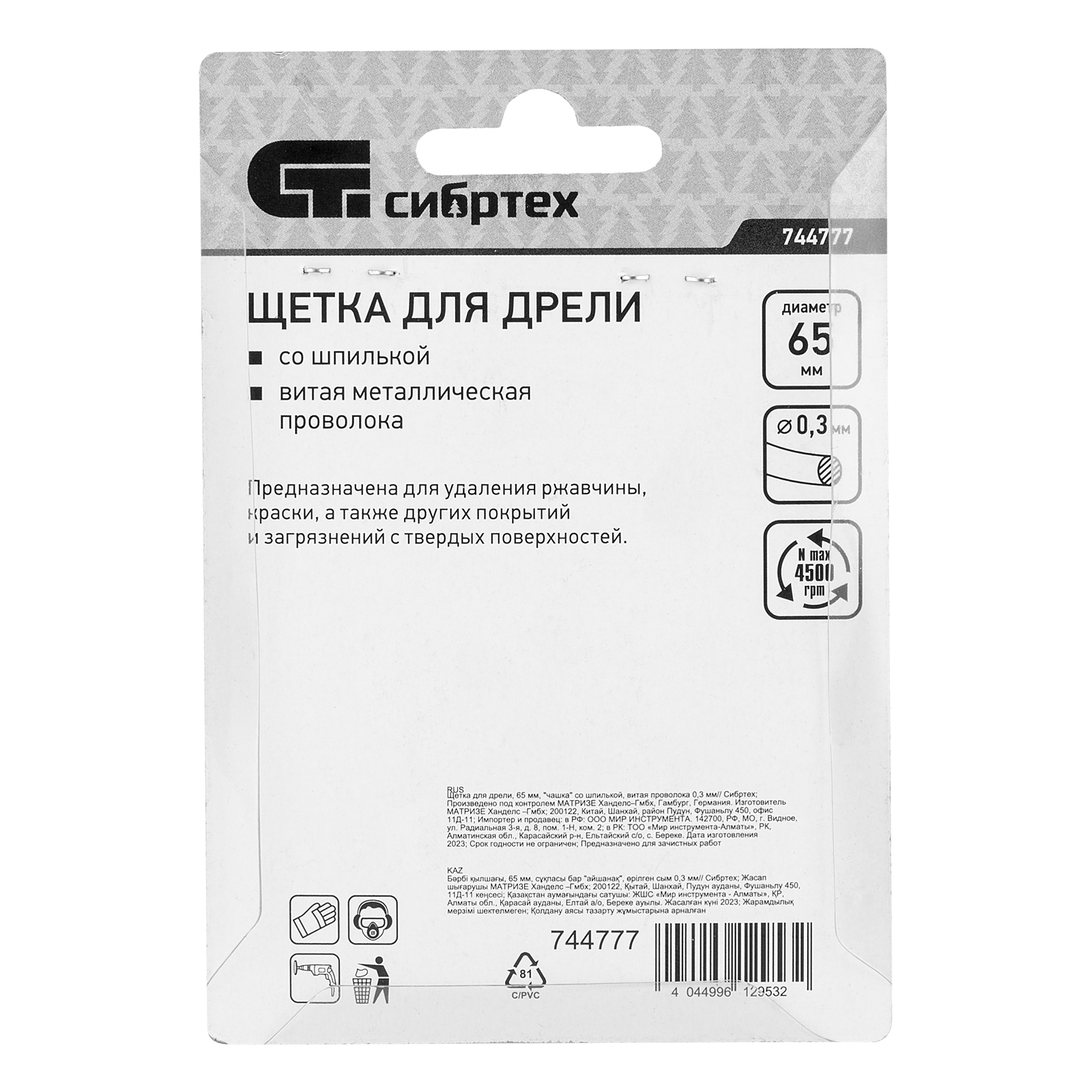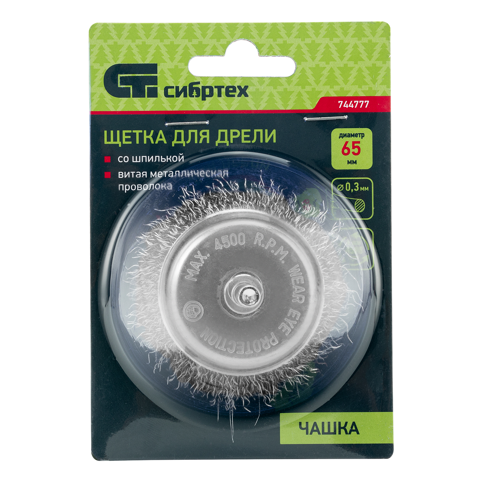 Щетка для дрели «чашка» Сибртех 744777 диаметром 65 мм, со шпилькой и щетиной из витой проволоки 0,3 мм, предназначена для щадящей обработки значительных по площади металлических, деревянных и пластиковых поверхностей — удаления загрязнений, остатков краски и лака, придания шероховатости или подчеркивания структуры материала. Насадка с хвостовиком 6 мм устанавливается в патрон электродрели, поддерживающей работу со скоростью 4500 об/мин. Во время работы с инструментом обязательно использование защитной одежды и обуви, очков, респиратора и наушников. Щетку применяют в профессиональной сфере и в быту.