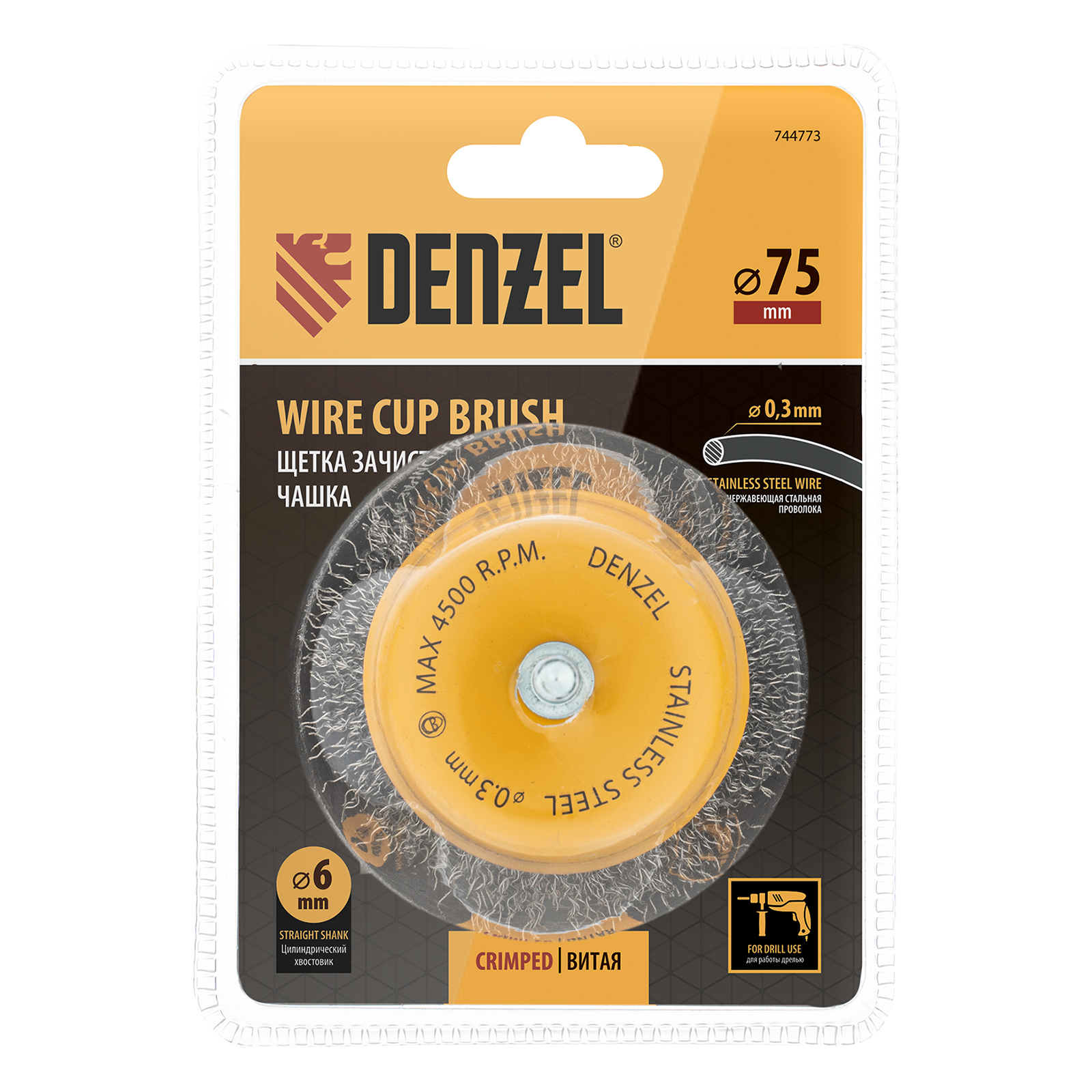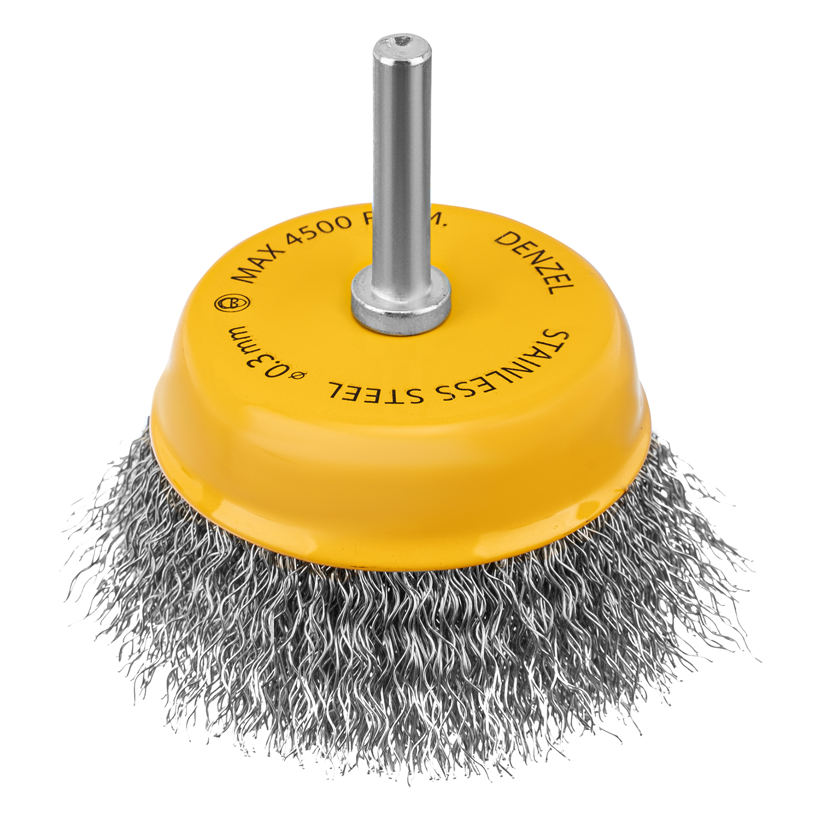 Щетка для дрели «Чашка» Denzel 744773 диаметром 75 мм, со шпилькой и щетиной из нержавеющей витой проволоки, используется для щадящей обработки плоских твердых поверхностей из металла, древесины, пластика, идеально подходит для нержавеющей стали. Оптимальна для снятия тонкого слоя старой краски, ржавчины, удаления загрязнений. Имеет хвостовик диаметром 6 мм и устанавливается в патрон дрели или прямошлифовальной машины (ПШМ).