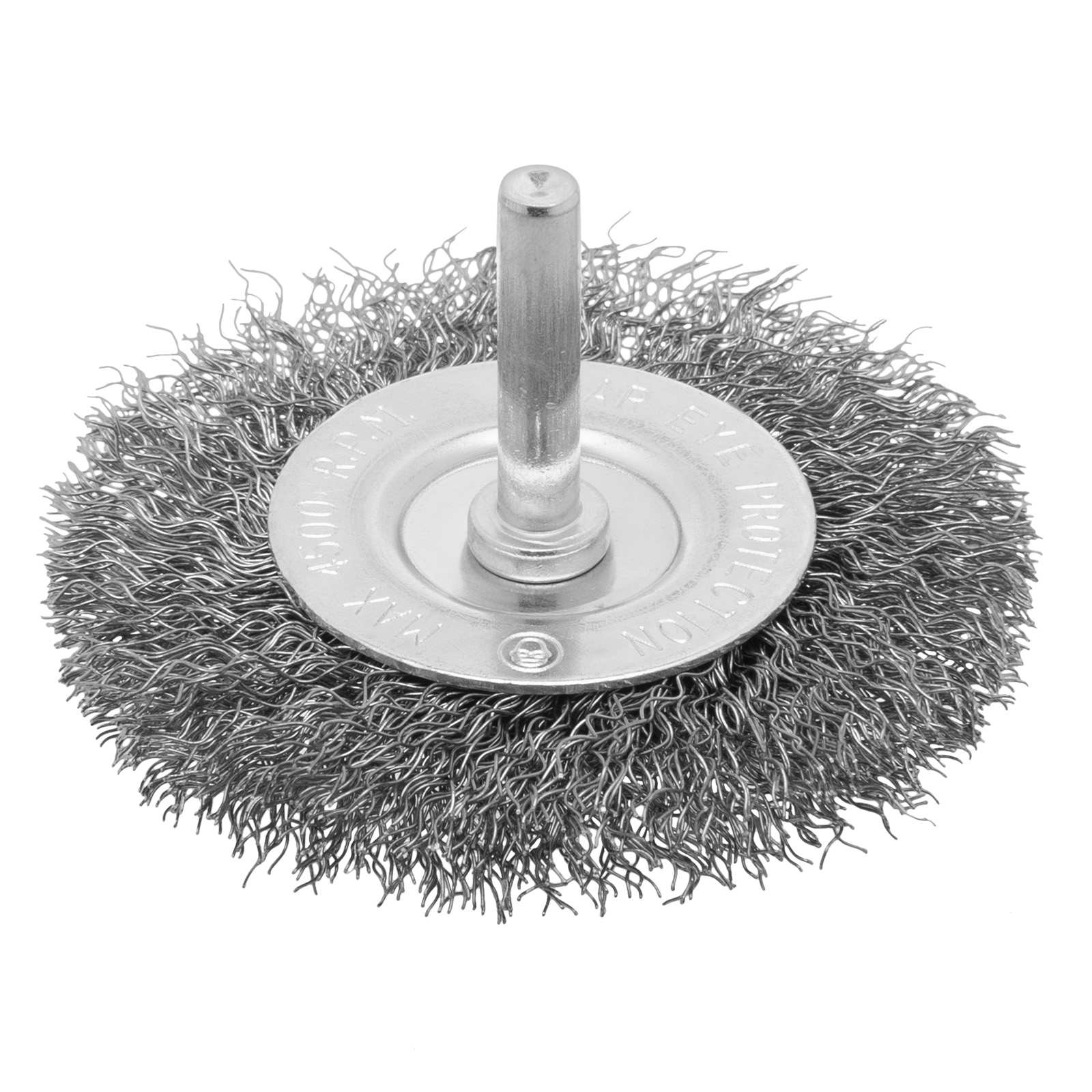 Плоская щетка для дрели Сибртех 744487 диаметром 75 мм, со шпилькой и щетиной из витой проволоки 0,3 мм, используется для щадящей обработки металлических, деревянных и пластиковых поверхностей. Удаляет загрязнения, ржавчину, старые лакокрасочные покрытия. Благодаря плоской форме щетка идеально подходит для очистки труднодоступных мест, пазов, изгибов, внутренних углов. Хвостовик диаметром 6 мм устанавливается в патрон дрели. Рекомендуемая скорость вращения 4500 об/мин. Во время работы следует использовать средства индивидуальной защиты. Щетку применяют во время строительства, ремонта, а также в быту.