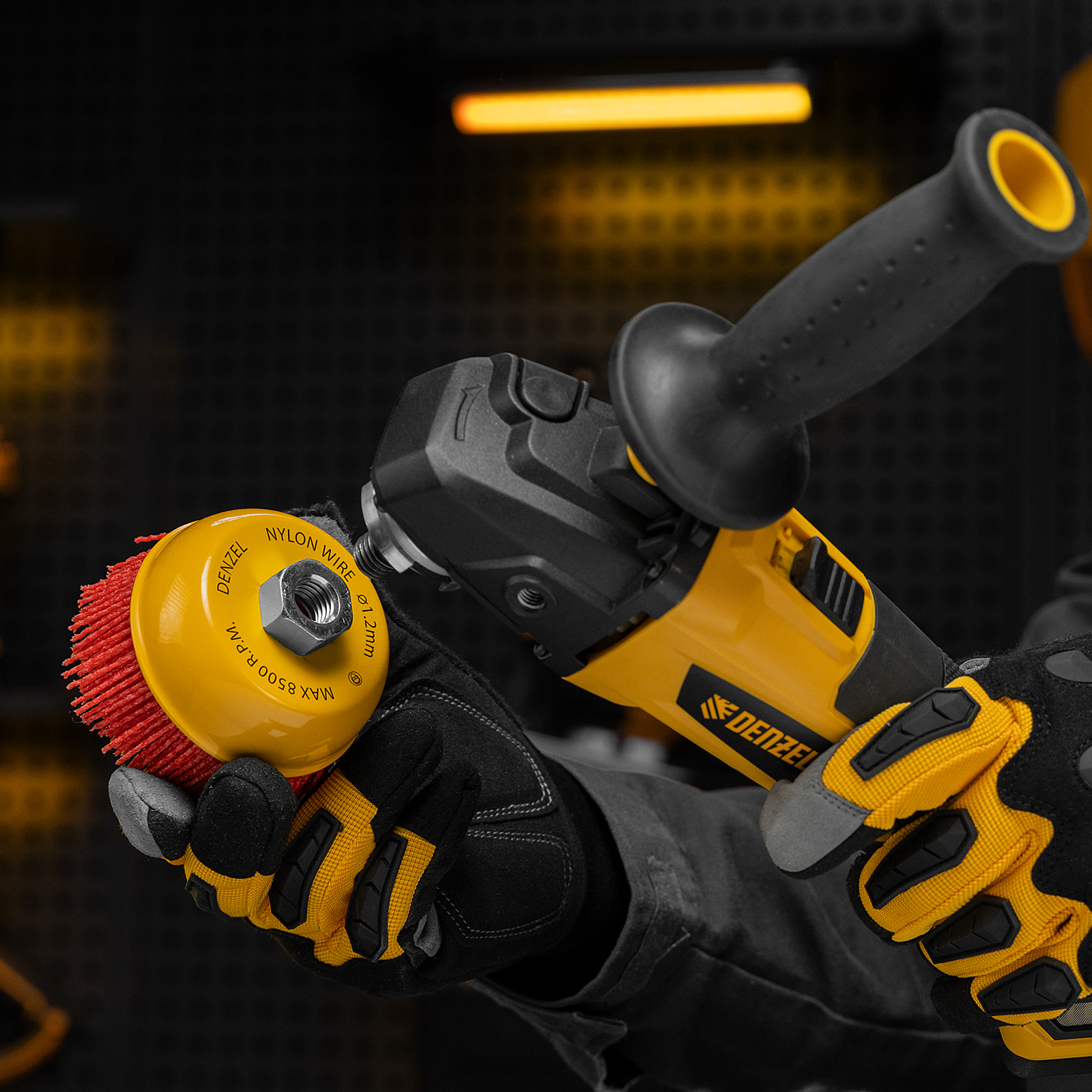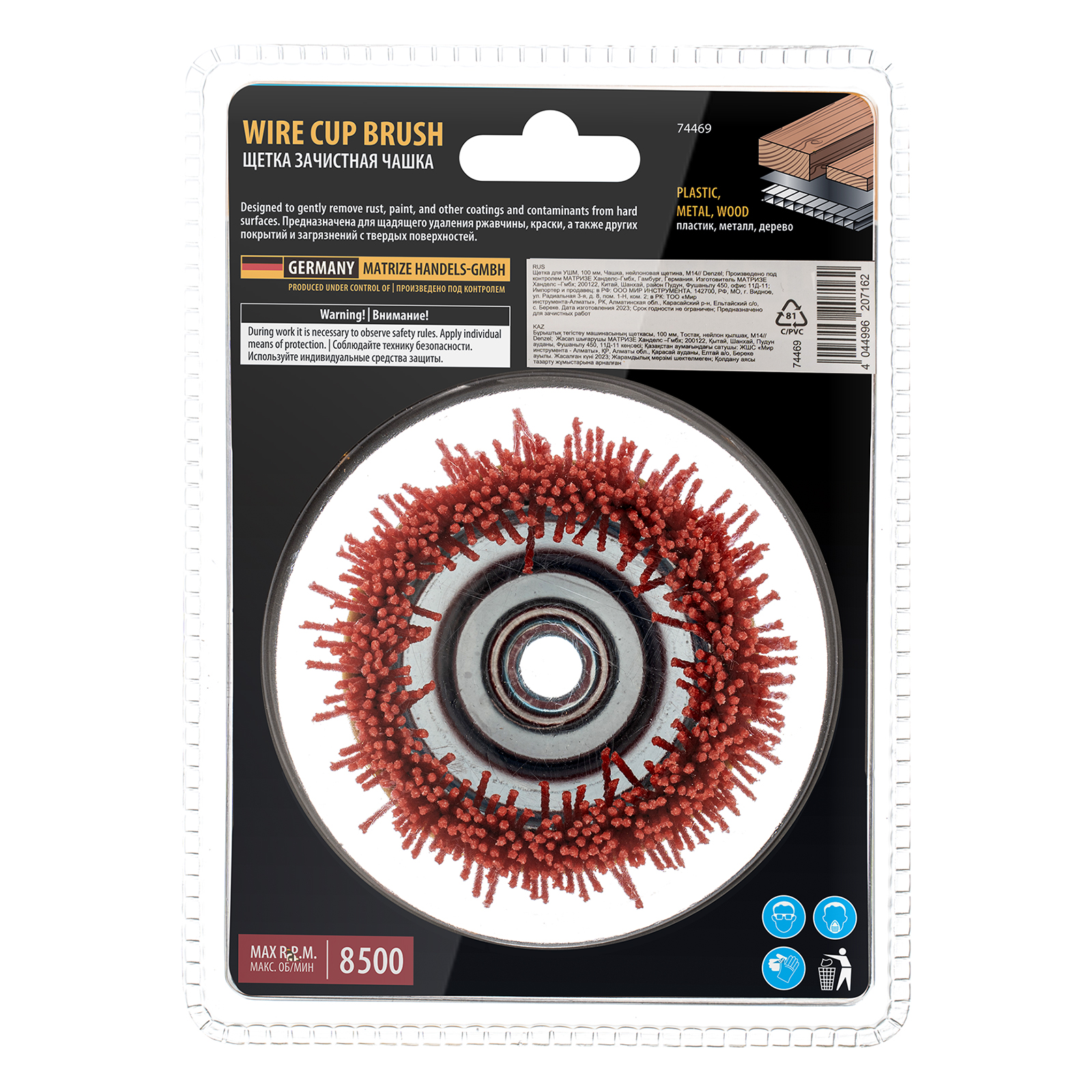 Щетка Denzel 74469 в форме чашки диаметром 100 мм, с нейлоновой щетиной, устанавливается на вал УШМ при помощи гайки М14. Предназначена для выполнения шлифовальных работ. Щетина изготовлена из высококачественного нейлона с нанесенным абразивом из оксида алюминия. удаления загрязнений, краски, пятен ржавчины с твердых поверхностей. Позволяет придать шероховатость поверхности, подходит для браширования древесины. Насадка удобна для обработки плоских деталей большой площади.