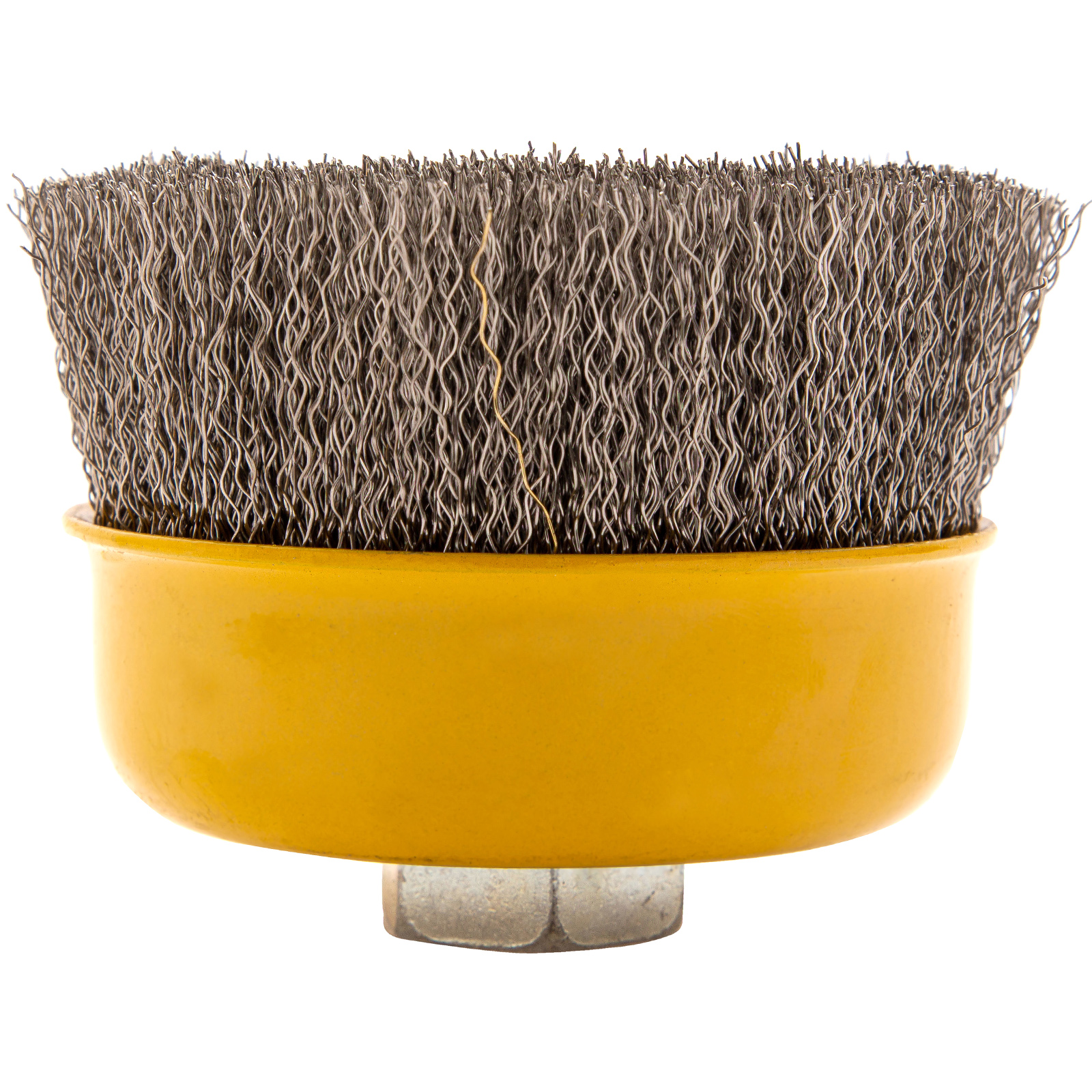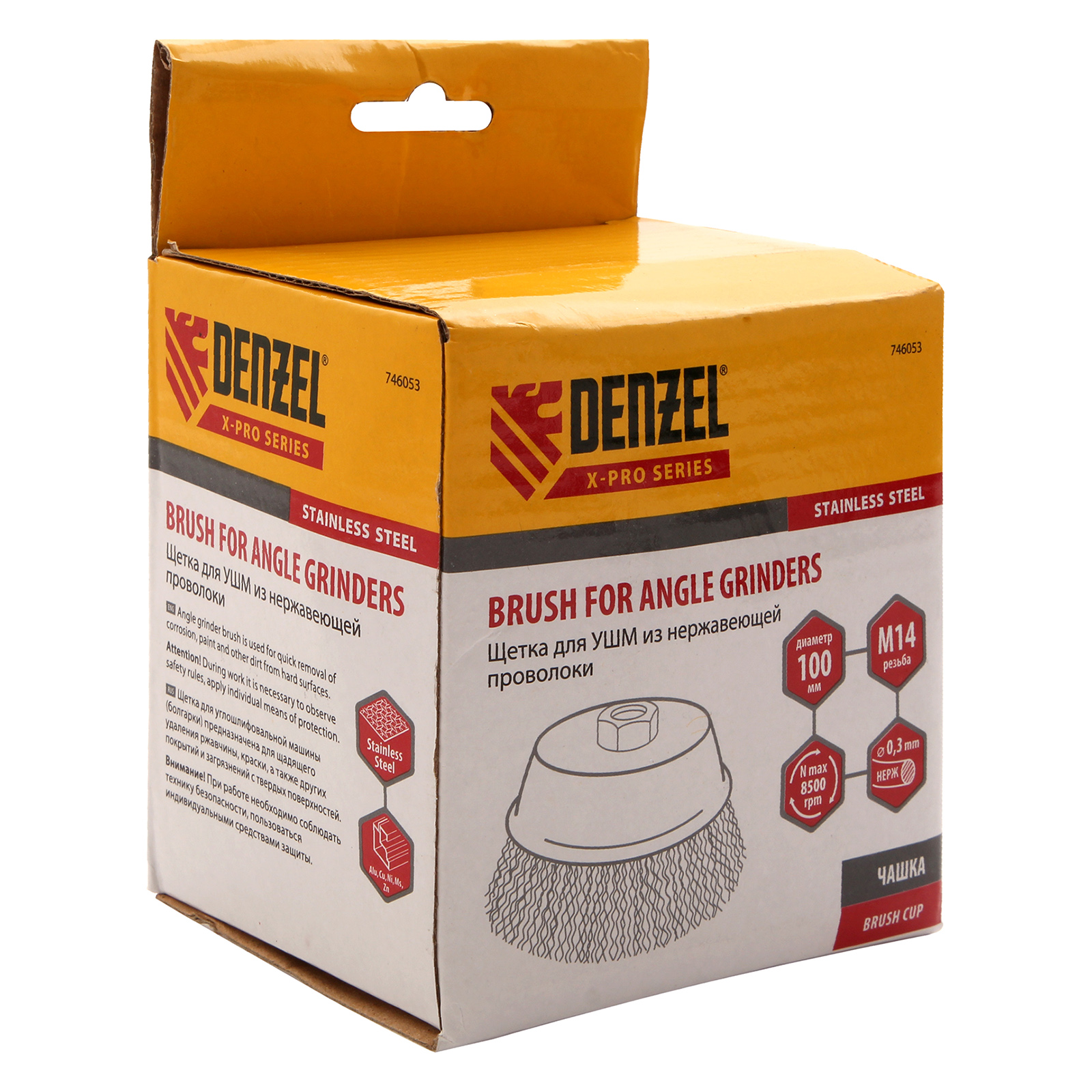Щетка для УШМ «Чашка» Denzel 746053 с гайкой М14, диаметром 100 мм, с щетиной из витой нержавеющей проволоки диаметром 0,3 мм, позволяет быстро и аккуратно очистить металлическую, деревянную или пластиковую поверхность от незначительных загрязнений и ржавчины, а также удалить остатки лакокрасочных материалов, сделать поверхность шероховатой или матовой. Насадка предназначена для очистки плоских участков большой площади. Подходит для обработки нержавеющей стали.