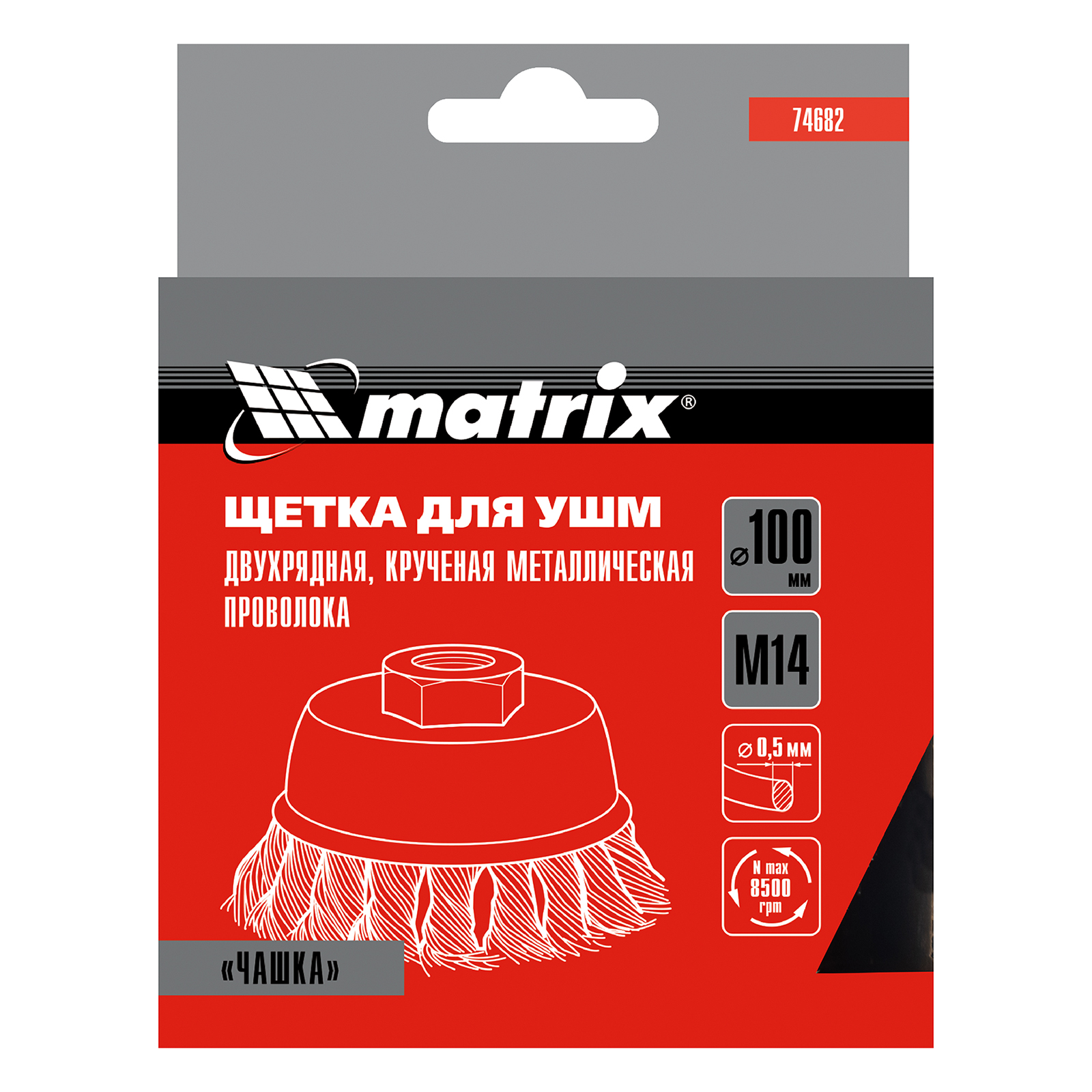Двухрядная щетка Matrix «Чашка» 74682 диаметром 100 мм, с щетиной из крученой проволоки толщиной 0,5 мм, устанавливается на вал углошлифовальной машины с помощью гайки М14. Рекомендованная максимальная скорость вращения — до 8500 об/мин. Оснастка оптимальна для грубой (черновой) обработки: снятия старого слоя лакокрасочного покрытия и ржавчины, удаления загрязнений, зачистки сварных швов. Эффективно справляется с зачисткой больших поверхностей, подходит для выполнения работ повышенной сложности.